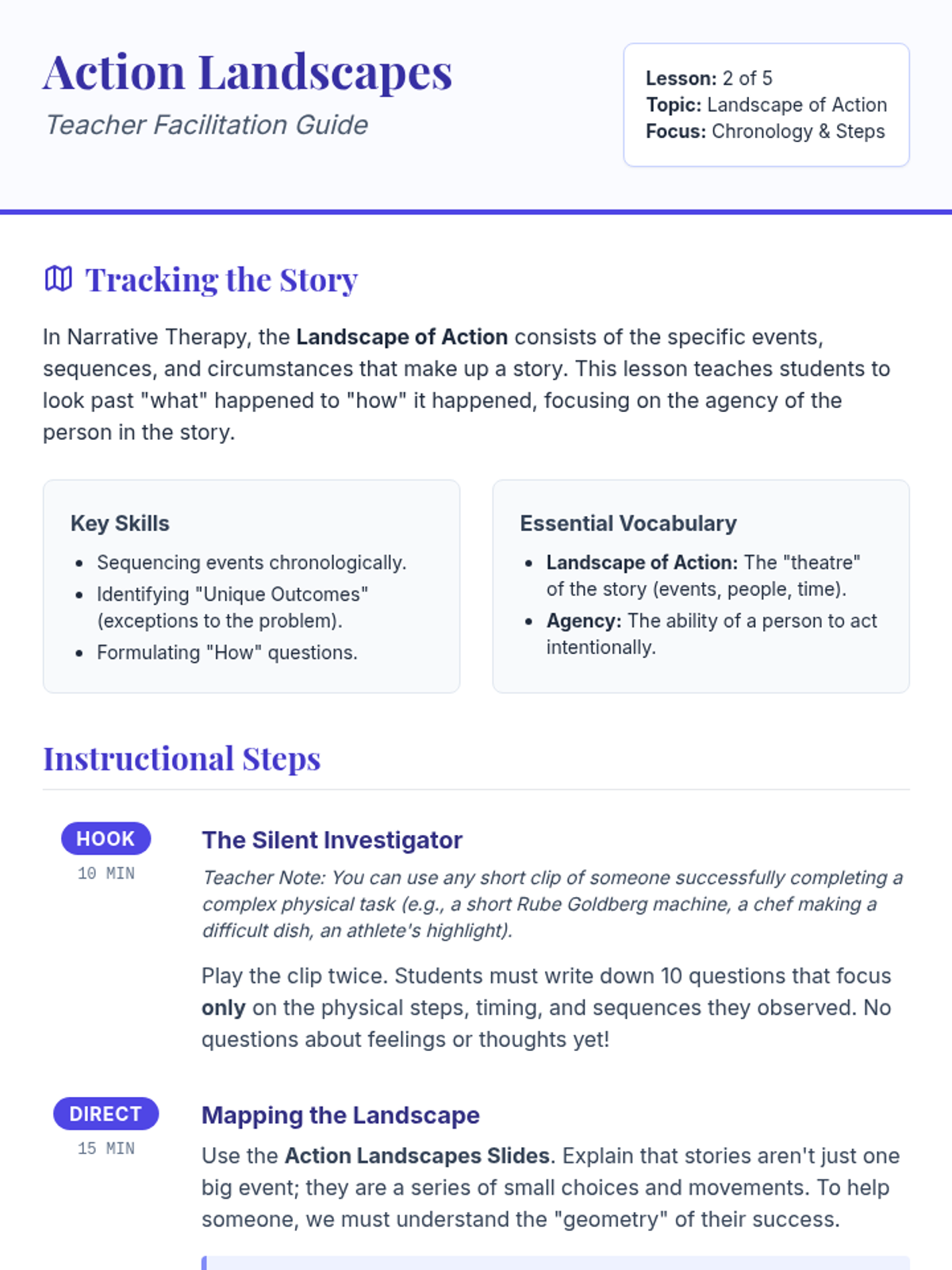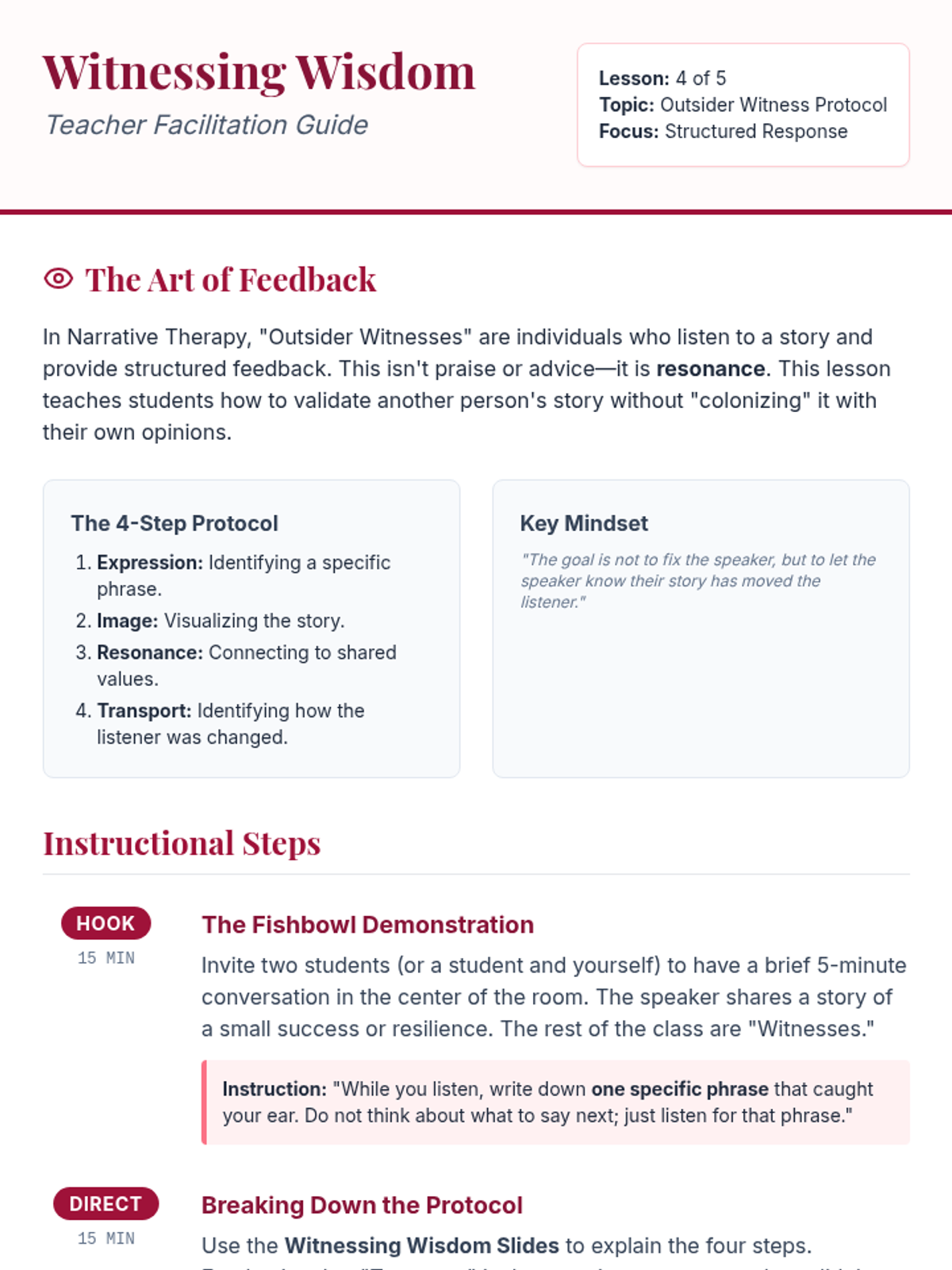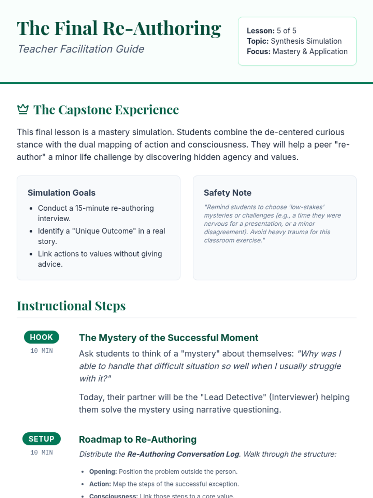 A comprehensive sequence for 11th-grade students to master Narrative Therapy questioning techniques, focusing on the de-centered stance, Landscape of Action/Consciousness, and Outsider Witness protocols. Students develop interpersonal skills to help peers uncover hidden strengths and resilience in their own life stories.