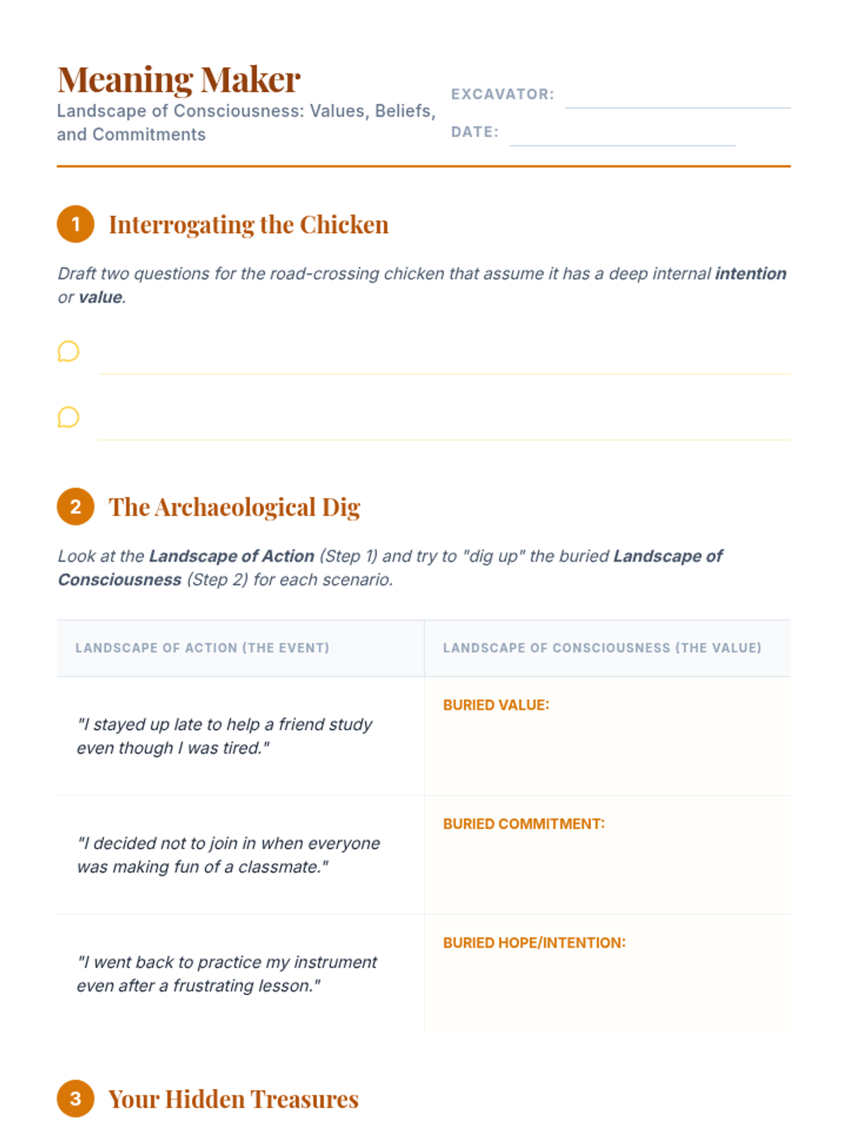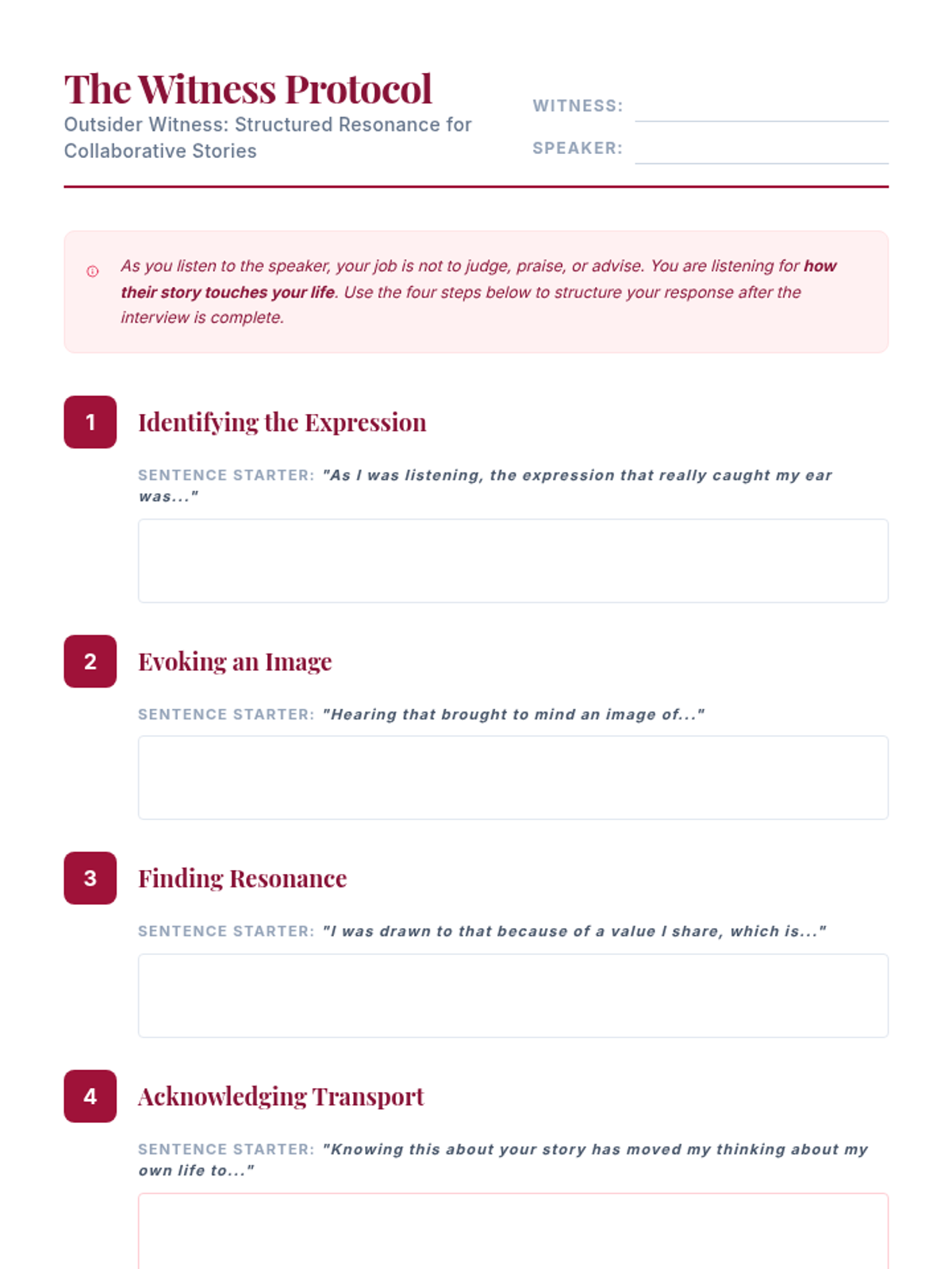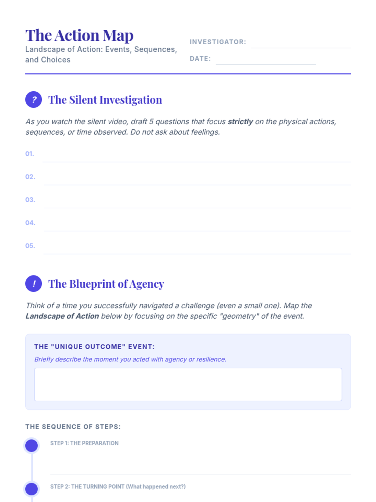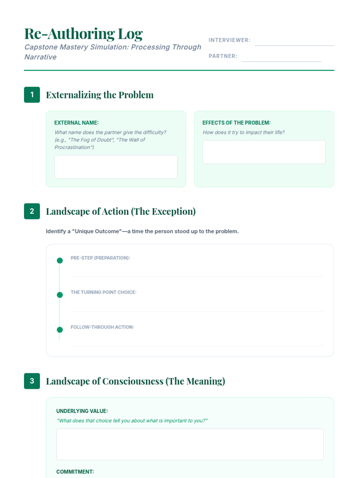 A comprehensive sequence for 11th-grade students to master Narrative Therapy questioning techniques, focusing on the de-centered stance, Landscape of Action/Consciousness, and Outsider Witness protocols. Students develop interpersonal skills to help peers uncover hidden strengths and resilience in their own life stories.