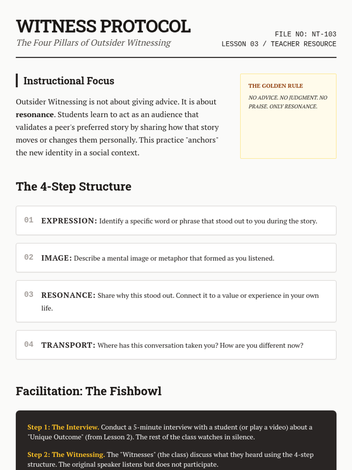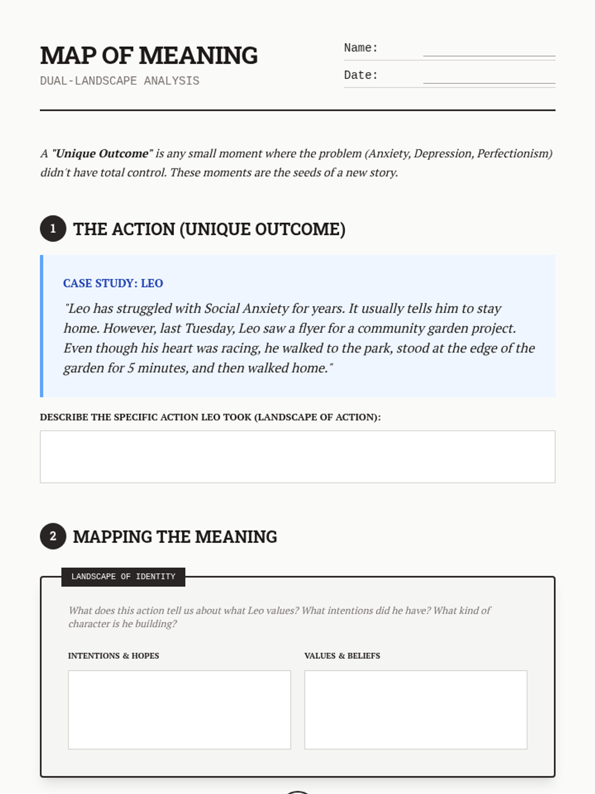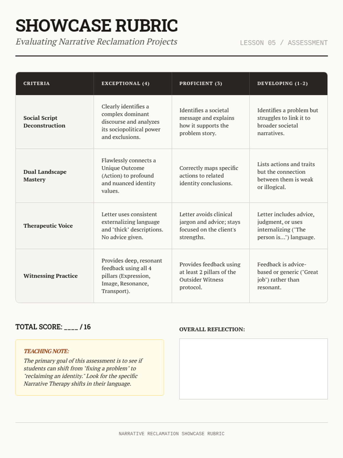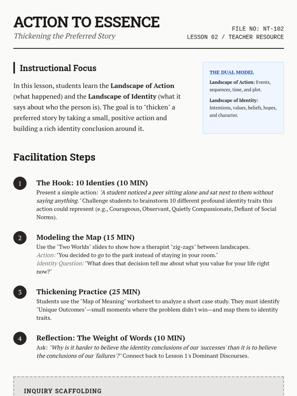 This sequence explores how societal narratives shape personal identity. Students learn to deconstruct dominant cultural 'scripts', utilize Narrative Therapy frameworks like the Landscape of Action/Identity, and practice Outsider Witnessing to formalize new, preferred stories of agency and resilience.