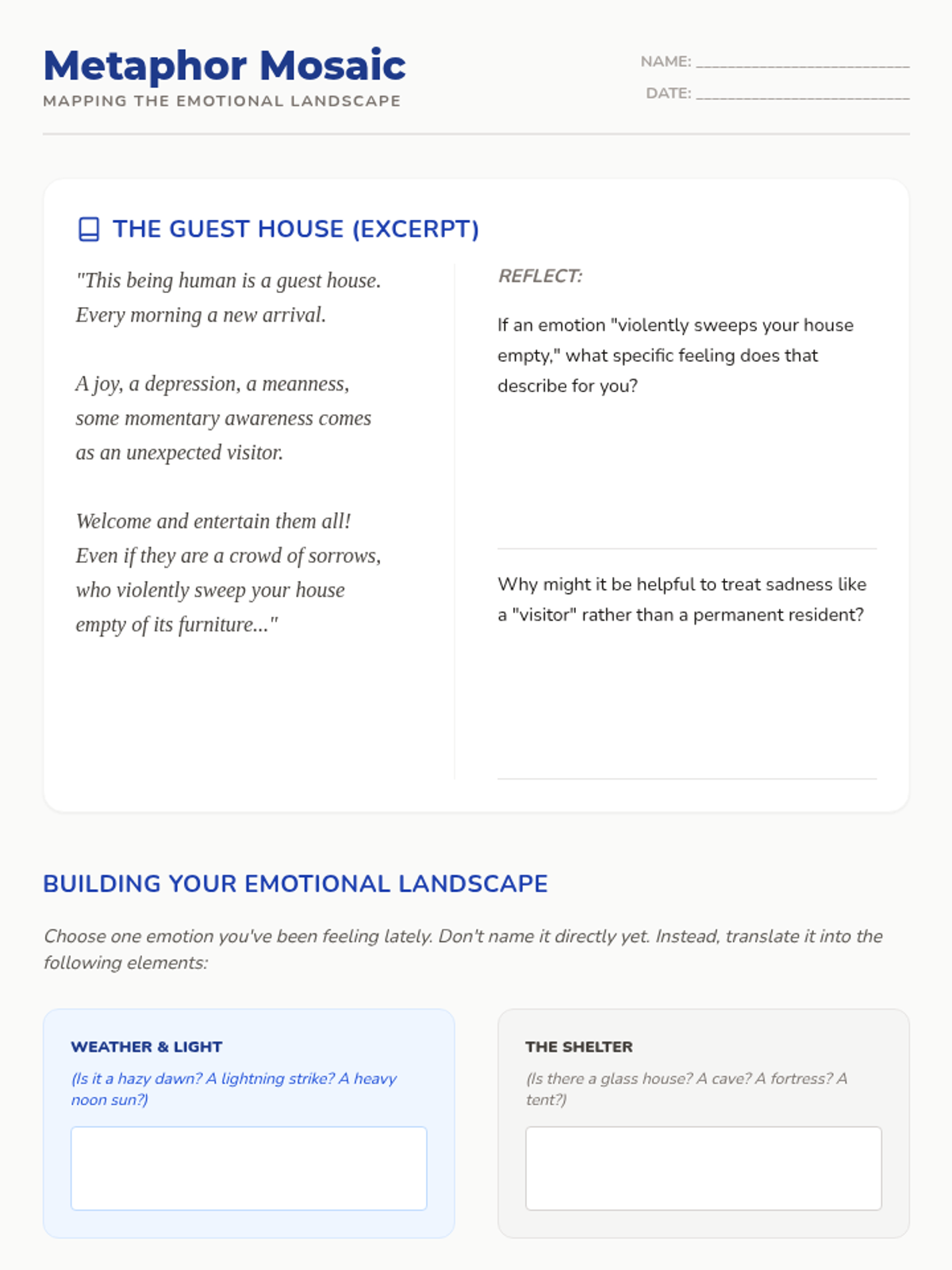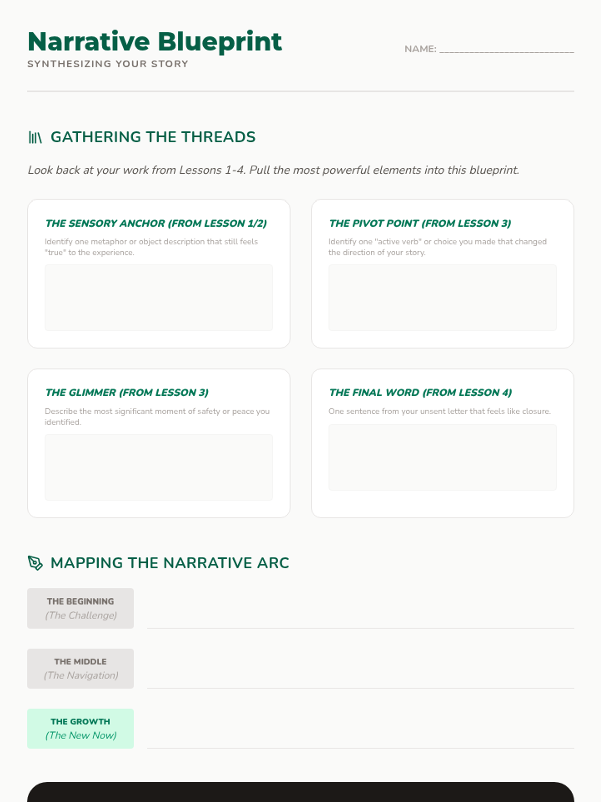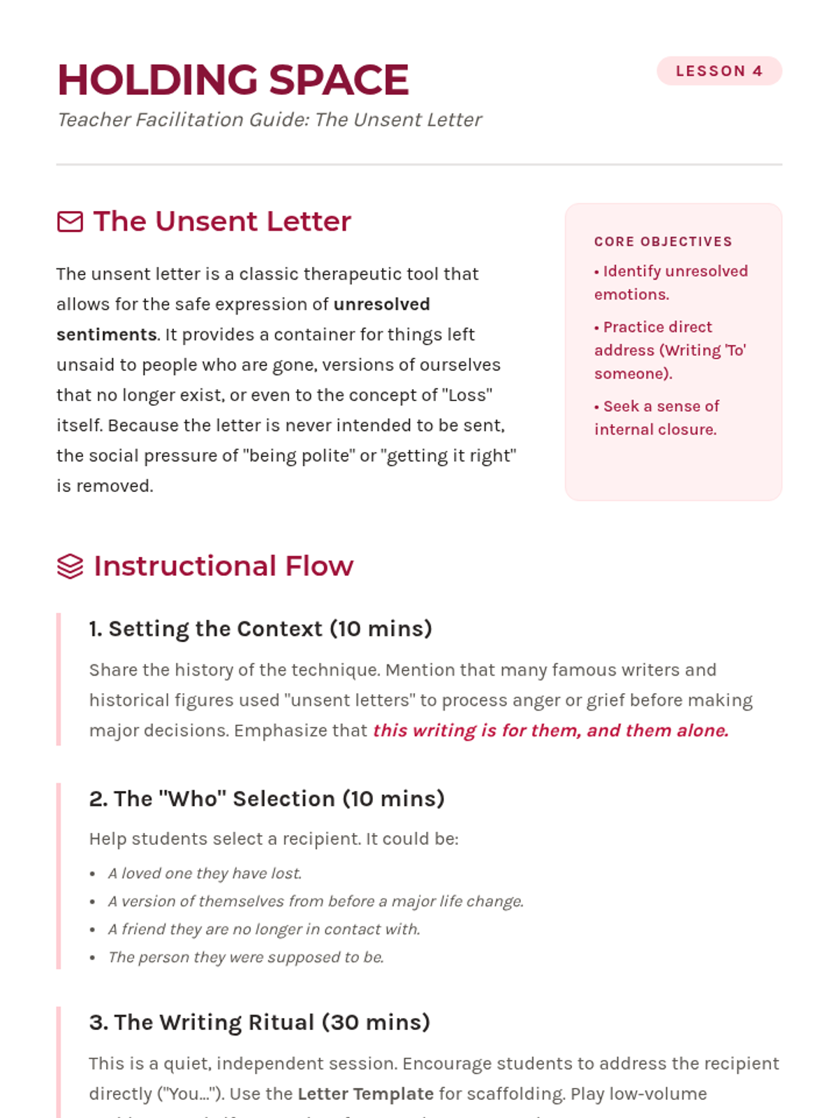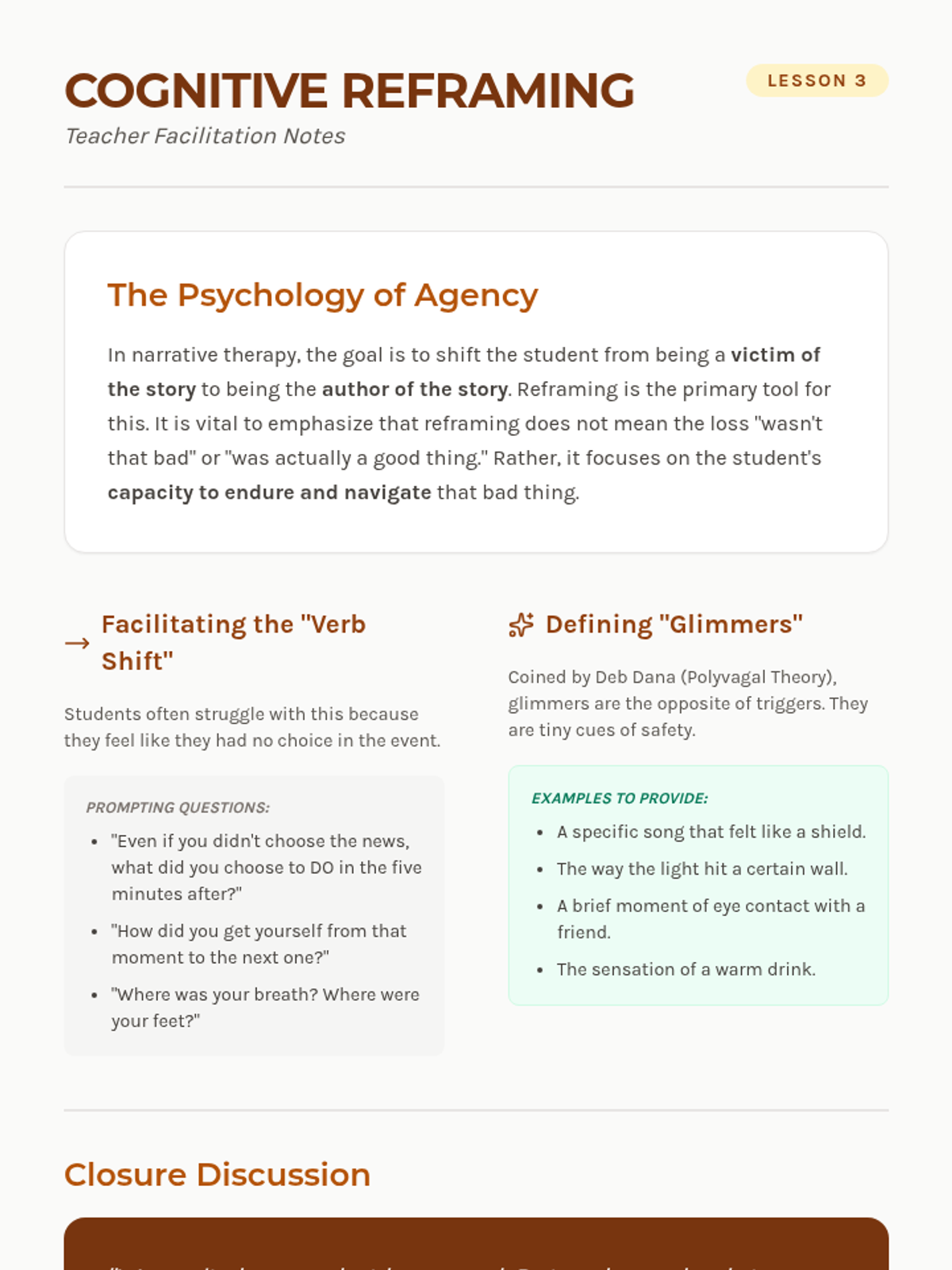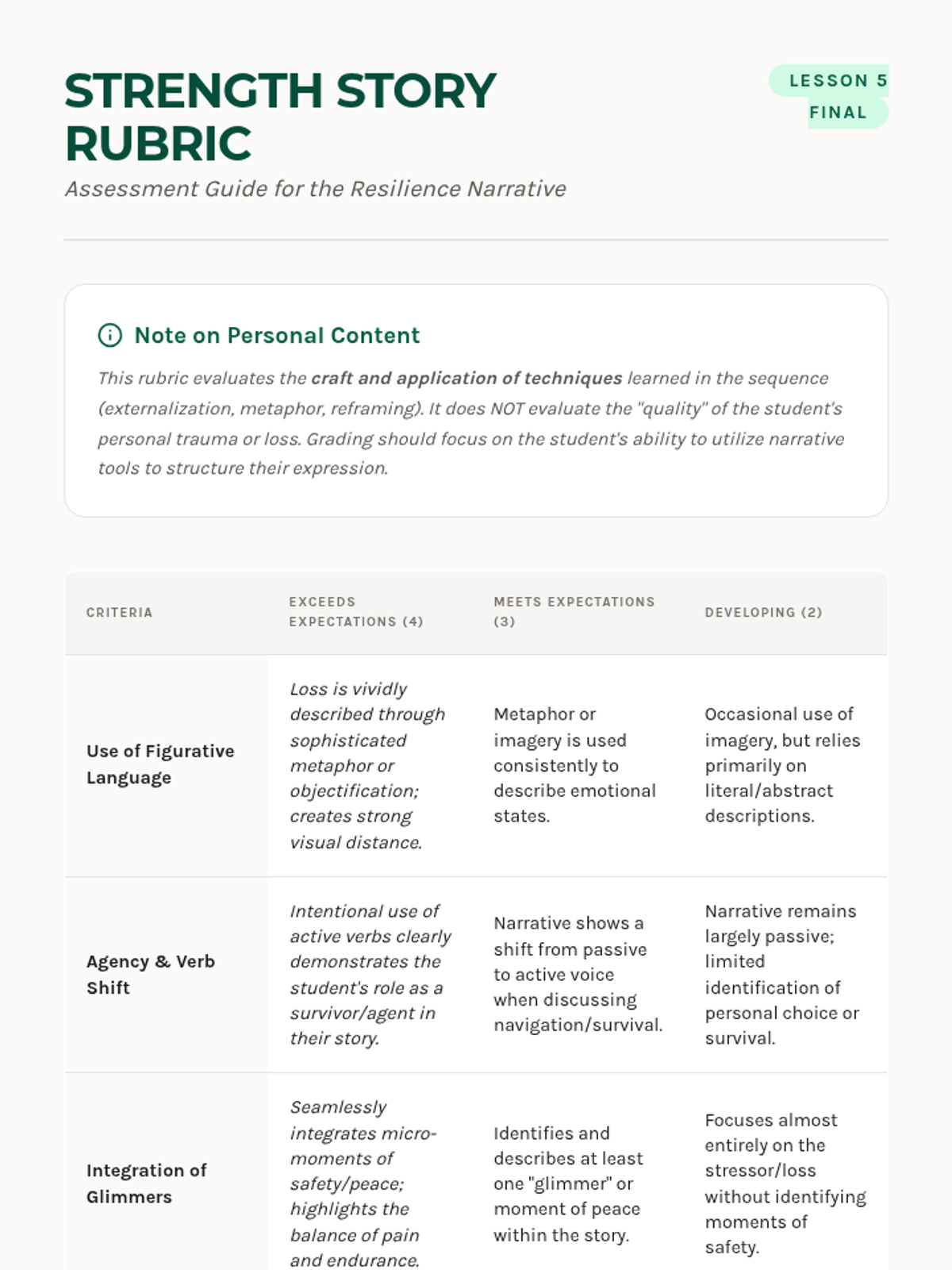 A 5-lesson sequence for 11th-grade students exploring narrative therapy and structured journaling to process grief and loss. Students learn to externalize emotions, use metaphors for expression, and reframe their personal stories into narratives of resilience.
