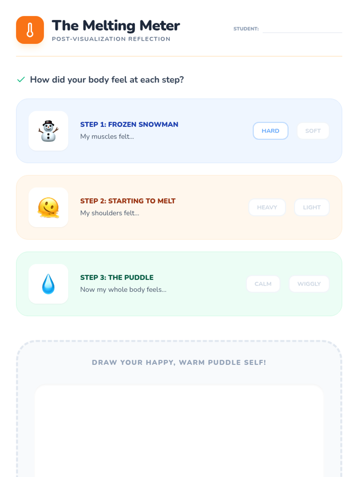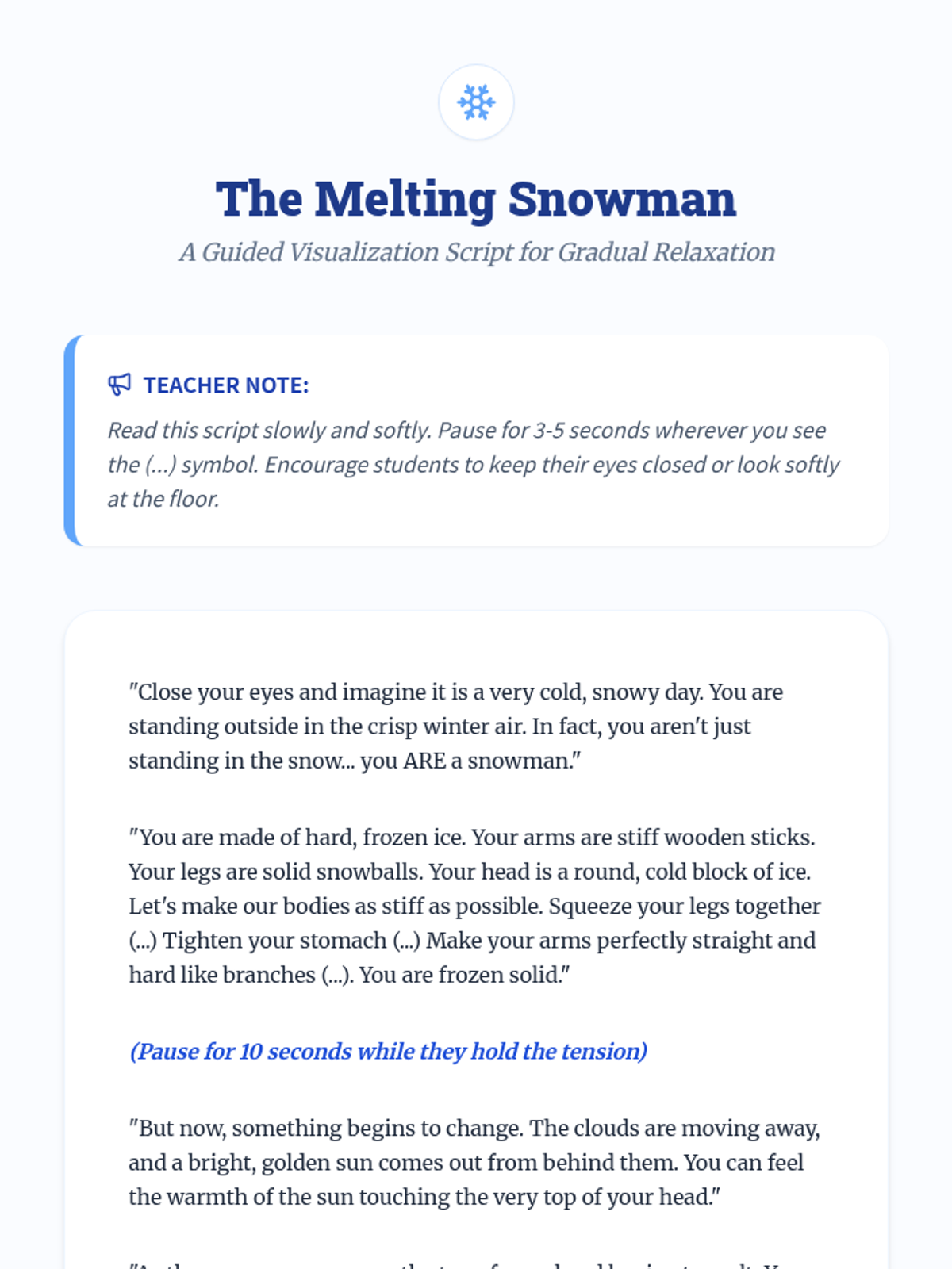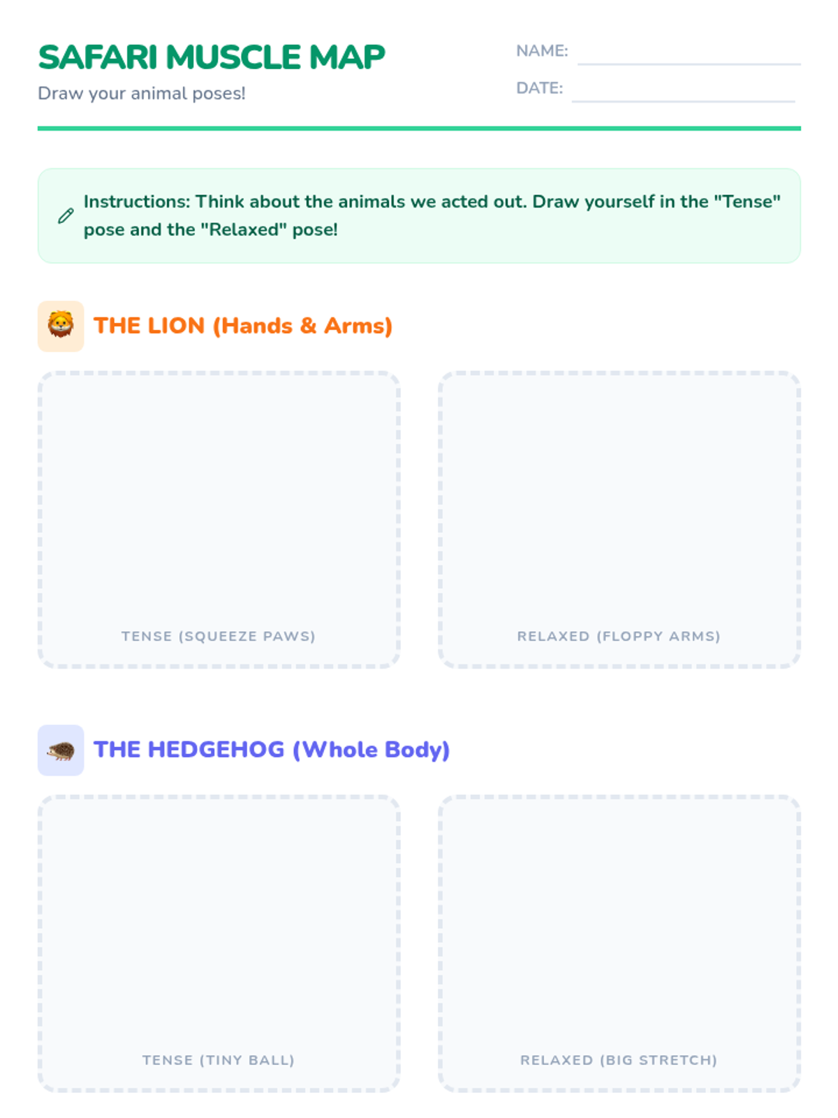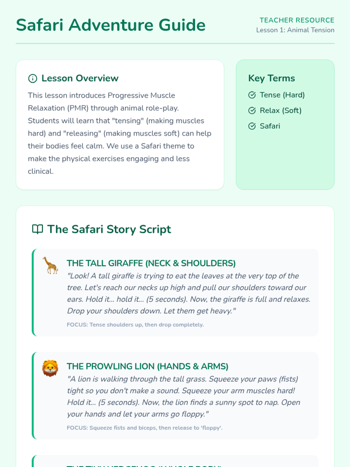A 1st-grade sequence using storytelling and imaginative play to teach Progressive Muscle Relaxation (PMR). Students learn to manage stress by acting out narrative scenarios that require tensing and relaxing different muscle groups.