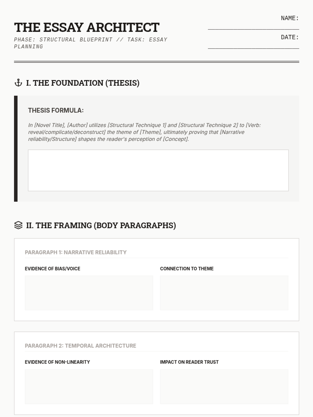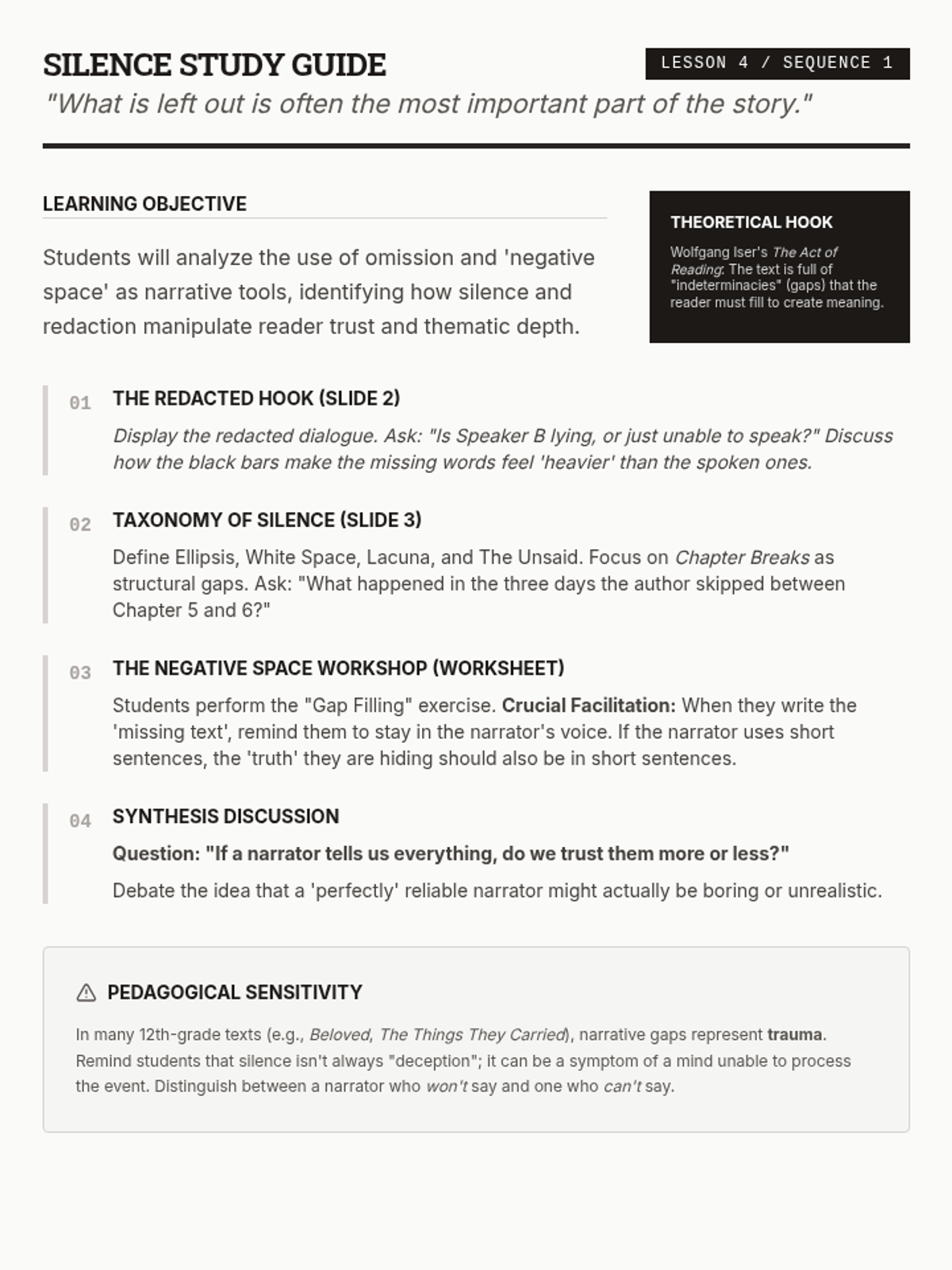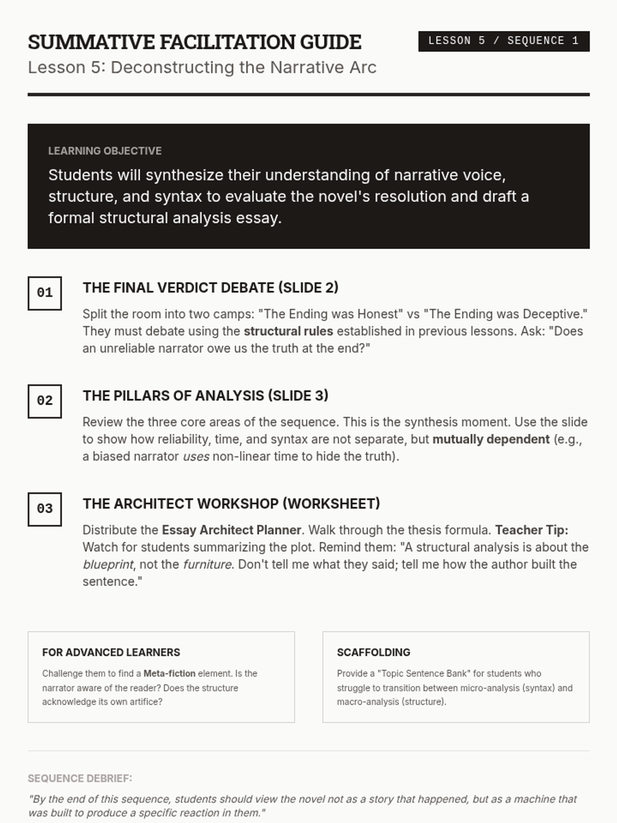 A comprehensive 12th-grade ELA sequence focused on narrative reliability and complex structures. Students explore unreliable narrators, non-linear timelines, stream of consciousness, and the power of omission to prepare for a final structural analysis essay.