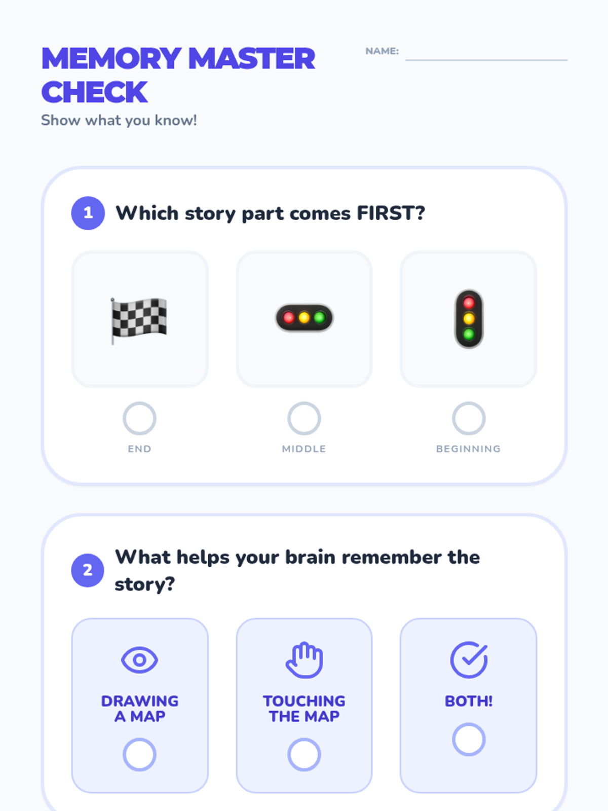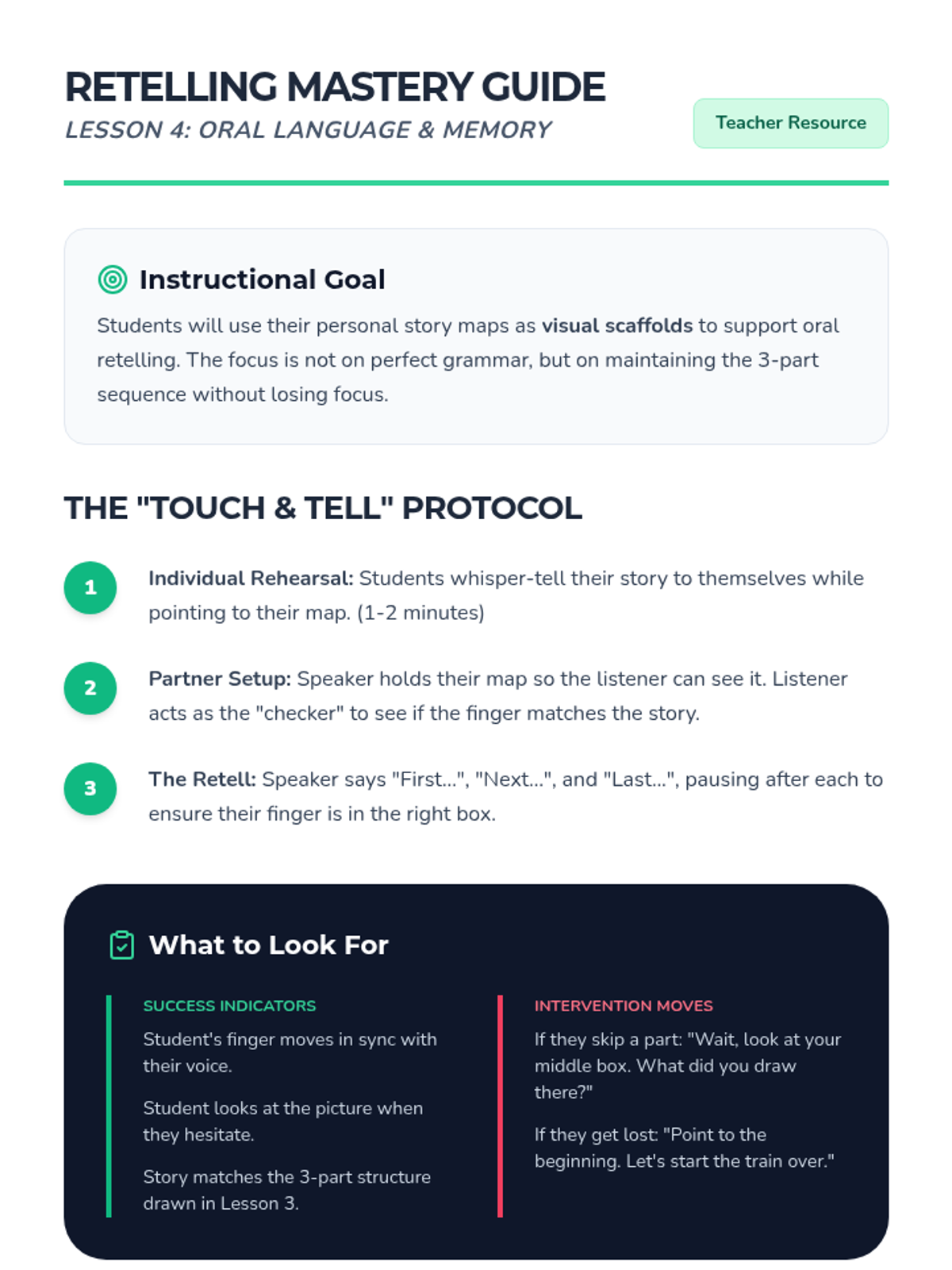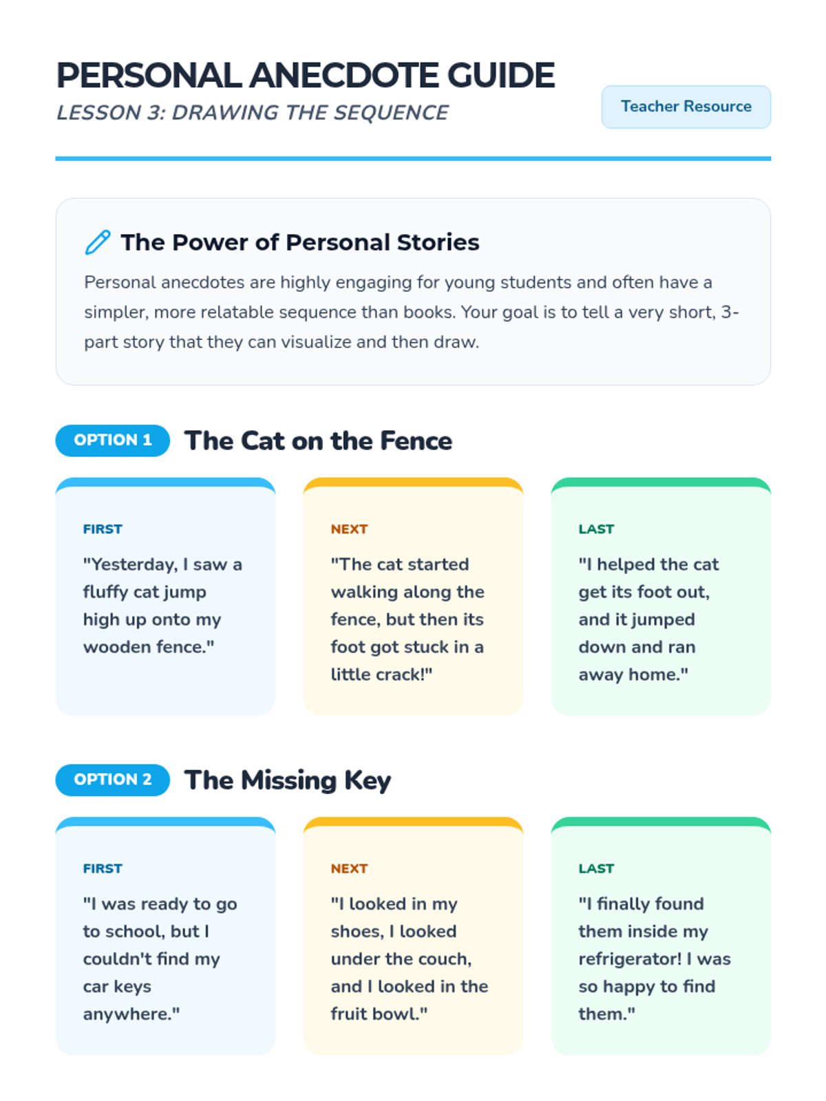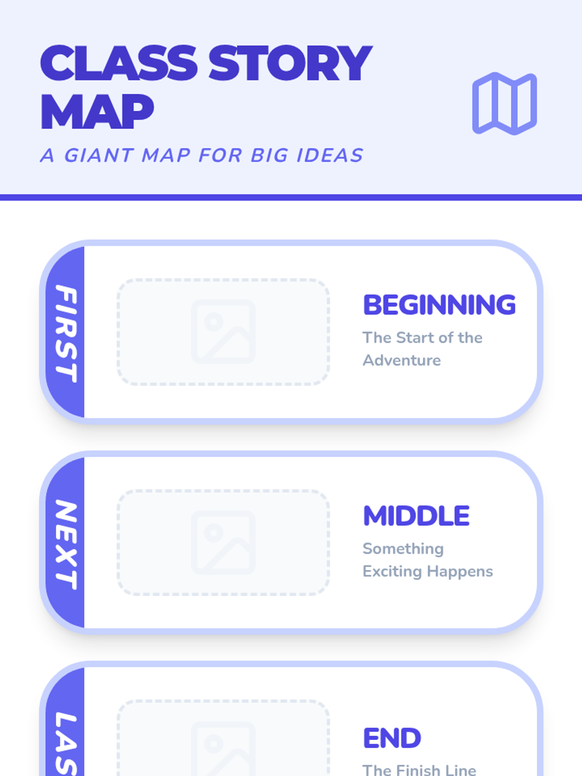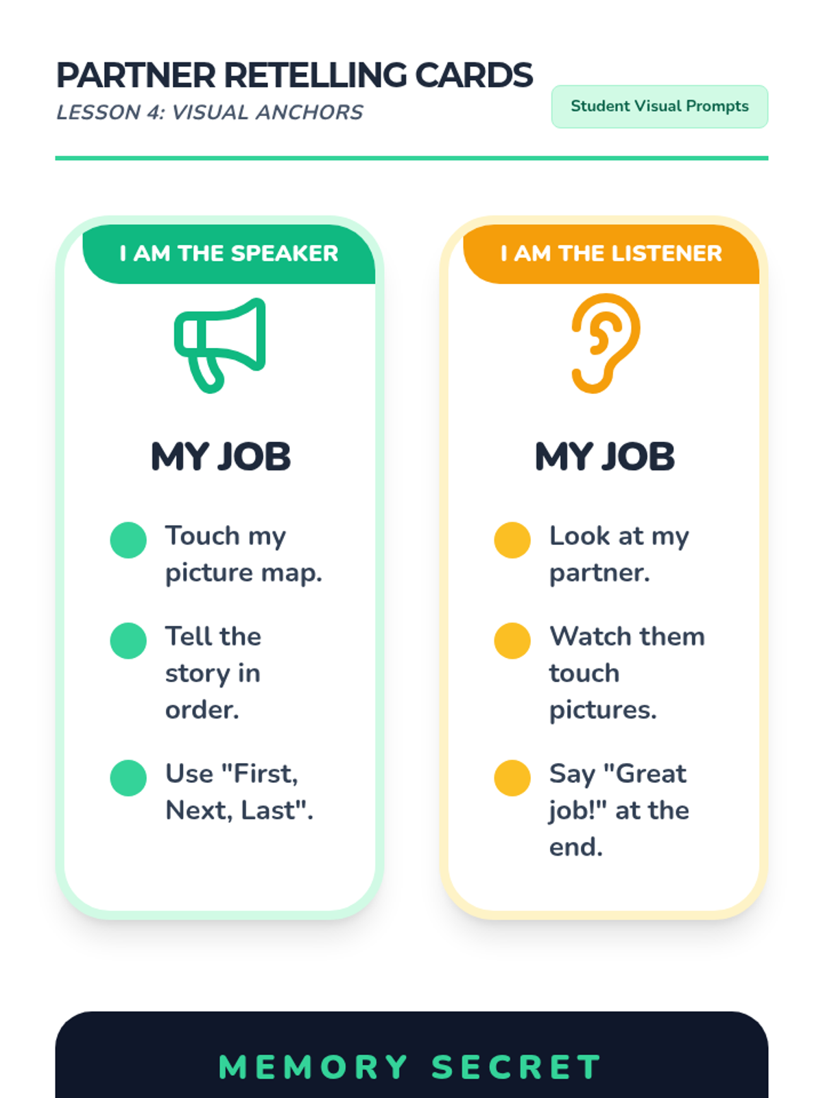 A Kindergarten sequence designed to support academic working memory by using 'First, Next, Last' graphic organizers. Students learn to structure narratives visually, reducing the cognitive load of retelling stories.