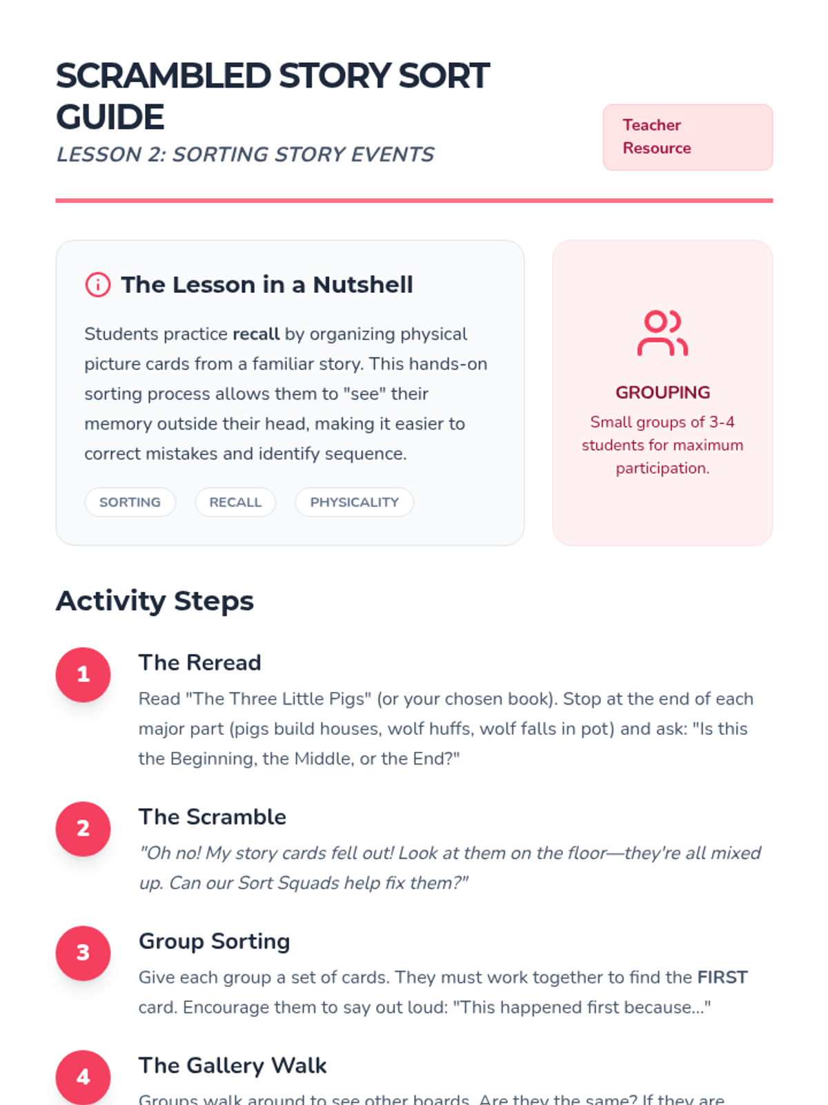 A 5-lesson sequence for Pre-K students focusing on visual supports and graphic organizers to aid working memory in narrative sequencing. Students use tactile and visual aids like story stones and picture cards to categorize elements, sequence events, and retell stories.