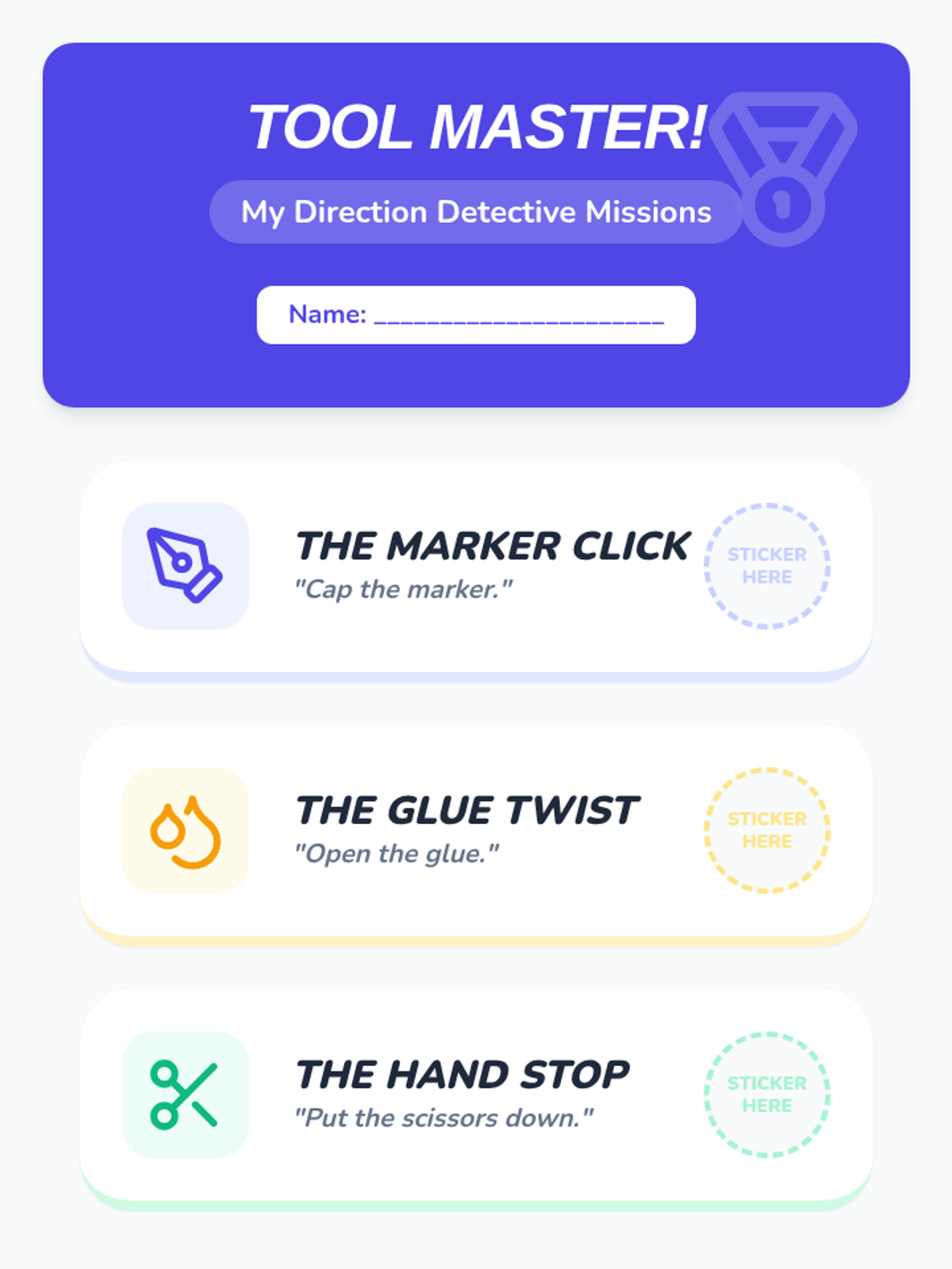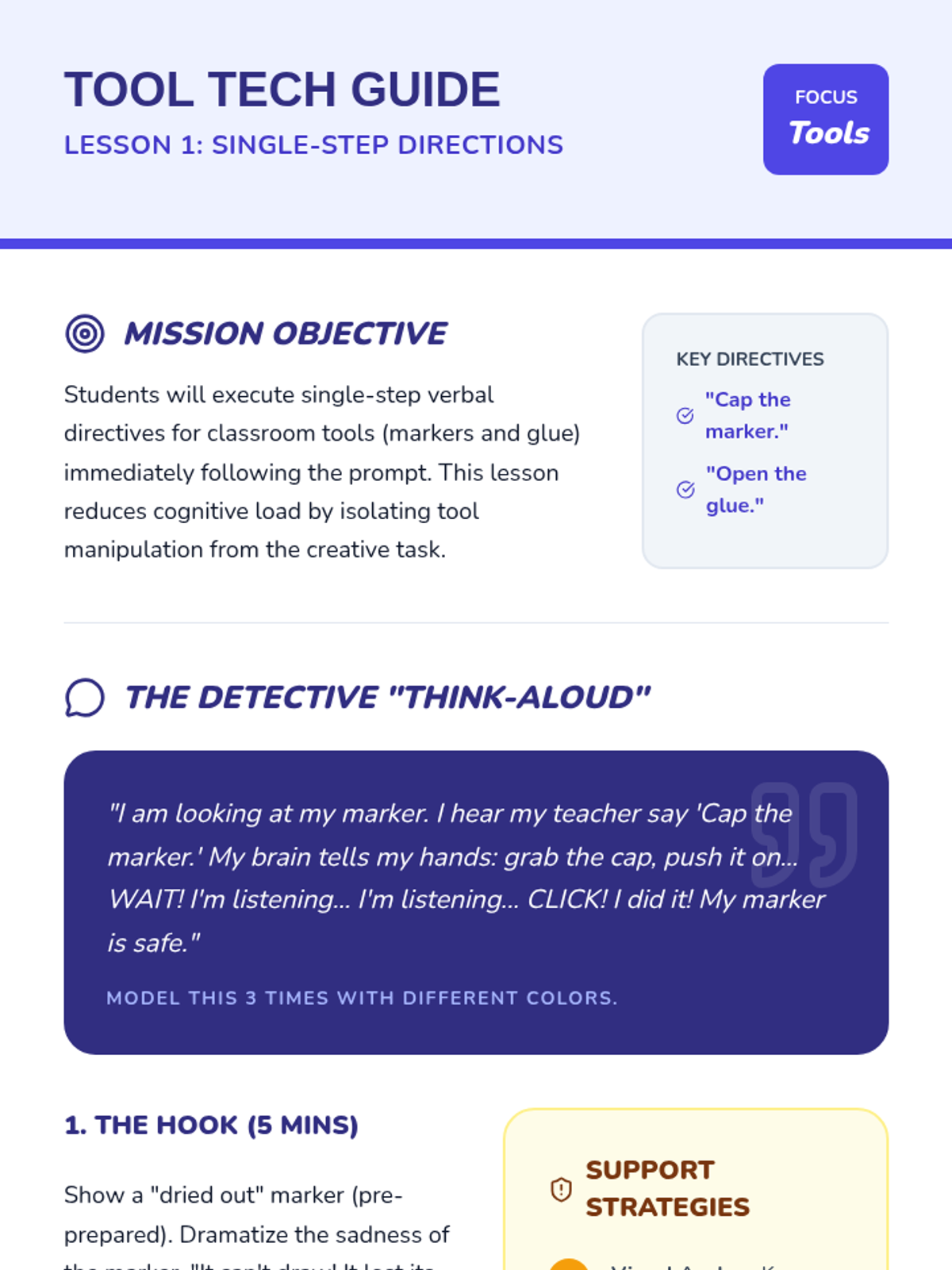 This sequence helps Kindergarten students with working memory challenges master single-step classroom directions through the 'Direction Detective' theme. It focuses on turning abstract instructions into concrete actions for tools, transitions, seating, lining up, and cleanup.