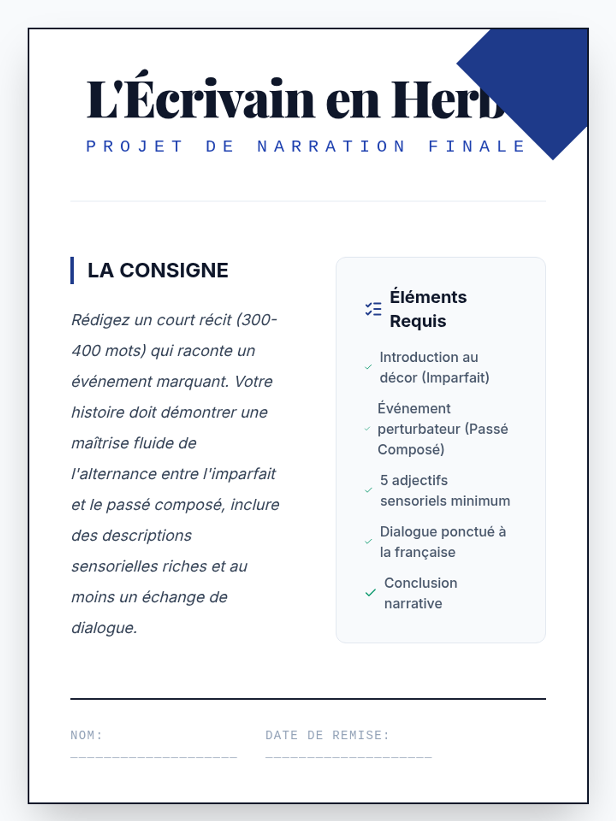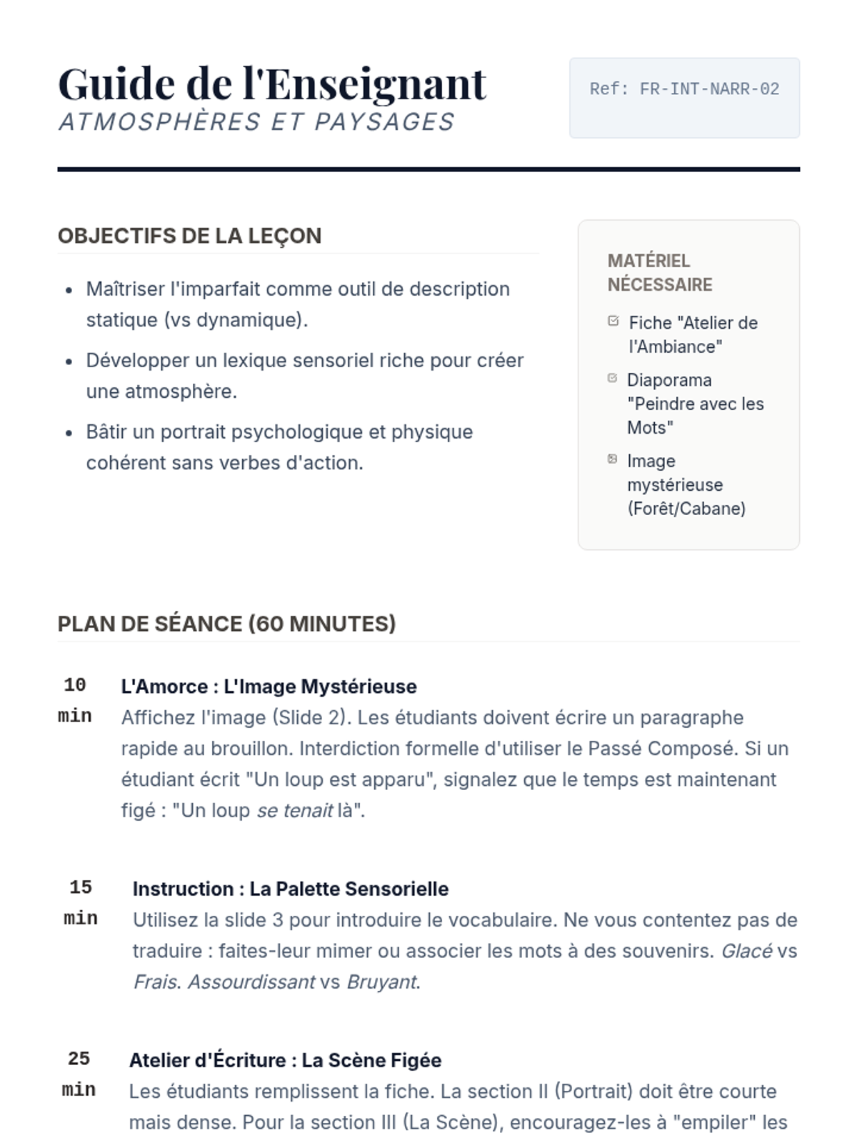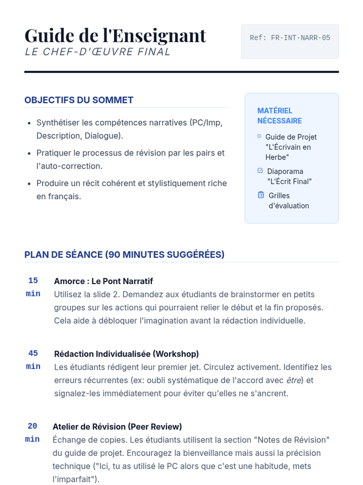 A comprehensive sequence for intermediate French students focused on mastering narrative tenses (passé composé and imparfait) and descriptive writing techniques in French literature. Students progress from tense discrimination to crafting a full original short story.