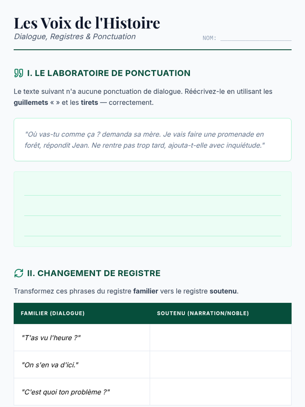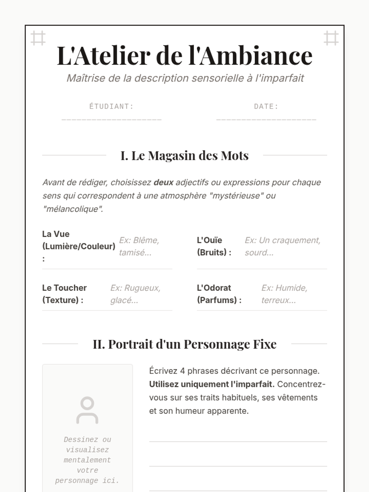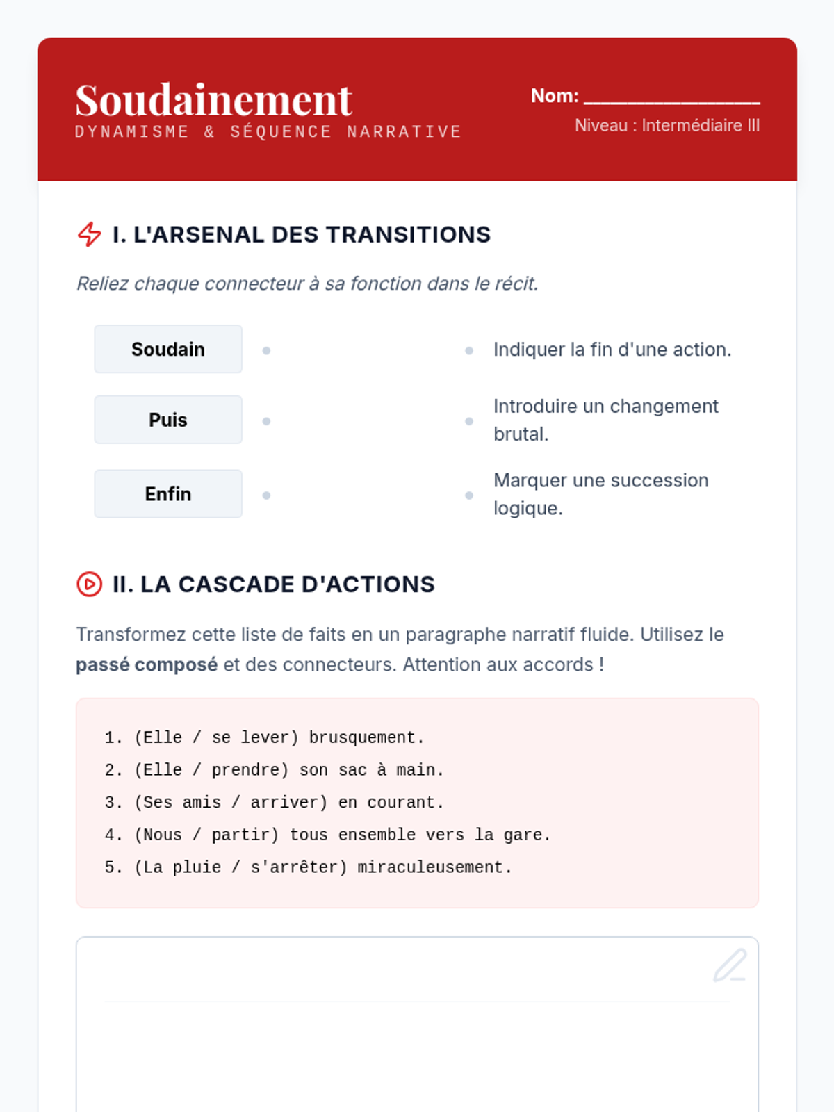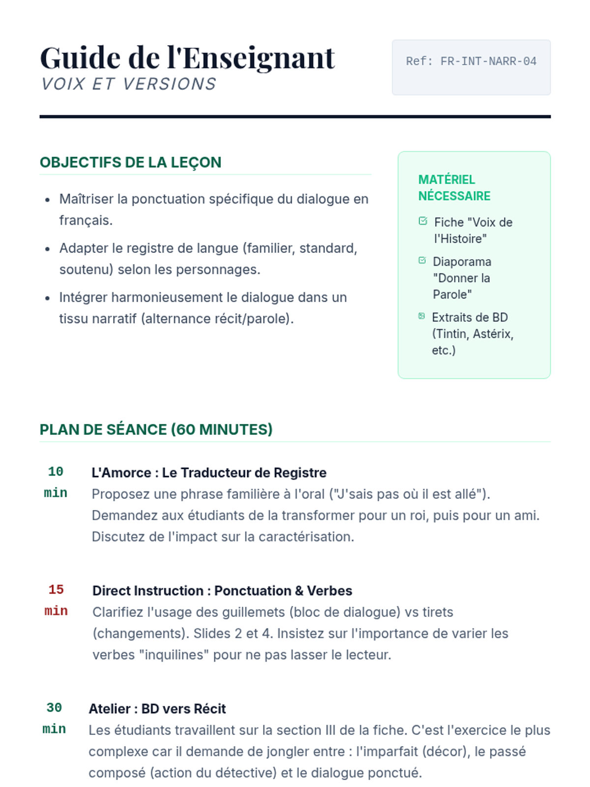 A comprehensive sequence for intermediate French students focused on mastering narrative tenses (passé composé and imparfait) and descriptive writing techniques in French literature. Students progress from tense discrimination to crafting a full original short story.