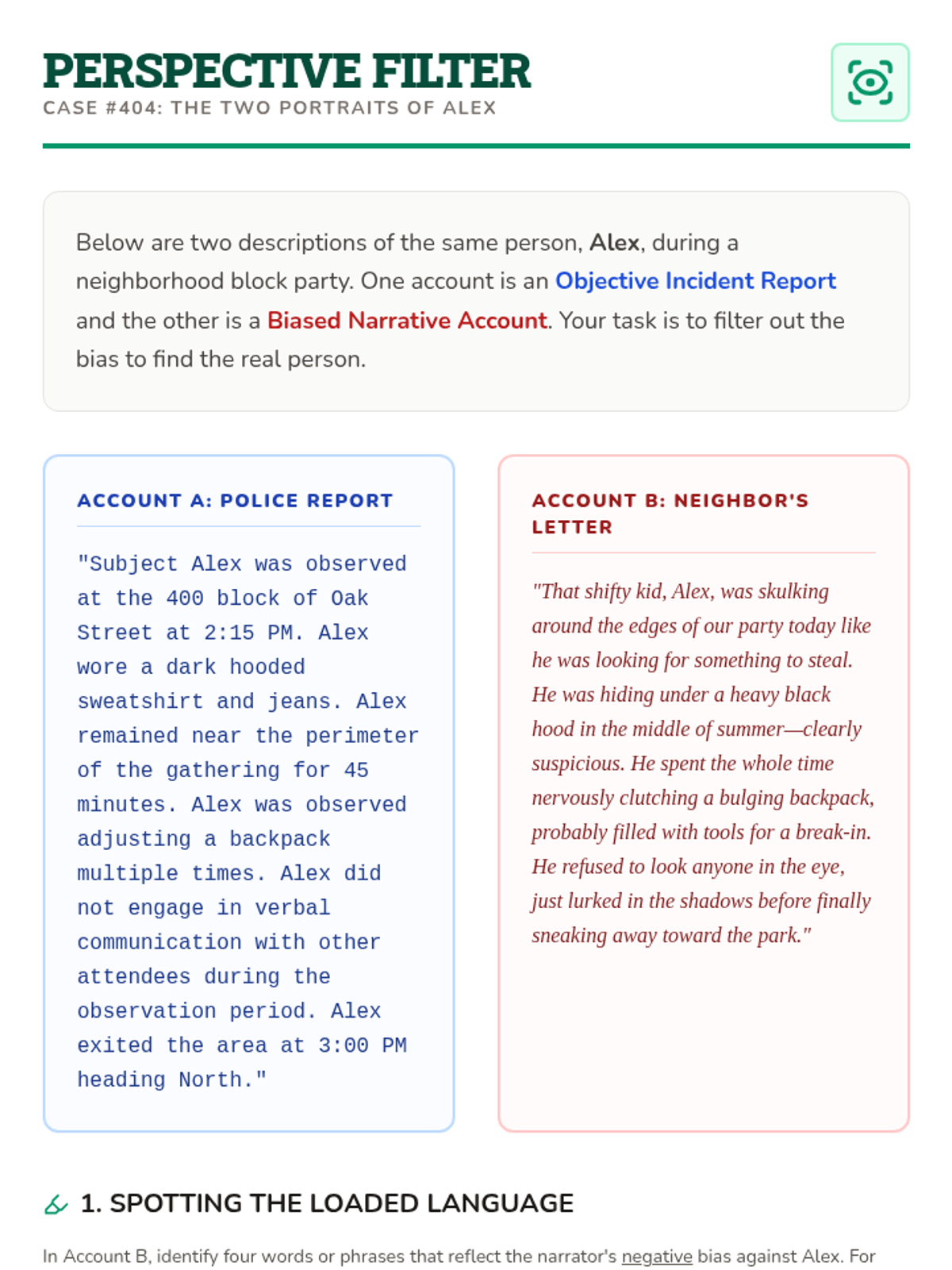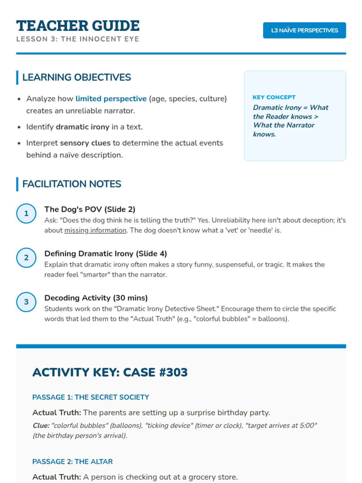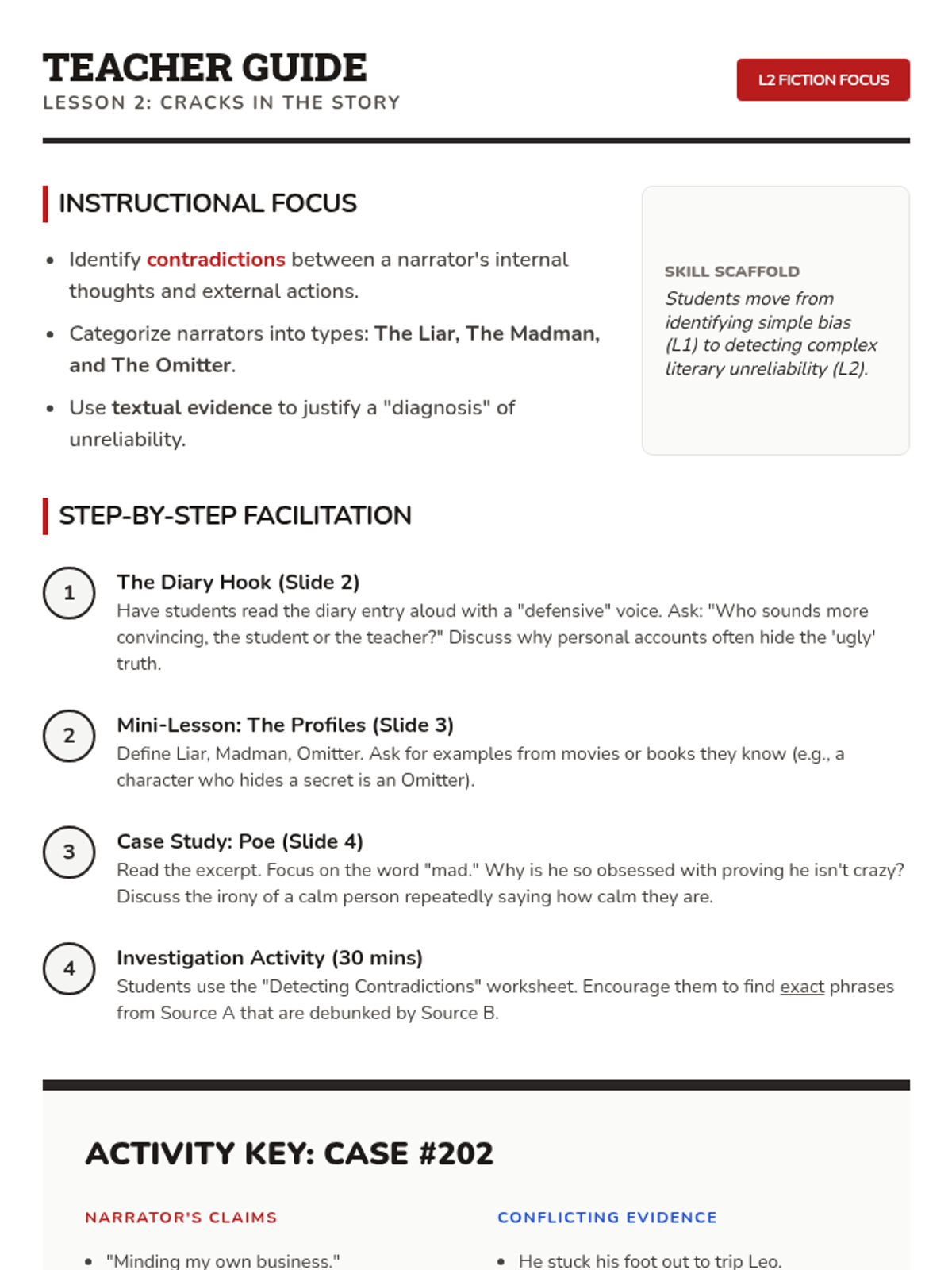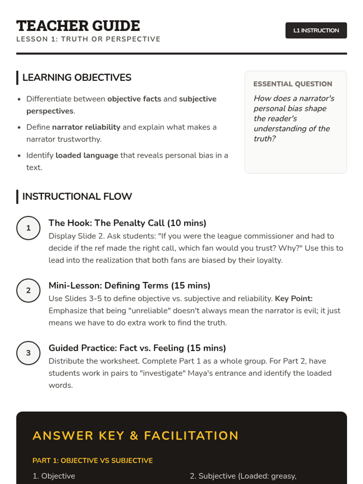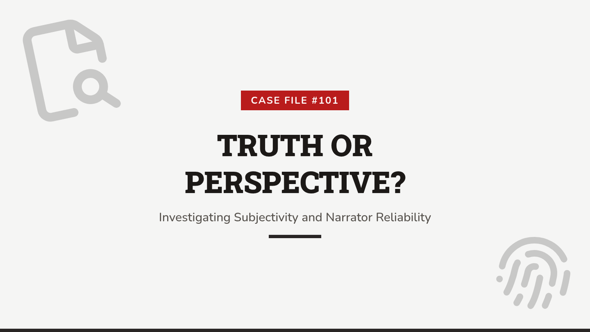 A comprehensive sequence for 7th-grade students focused on identifying and evaluating narrator reliability, bias, and subjectivity in literature. Students move from basic definitions to creating their own biased narratives, learning to question the objective truth of first-person storytelling.