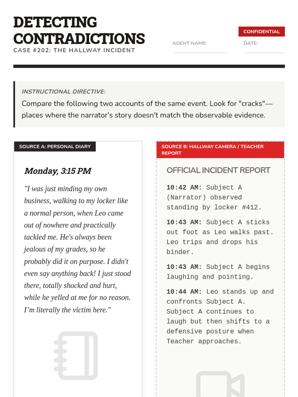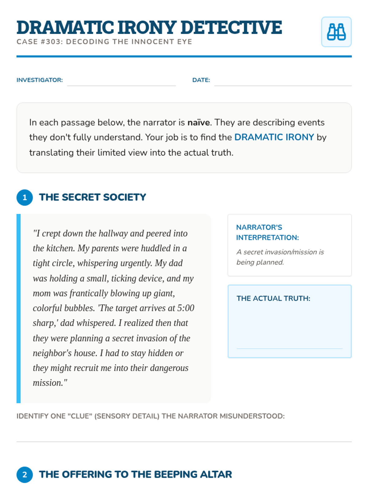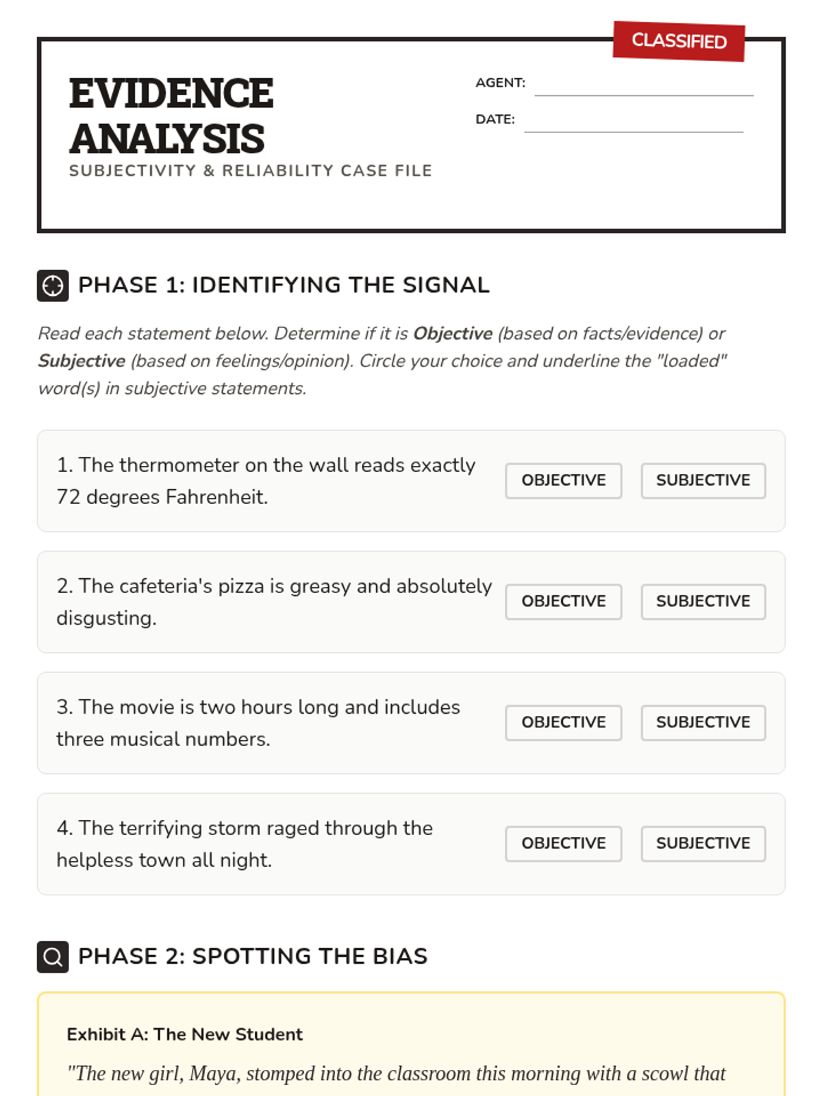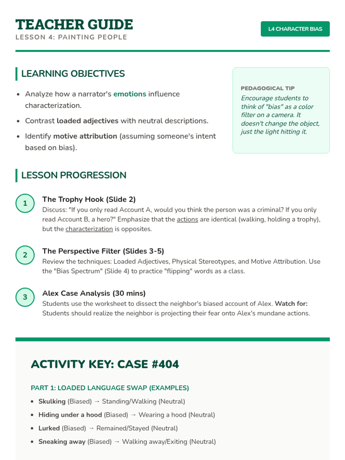 A comprehensive sequence for 7th-grade students focused on identifying and evaluating narrator reliability, bias, and subjectivity in literature. Students move from basic definitions to creating their own biased narratives, learning to question the objective truth of first-person storytelling.