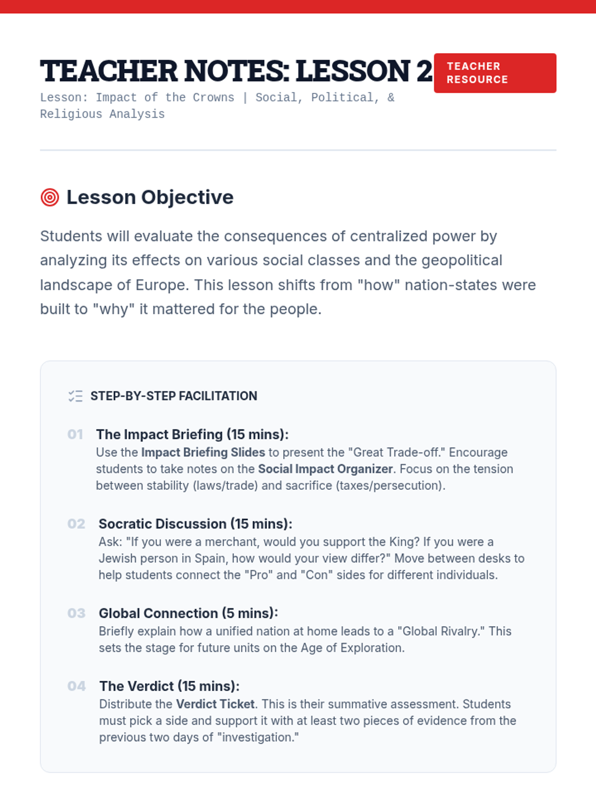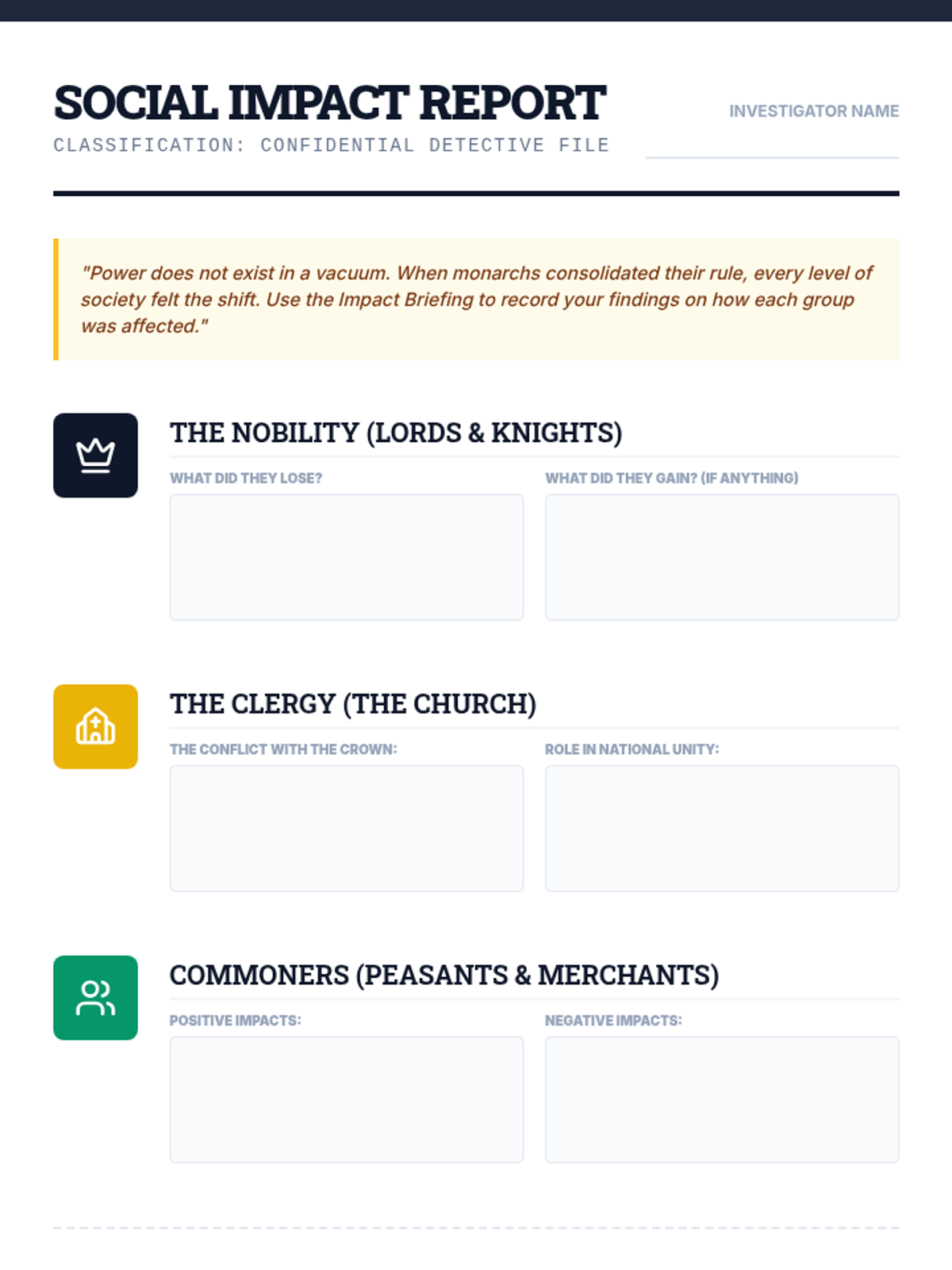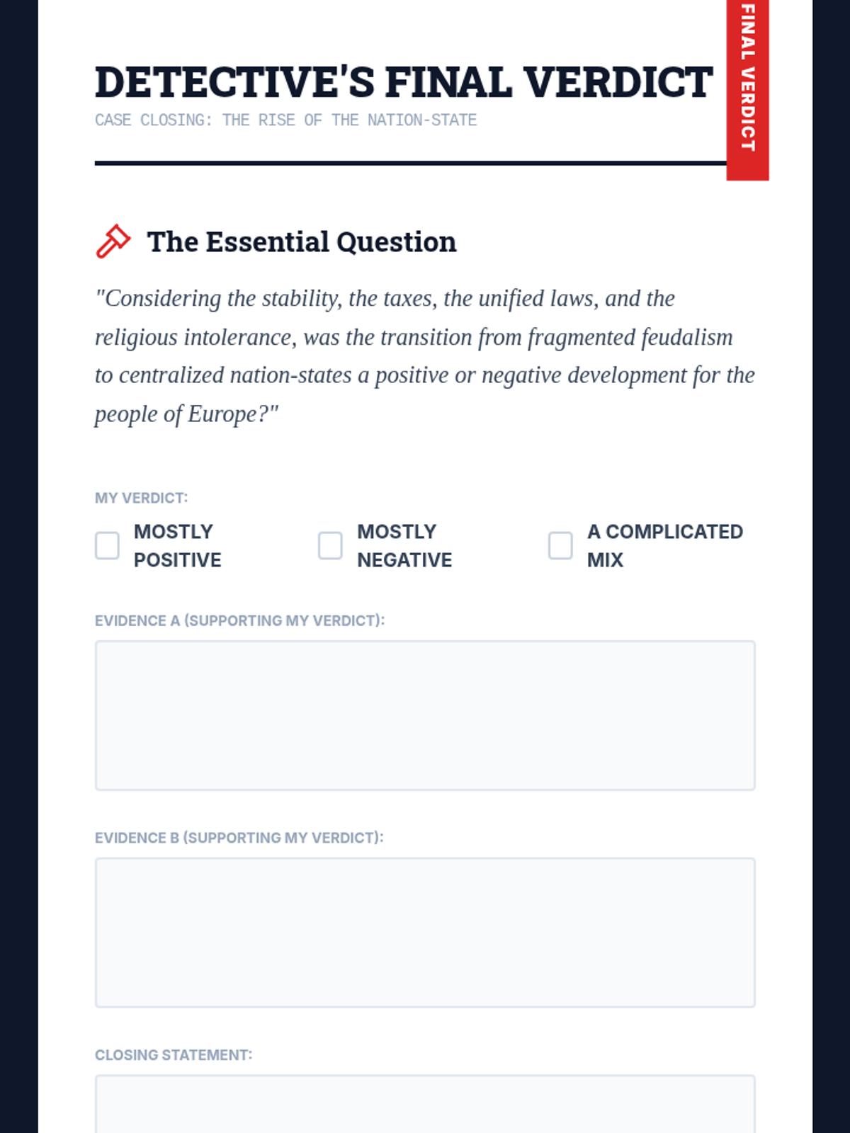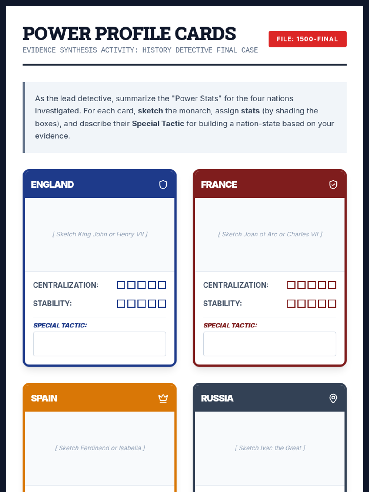A comprehensive middle school history unit where students act as 'history detectives' to investigate the rise of nation-states in England, France, Spain, and Russia through primary source analysis.