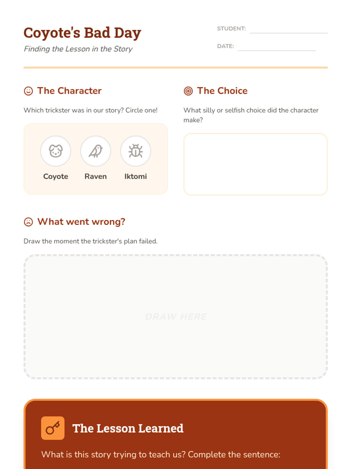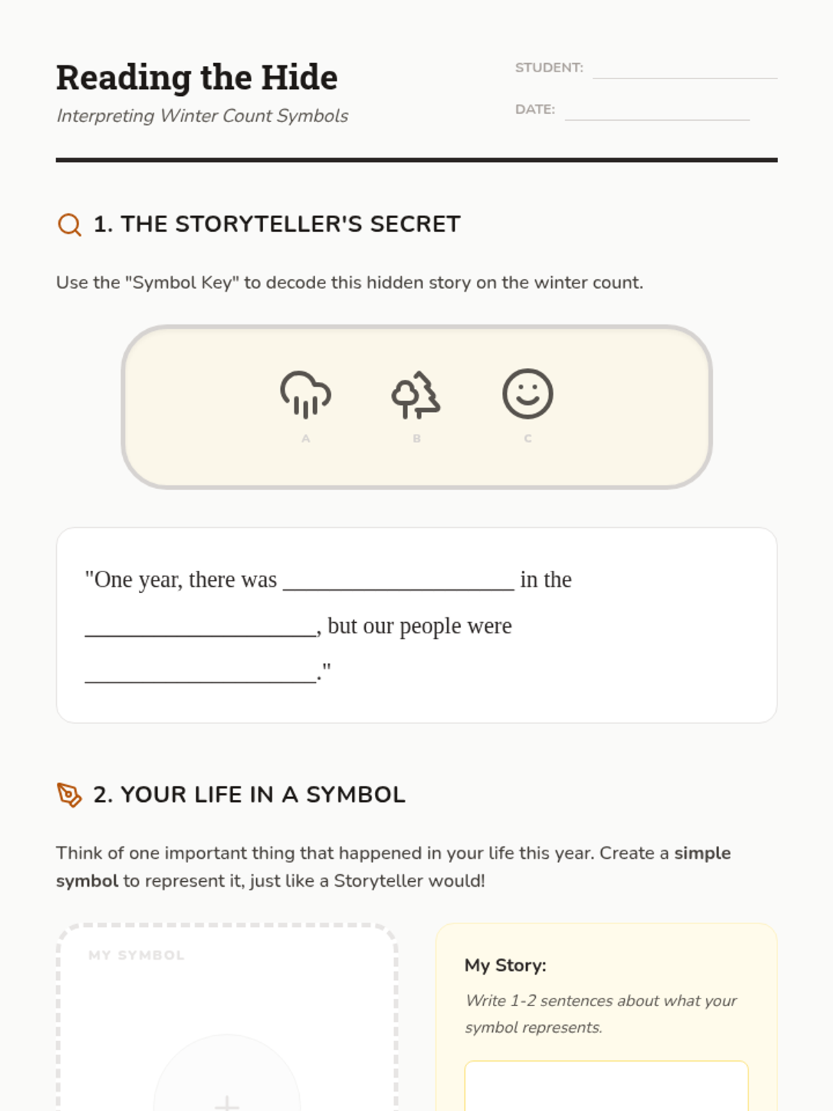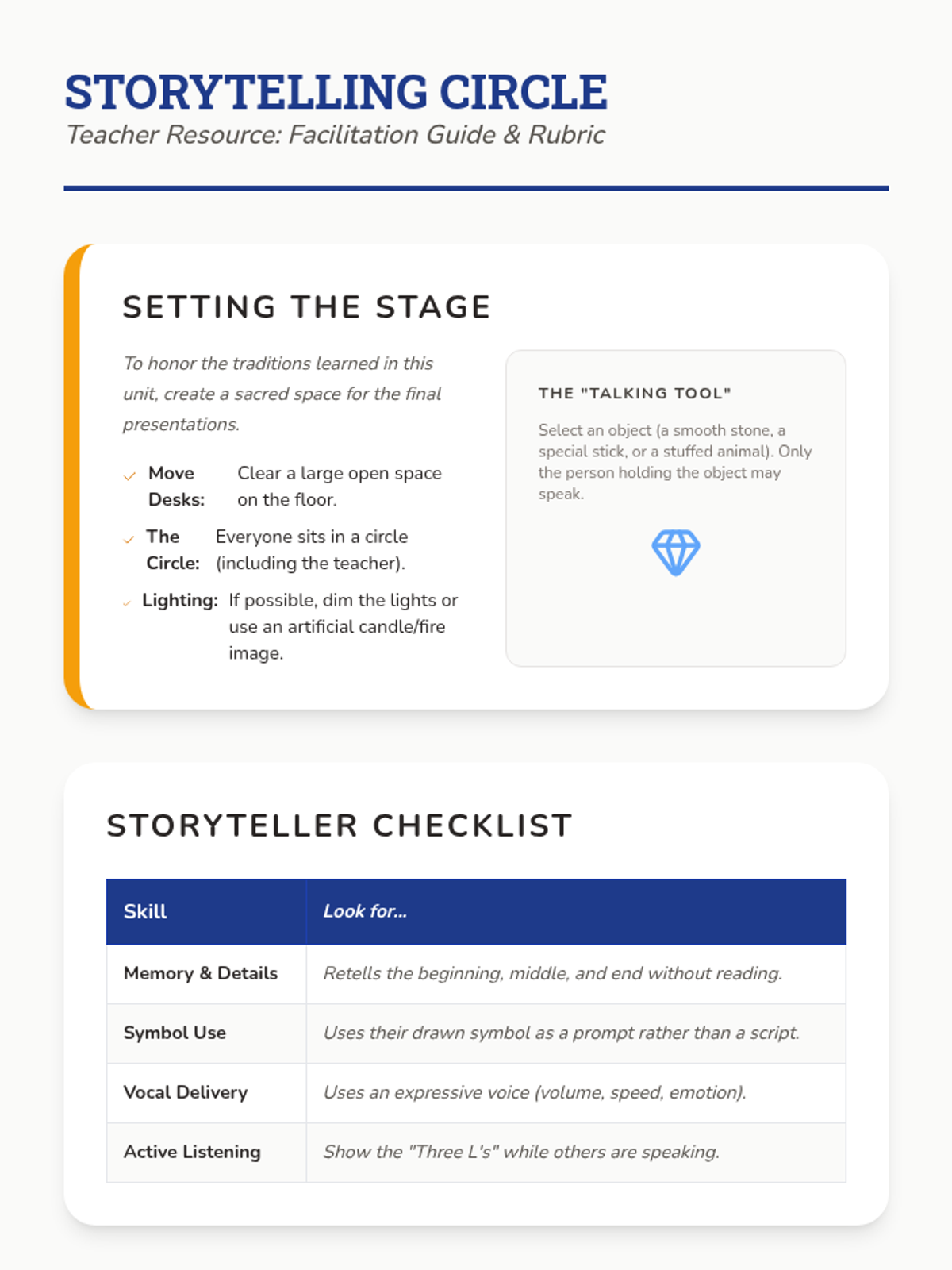 A 2nd-grade social studies unit exploring how Indigenous nations used oral traditions to preserve history, teach values, and explain nature. Students move from active listening to analyzing legends and interpreting visual symbols, culminating in a class oral history project.