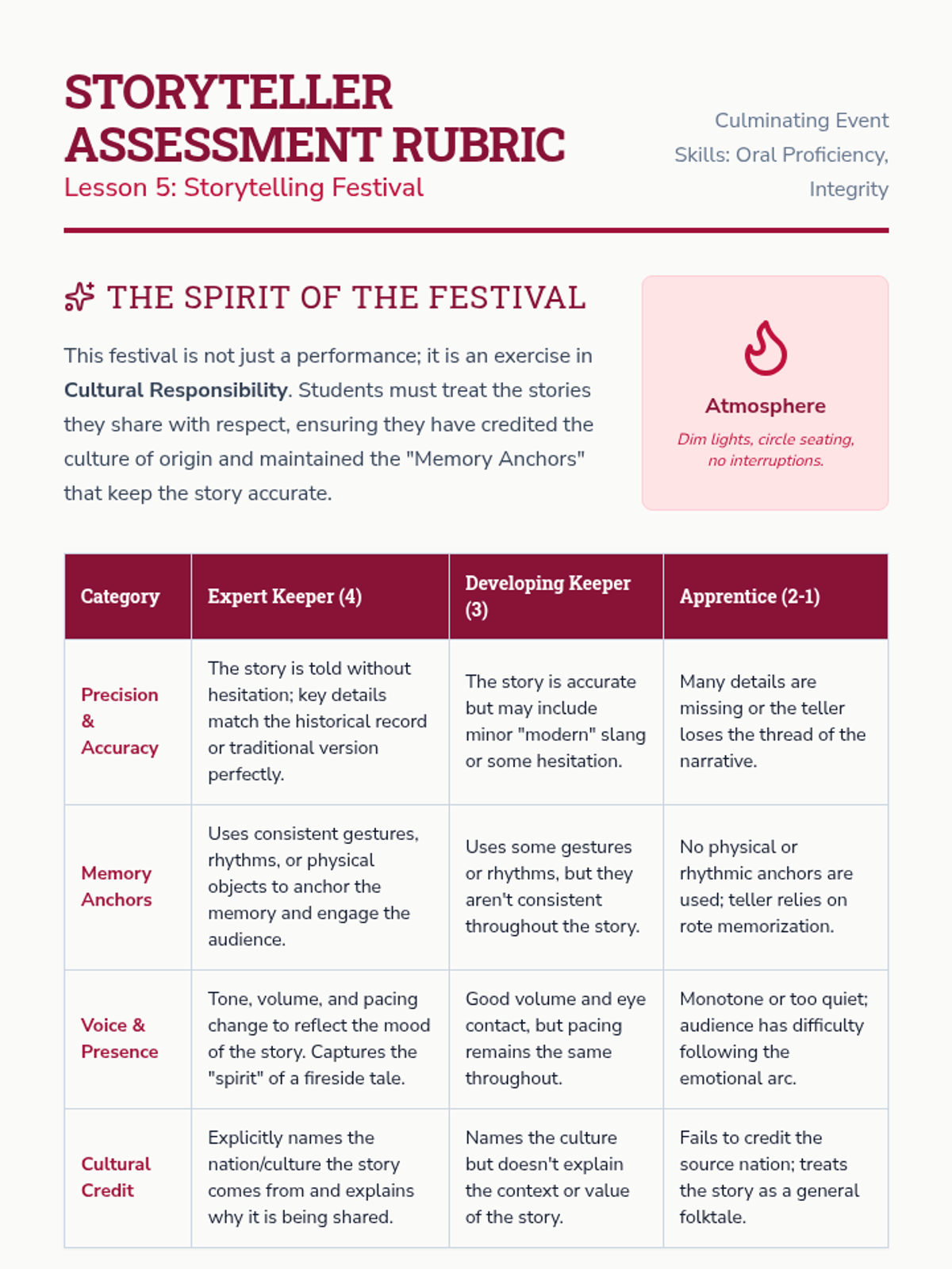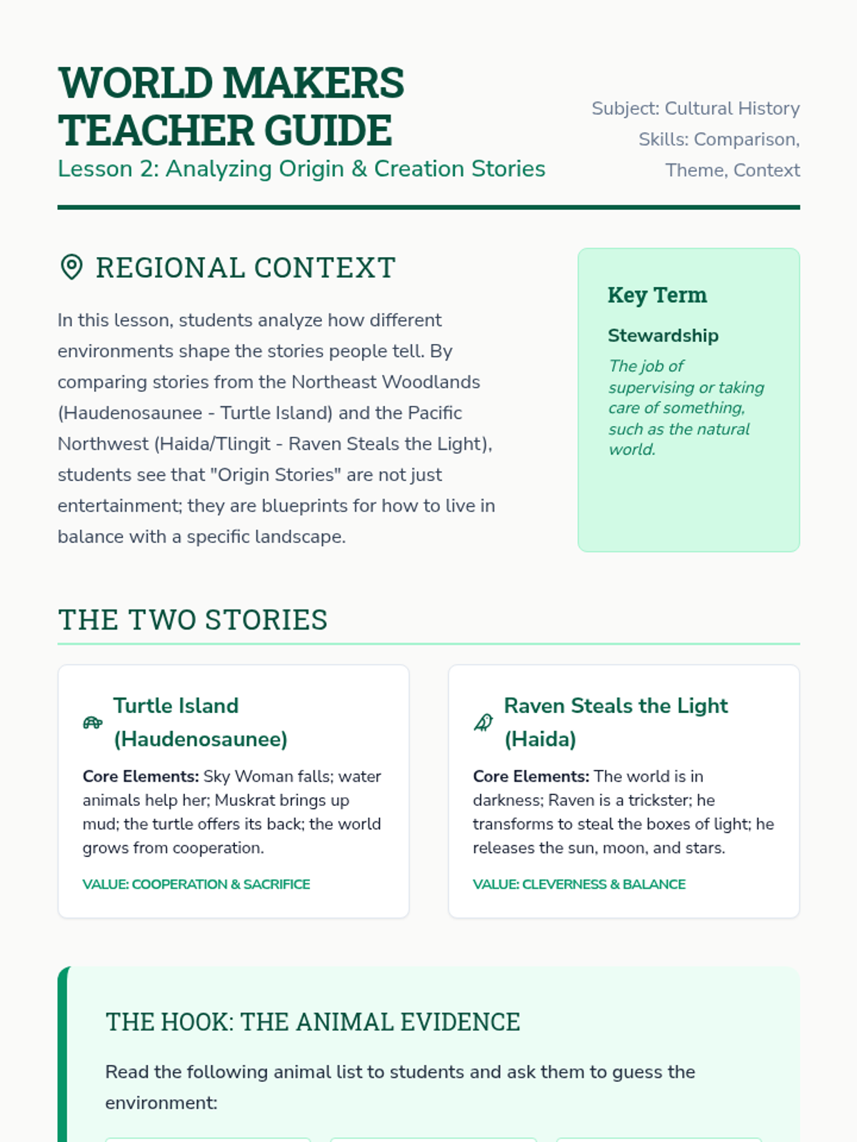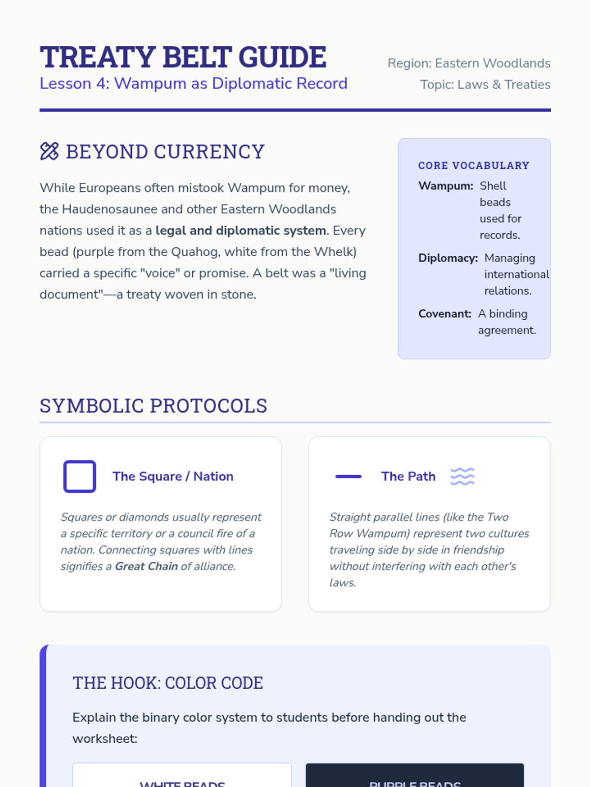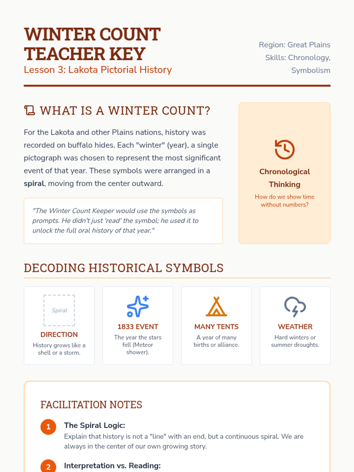 A 5th-grade history sequence exploring how Native Peoples of North America used oral traditions, Winter Counts, and Wampum belts to preserve history, values, and diplomacy without written language. Students learn the rigor of oral history and interpret non-textual records.