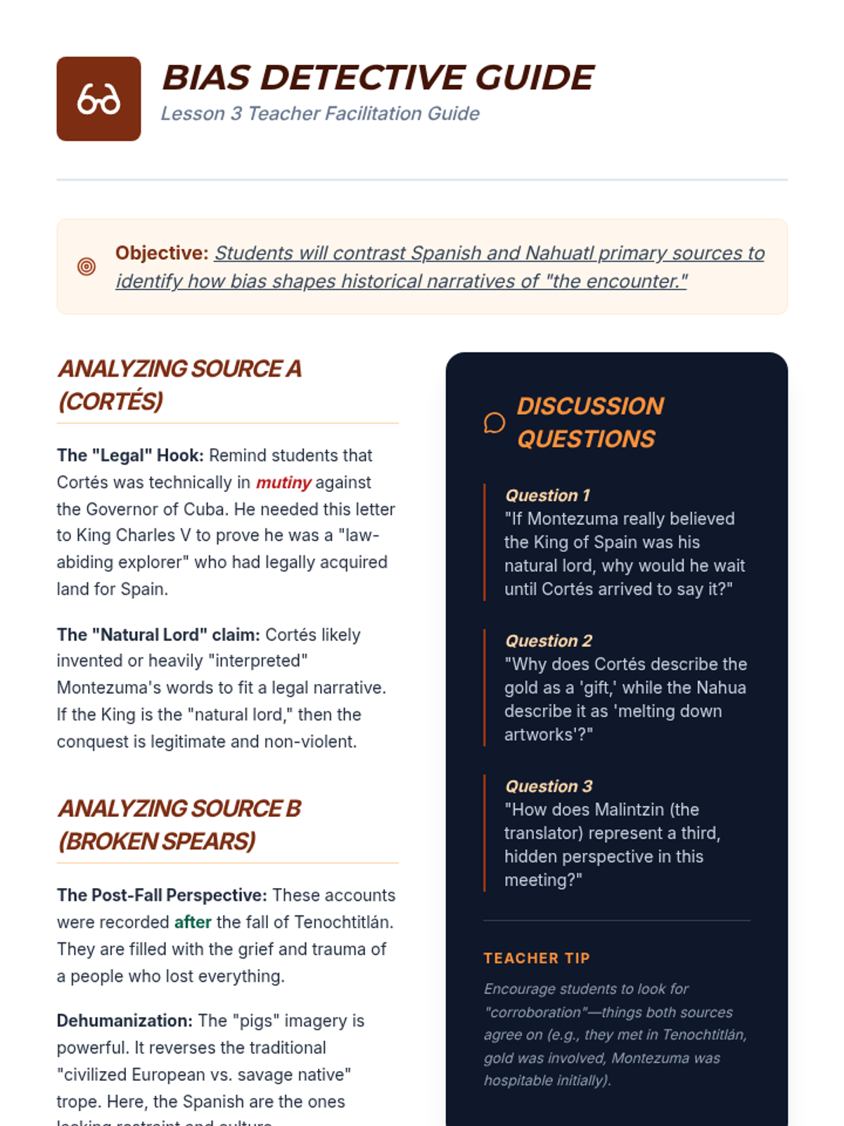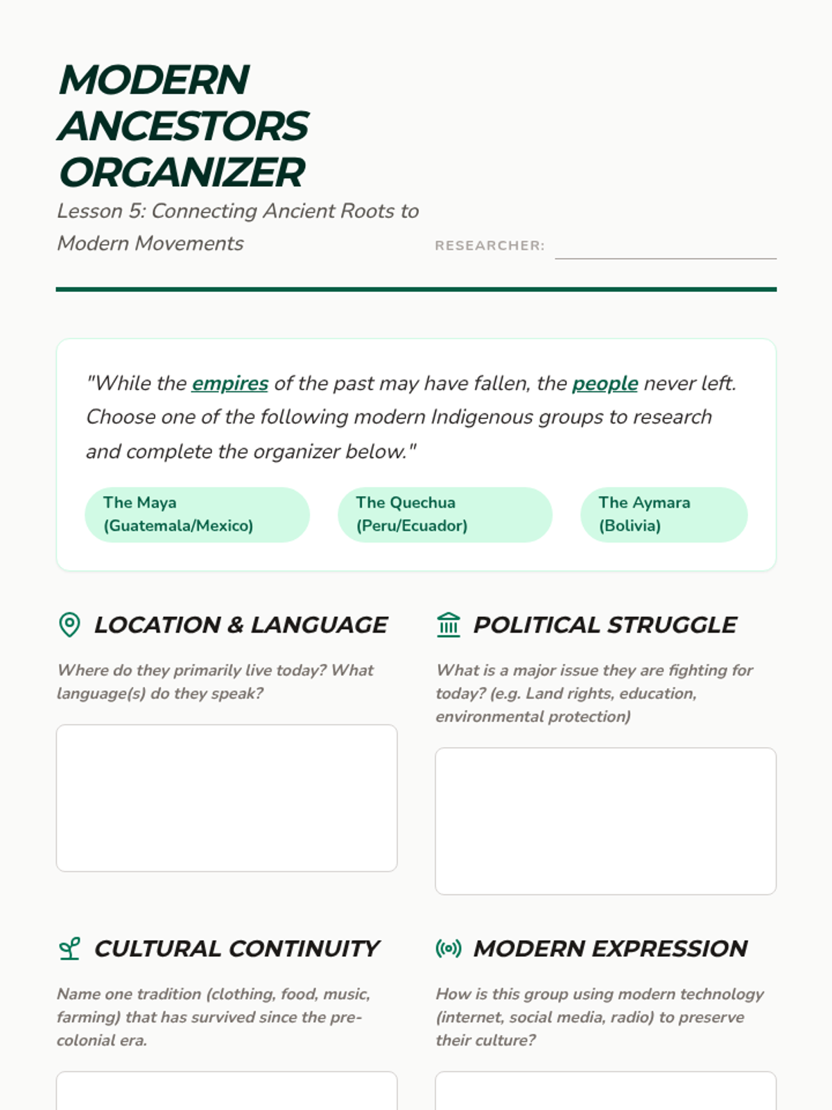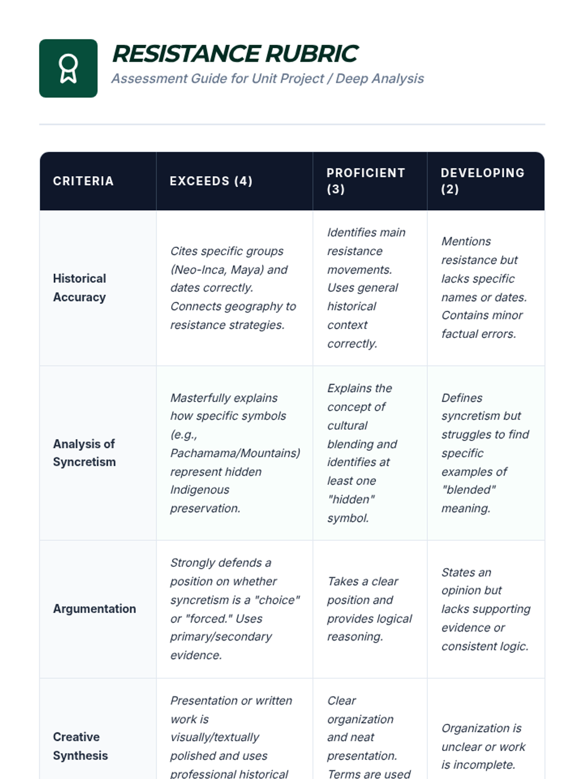 A 9th-grade history sequence exploring the internal and external factors leading to the fall of the Aztec and Inca empires, the impact of European contact, and the enduring continuity of Indigenous cultures. Students analyze primary sources, demographic data, and modern cultural movements.