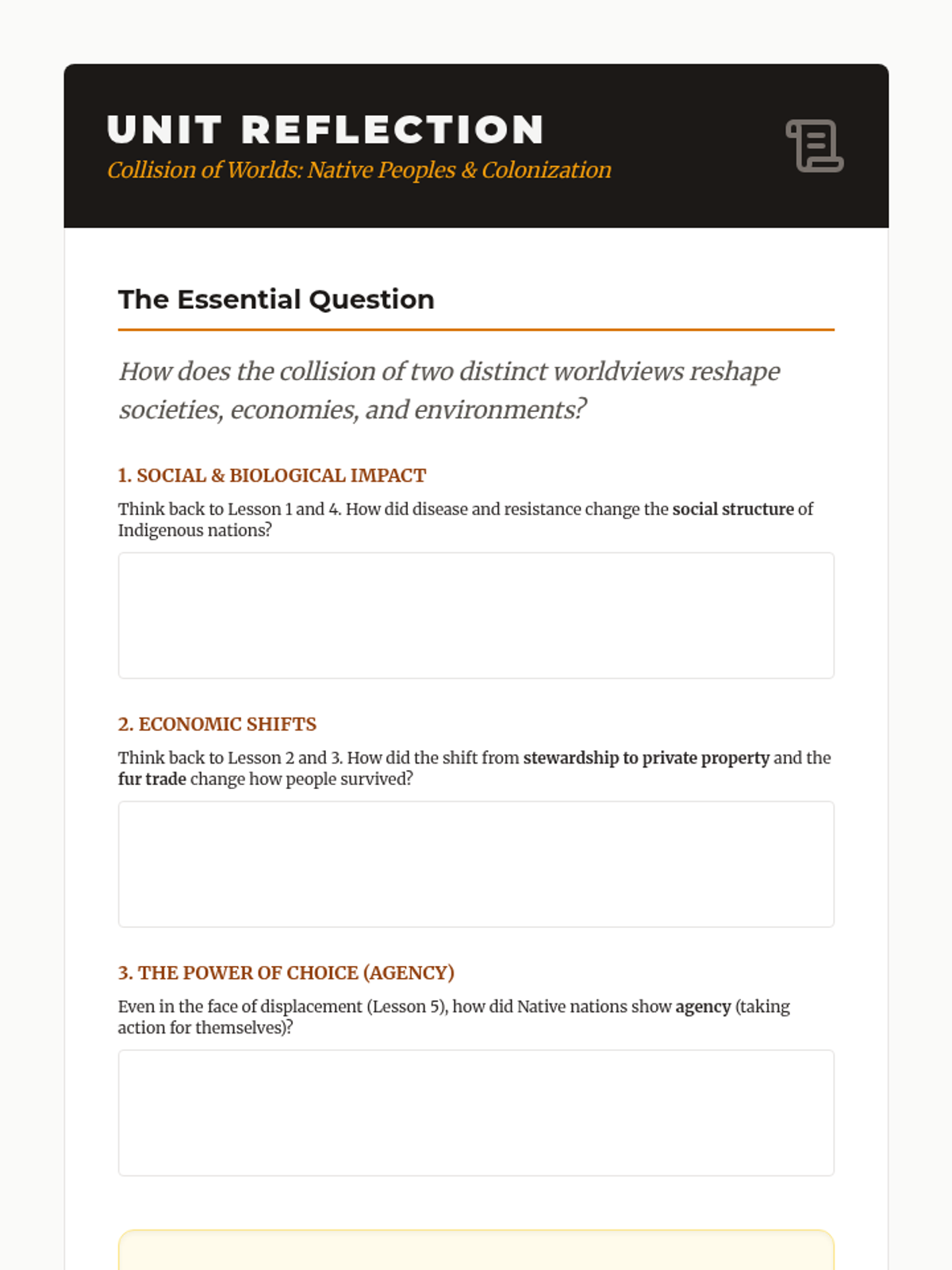 This sequence analyzes the complex interactions between Indigenous nations and European colonizers, moving beyond simple narratives of conquest. Students examine the Columbian Exchange, shifting trade alliances, and the various forms of resistance and cooperation, emphasizing Indigenous agency and long-term consequences.