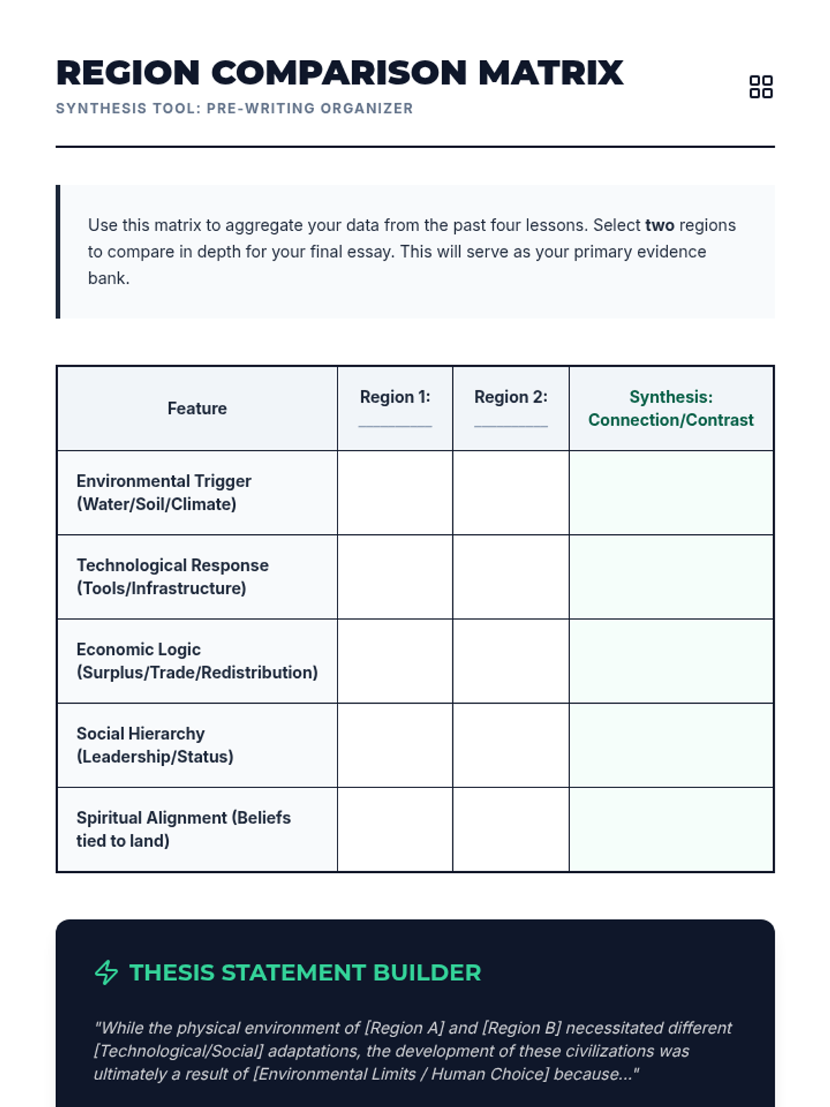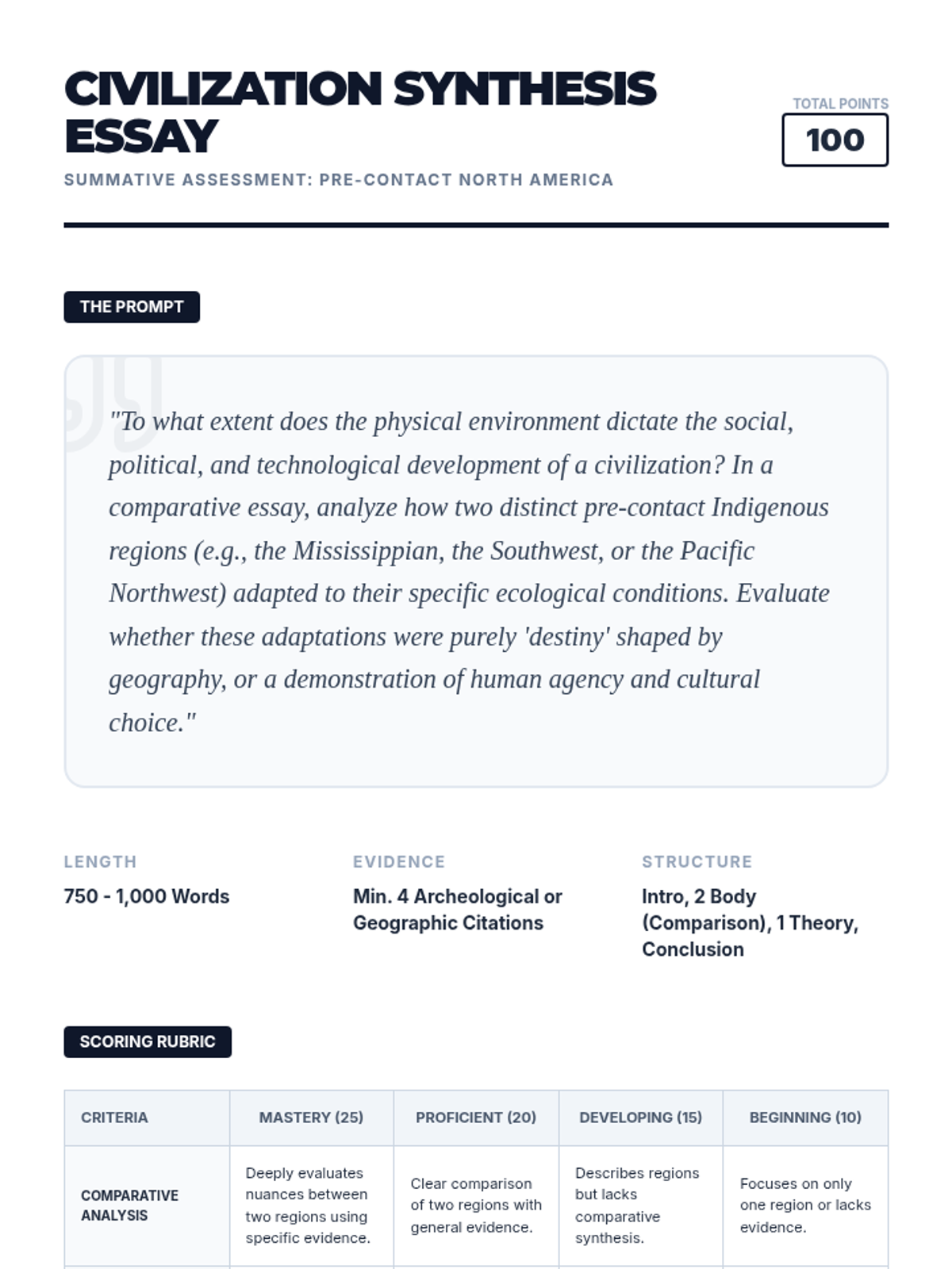 This inquiry-based sequence examines the profound relationship between physical geography and the development of pre-contact Indigenous cultures in North America, focusing on technological, agricultural, and social adaptations.