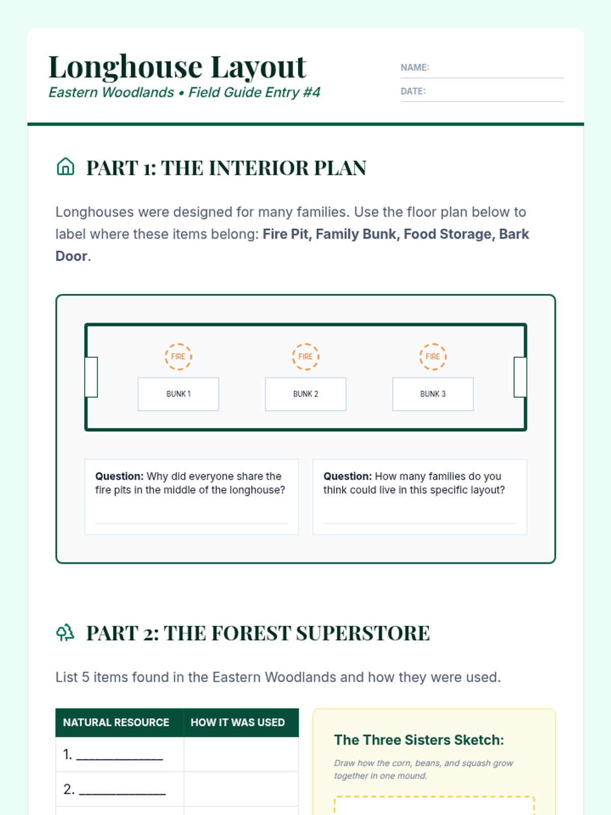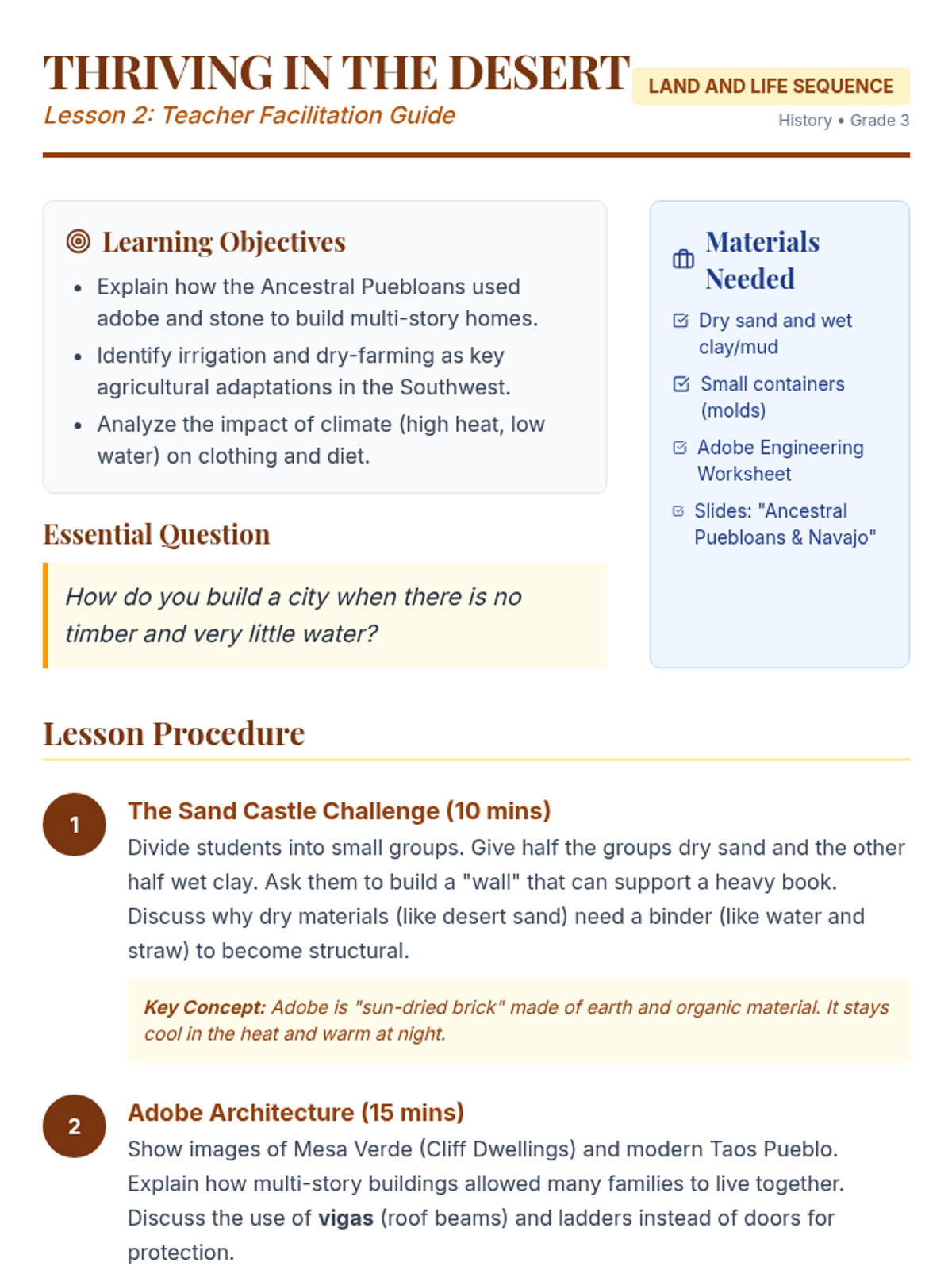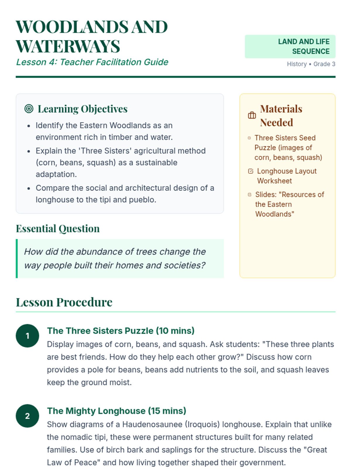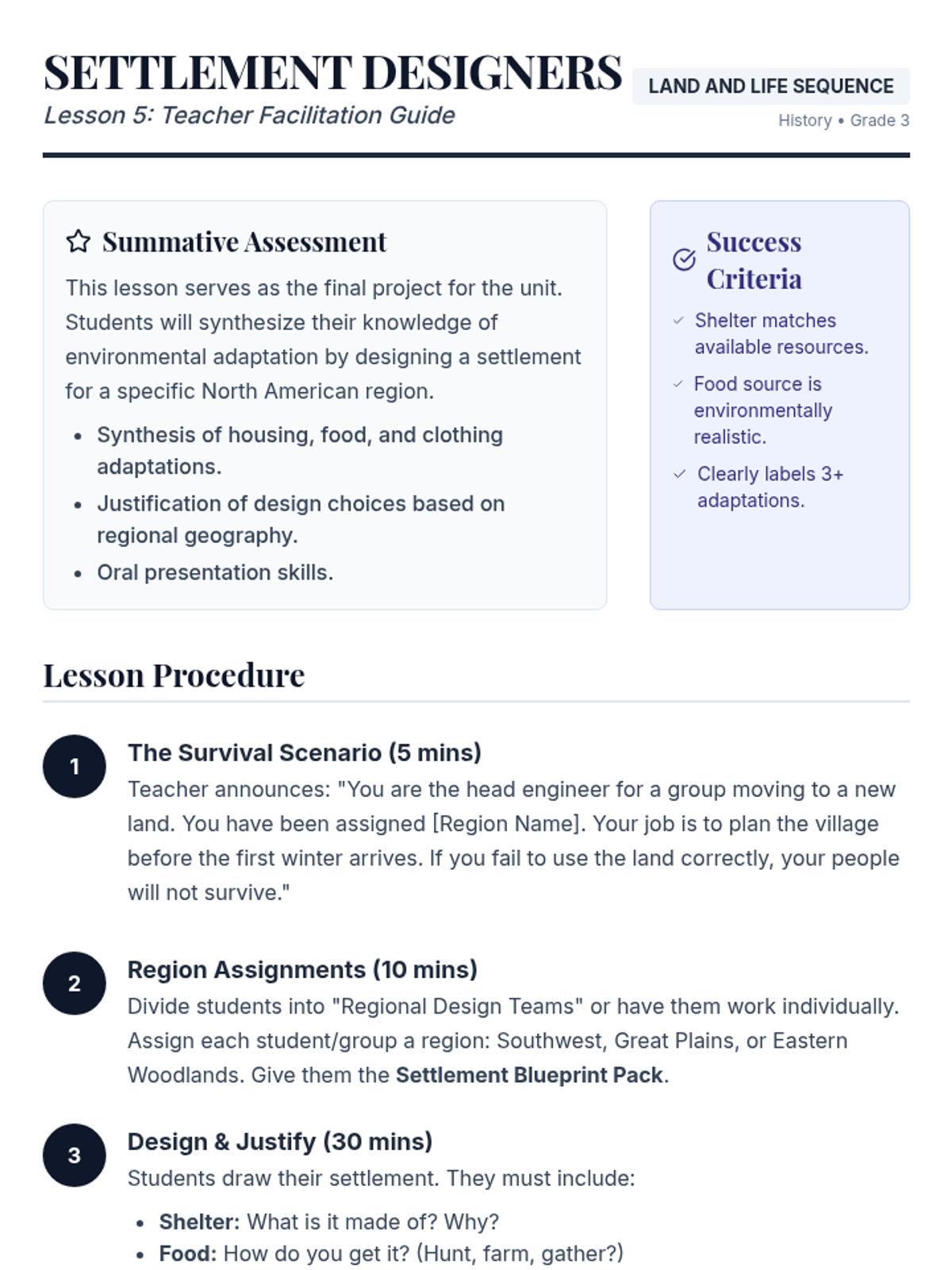 A 3rd-grade history sequence exploring how geography and natural resources shaped the diverse cultures of Indigenous peoples in North America, focusing on the Southwest, Plains, and Eastern Woodlands. Students investigate environmental adaptations in housing, food, and clothing through inquiry and design thinking.
