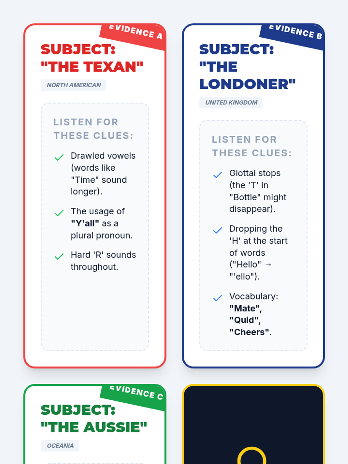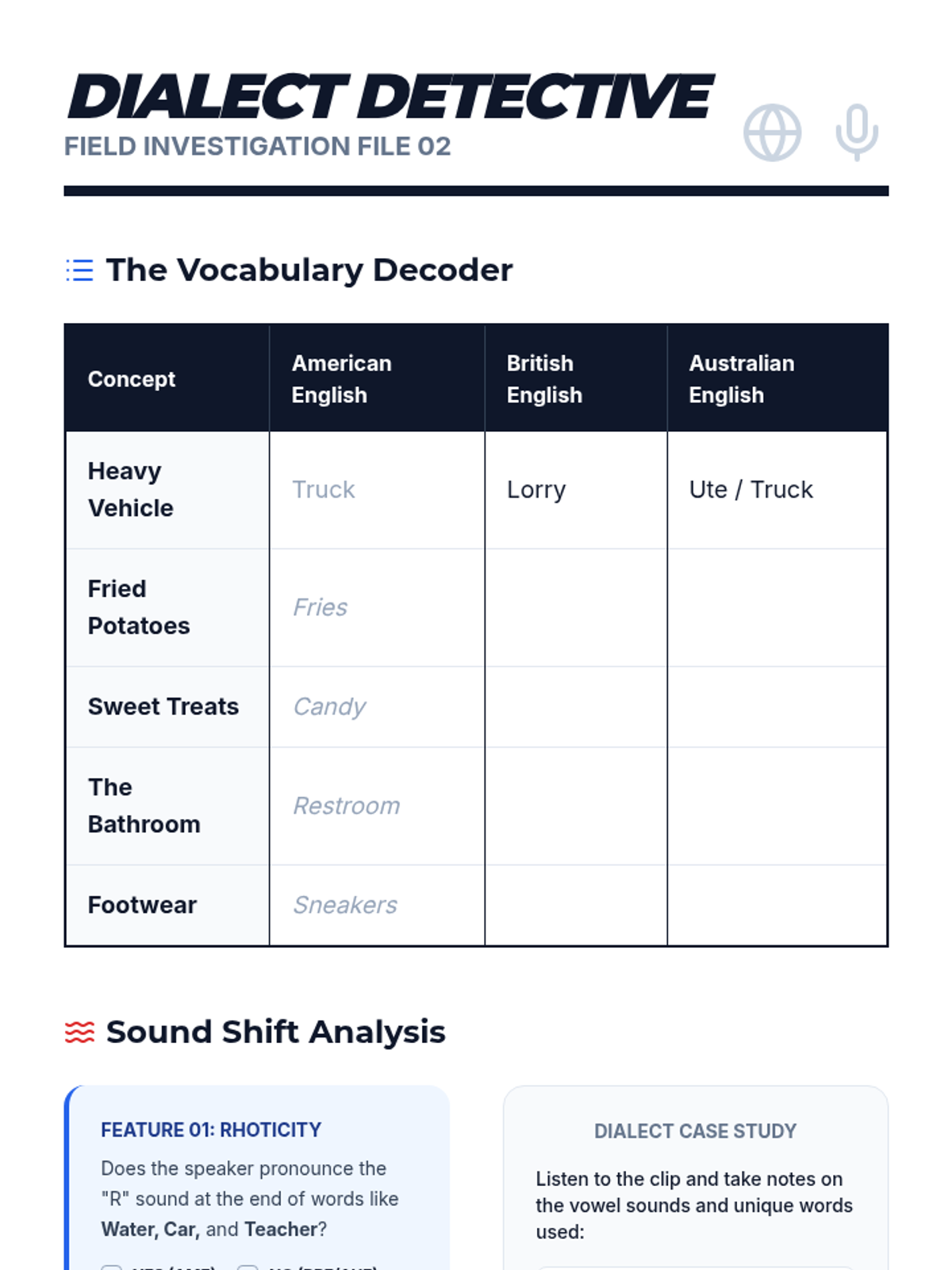 This sequence challenges students to move beyond 'textbook English' to decode the realities of natural, fast-paced speech, including regional dialects and connected speech phenomena. Students investigate how sounds change, disappear, or merge in casual conversation (assimilation and elision) and explore major English accents (American, British, Australian). Through inquiry and case studies of real-world media, students learn to navigate the variability of the English language with confidence.