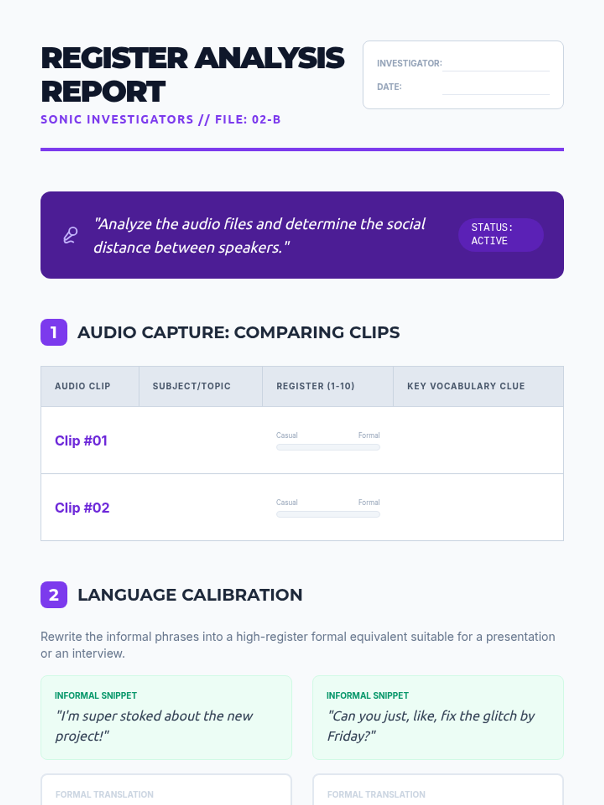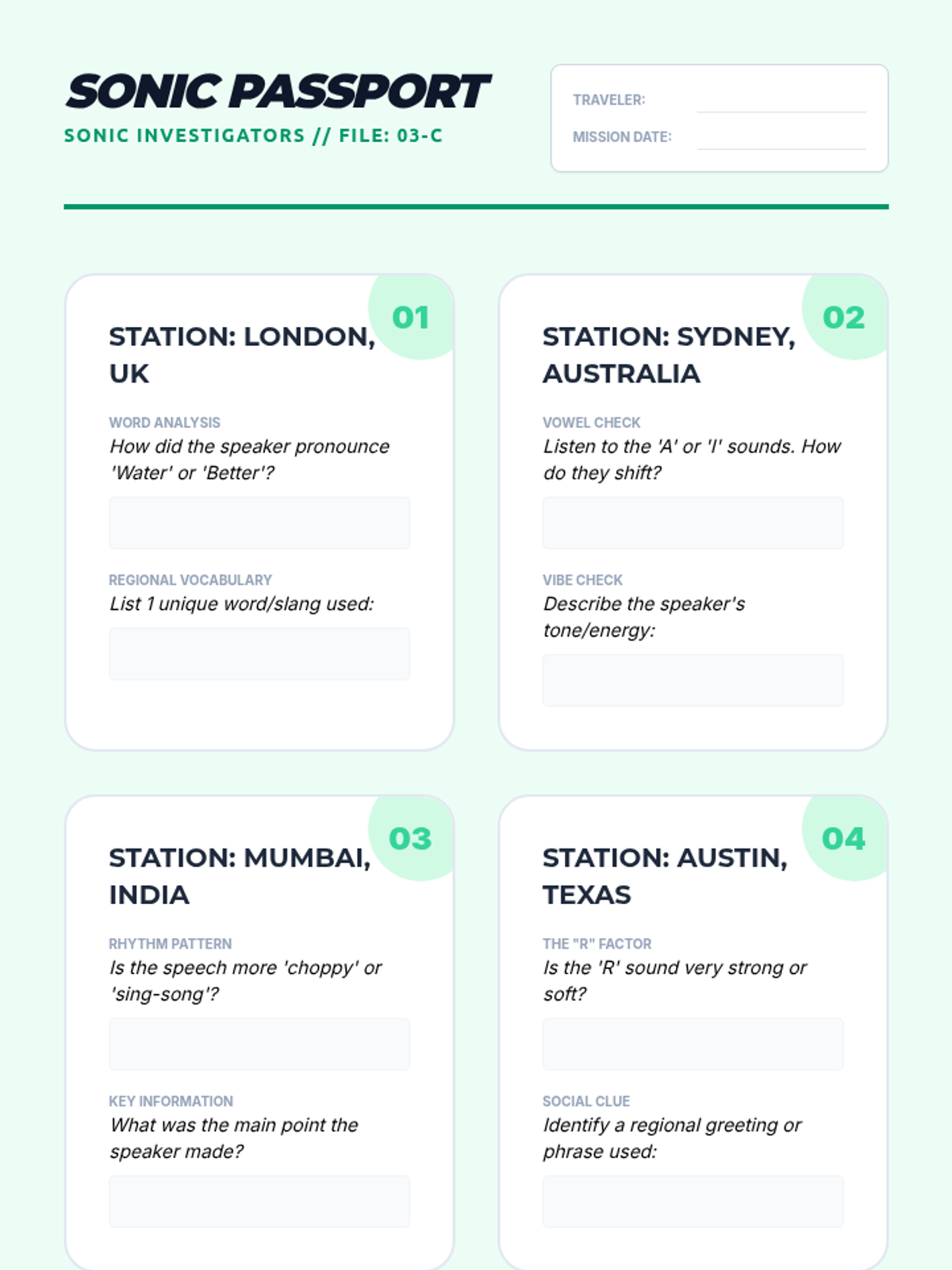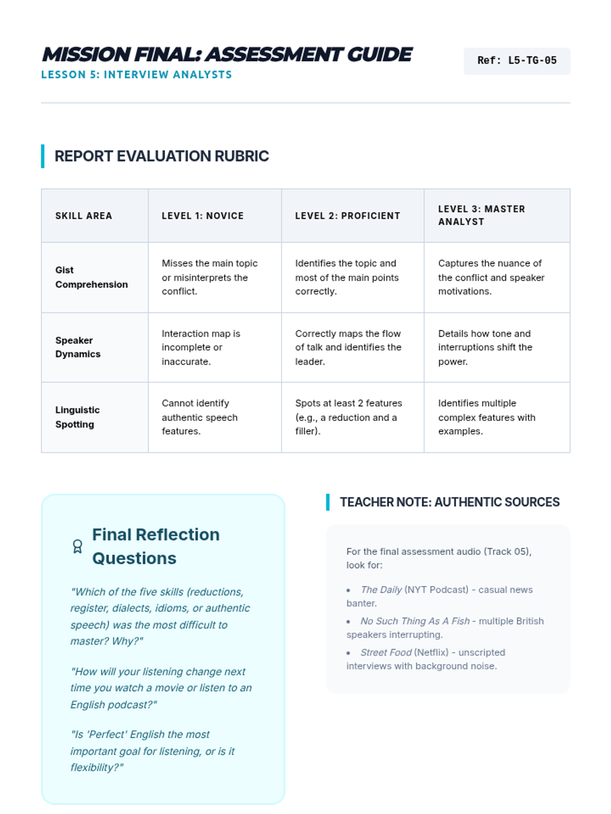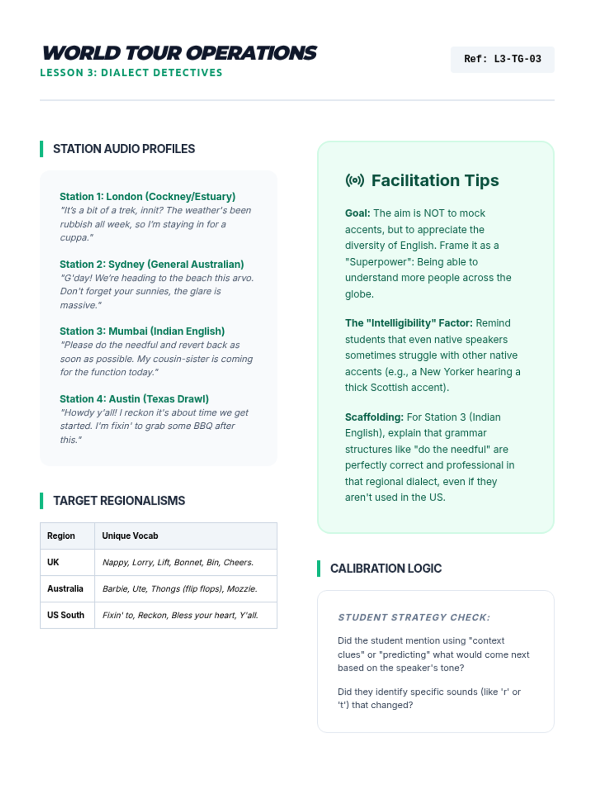 Students explore English beyond the textbook, focusing on authentic fast-paced speech, regional dialects, and varying registers to improve real-world listening comprehension.
