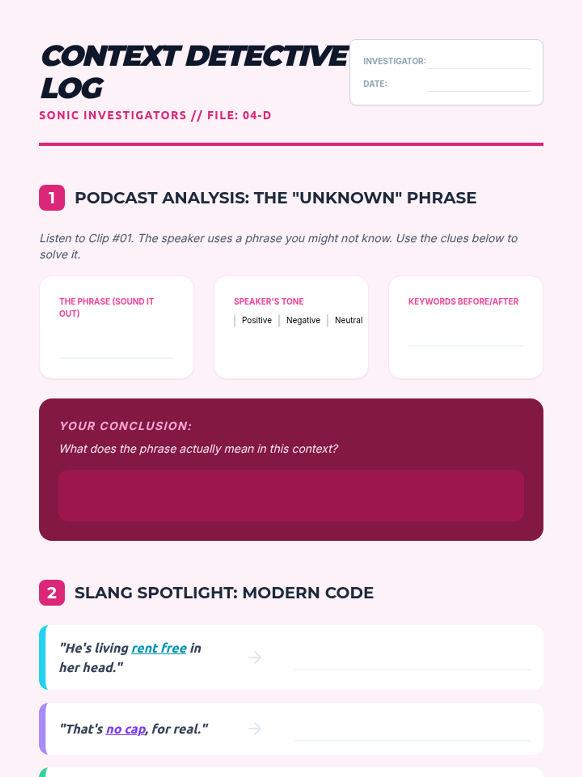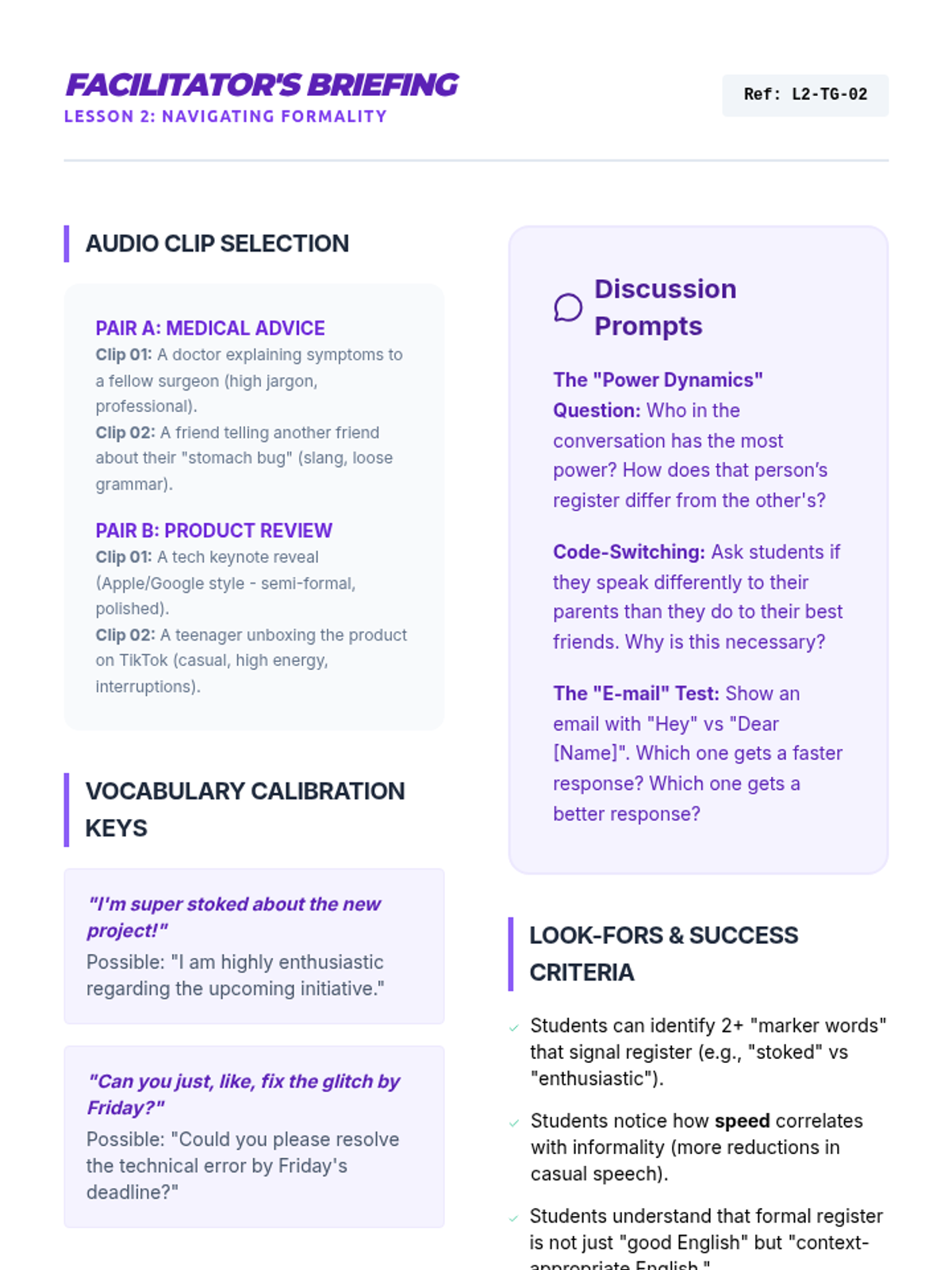 This sequence for graduate ESL students explores the nuances of English beyond literal meaning. Students will master the ability to detect sarcasm, bias, contrastive stress, and professional register, equipping them for complex academic and professional communication.
