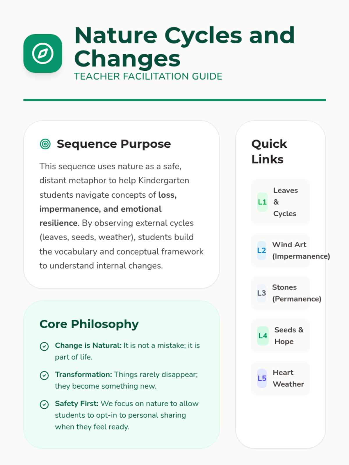 A Kindergarten sequence using nature as a metaphor for loss, change, and hope. Students explore cycles of life through leaves, seeds, and seasons to build emotional resilience and understanding of impermanence.