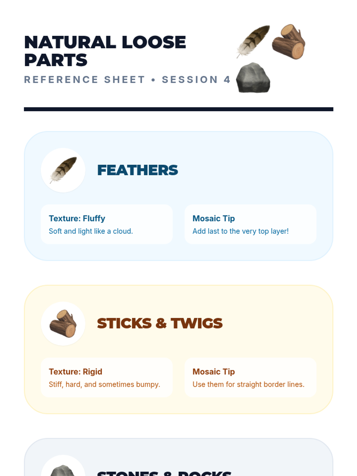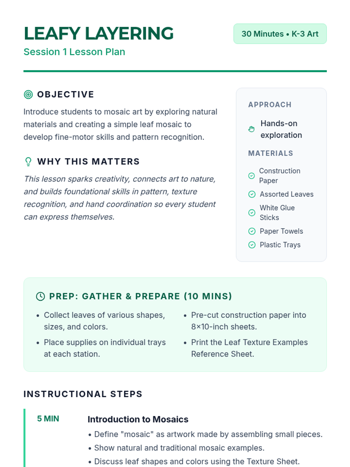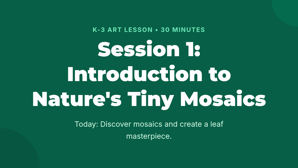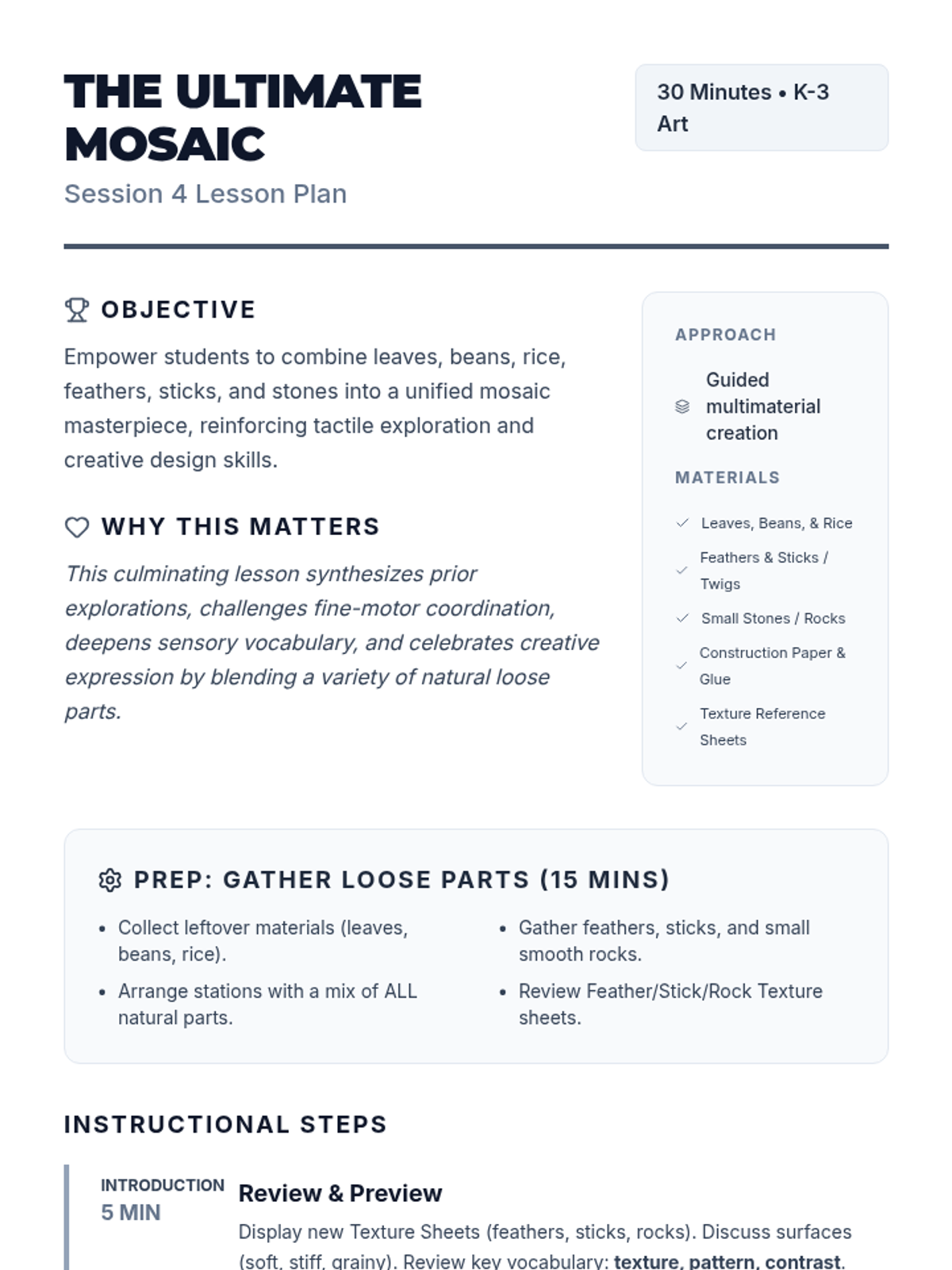 A four-session art unit where K-3 students explore natural textures, colors, and patterns to create mosaic masterpieces using leaves, beans, rice, and other organic materials.