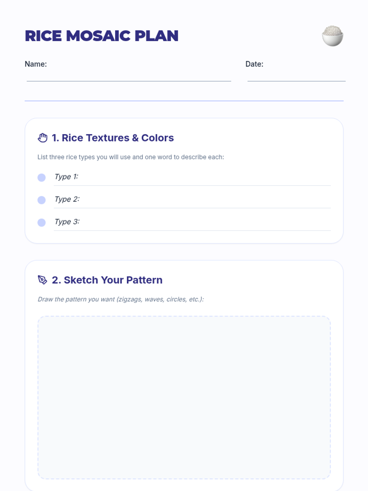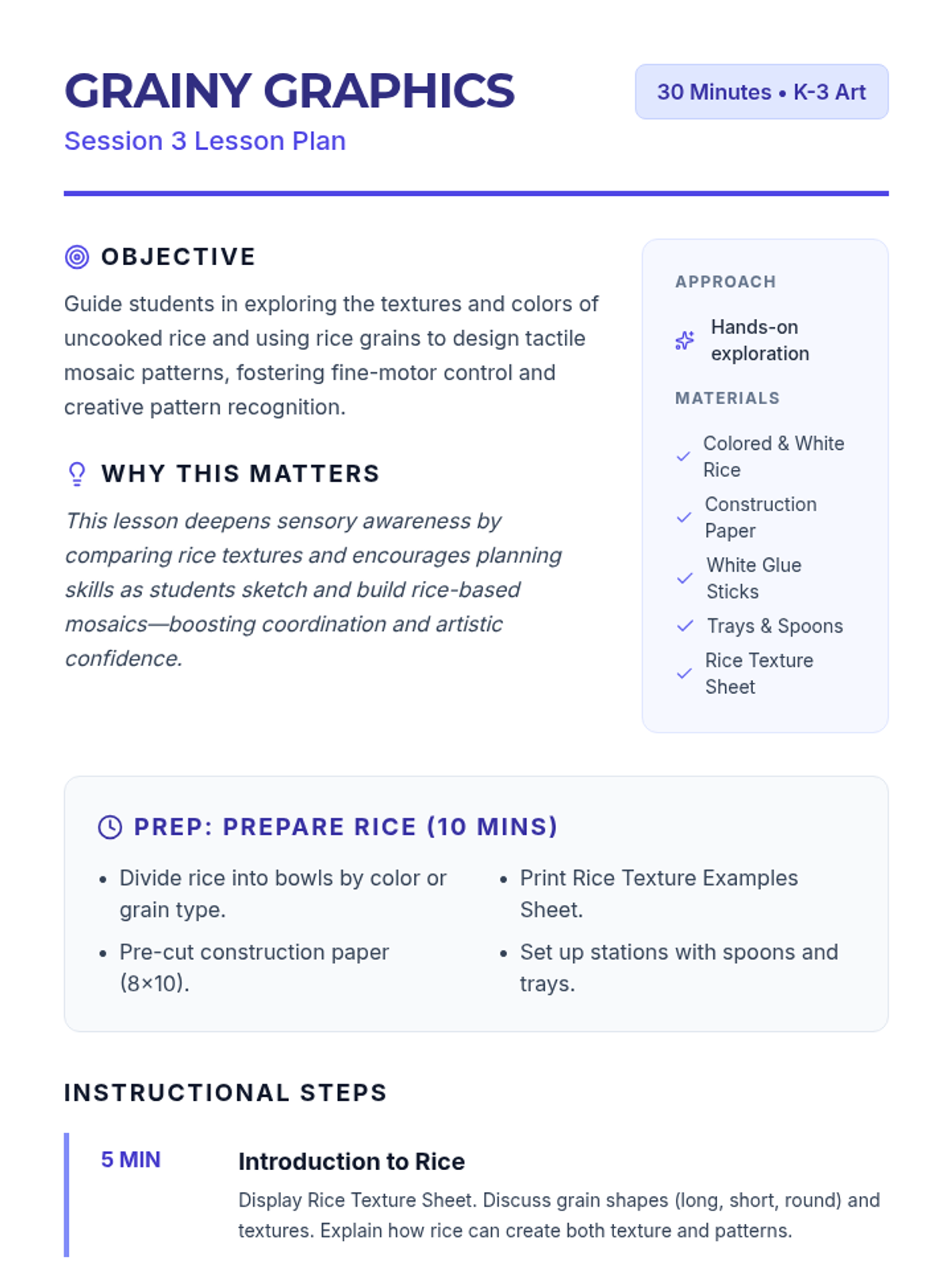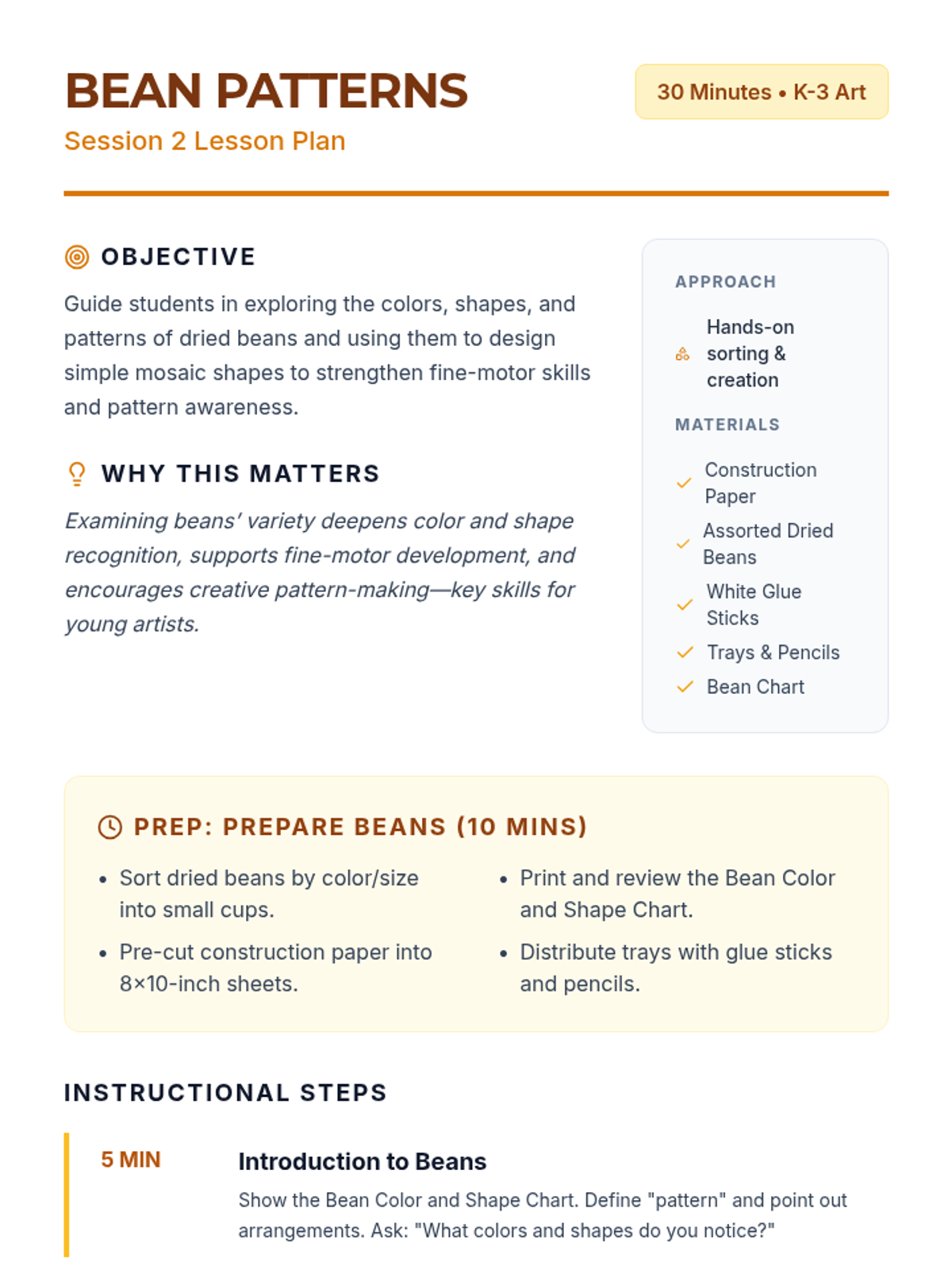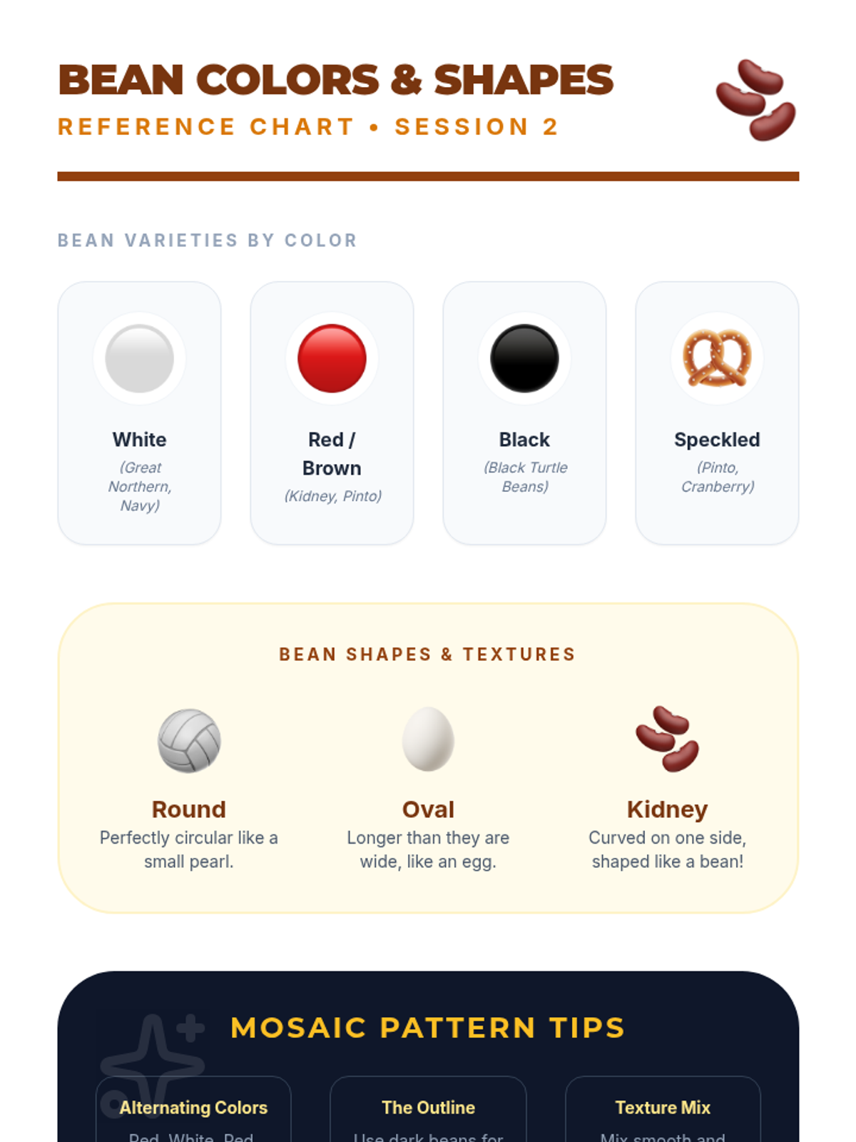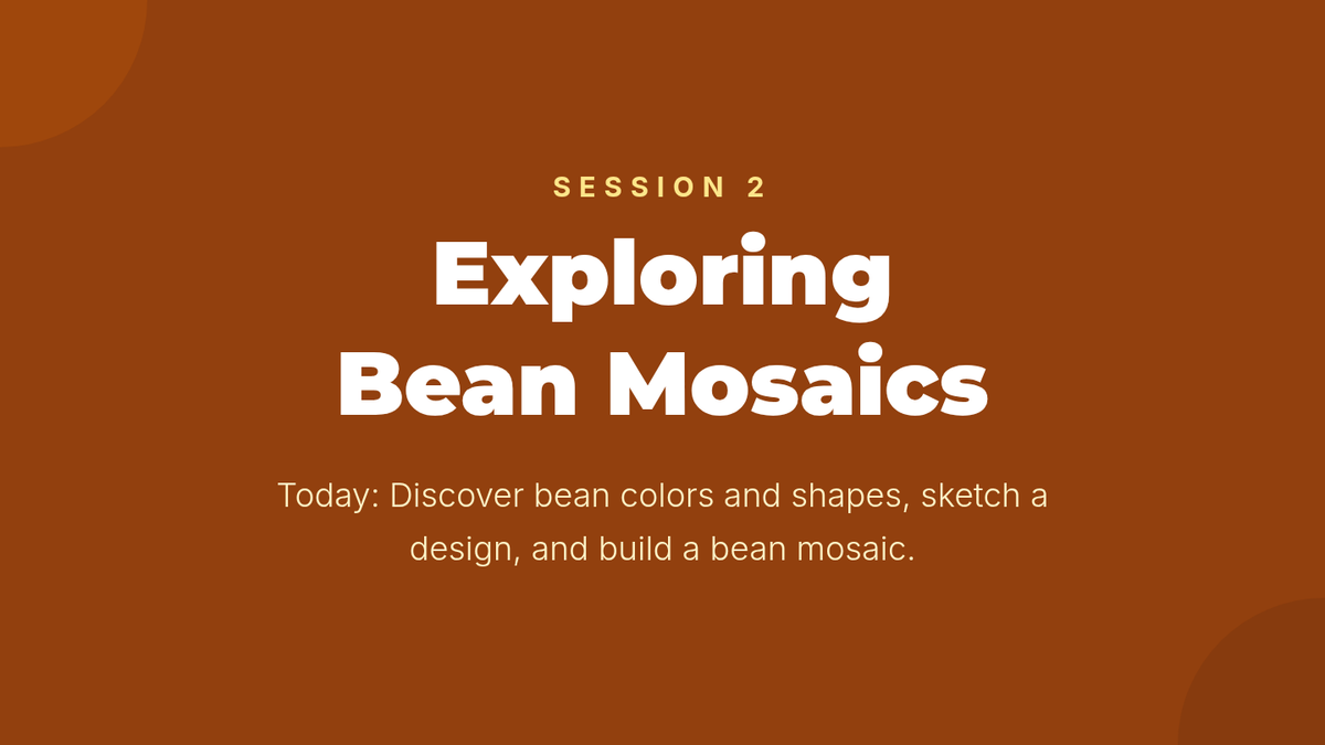A four-session art unit where K-3 students explore natural textures, colors, and patterns to create mosaic masterpieces using leaves, beans, rice, and other organic materials.