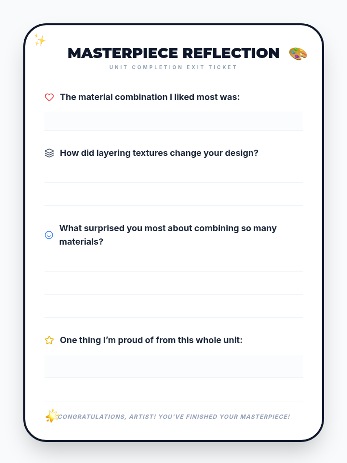 A 3-day collaborative art project where students transform recycled materials into large-scale sculptures while applying principles of design and creative problem-solving.