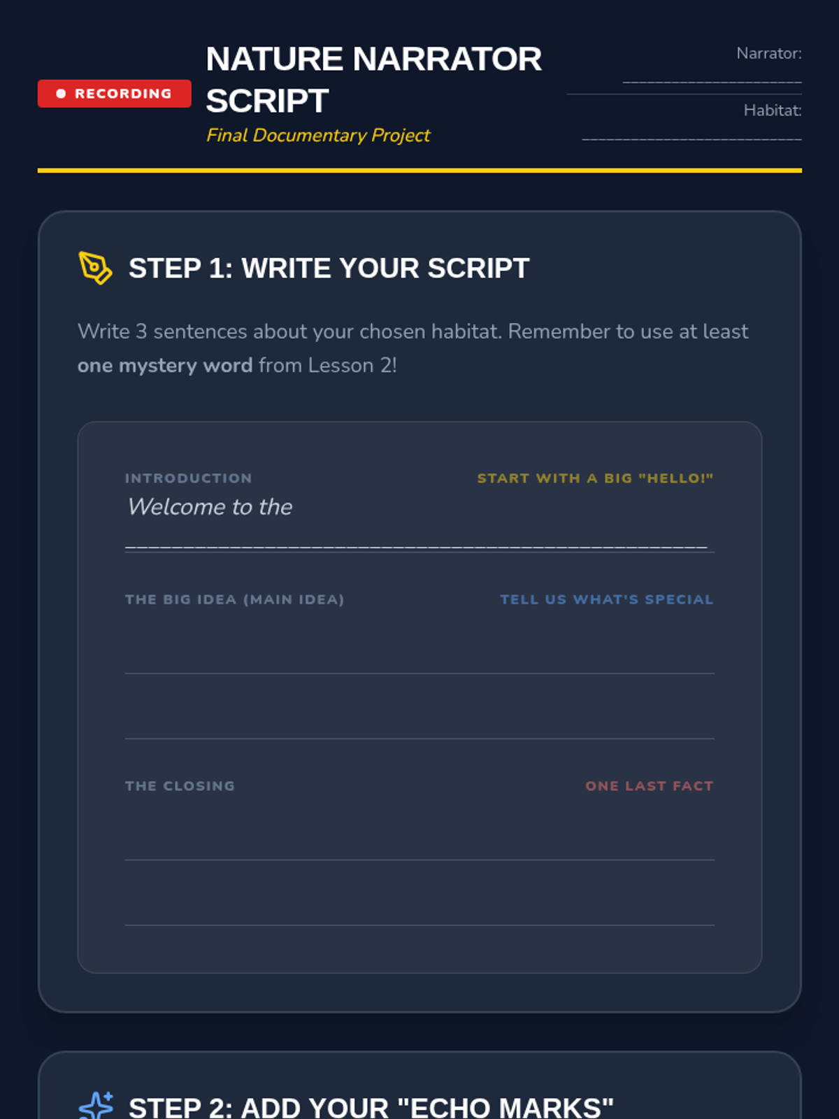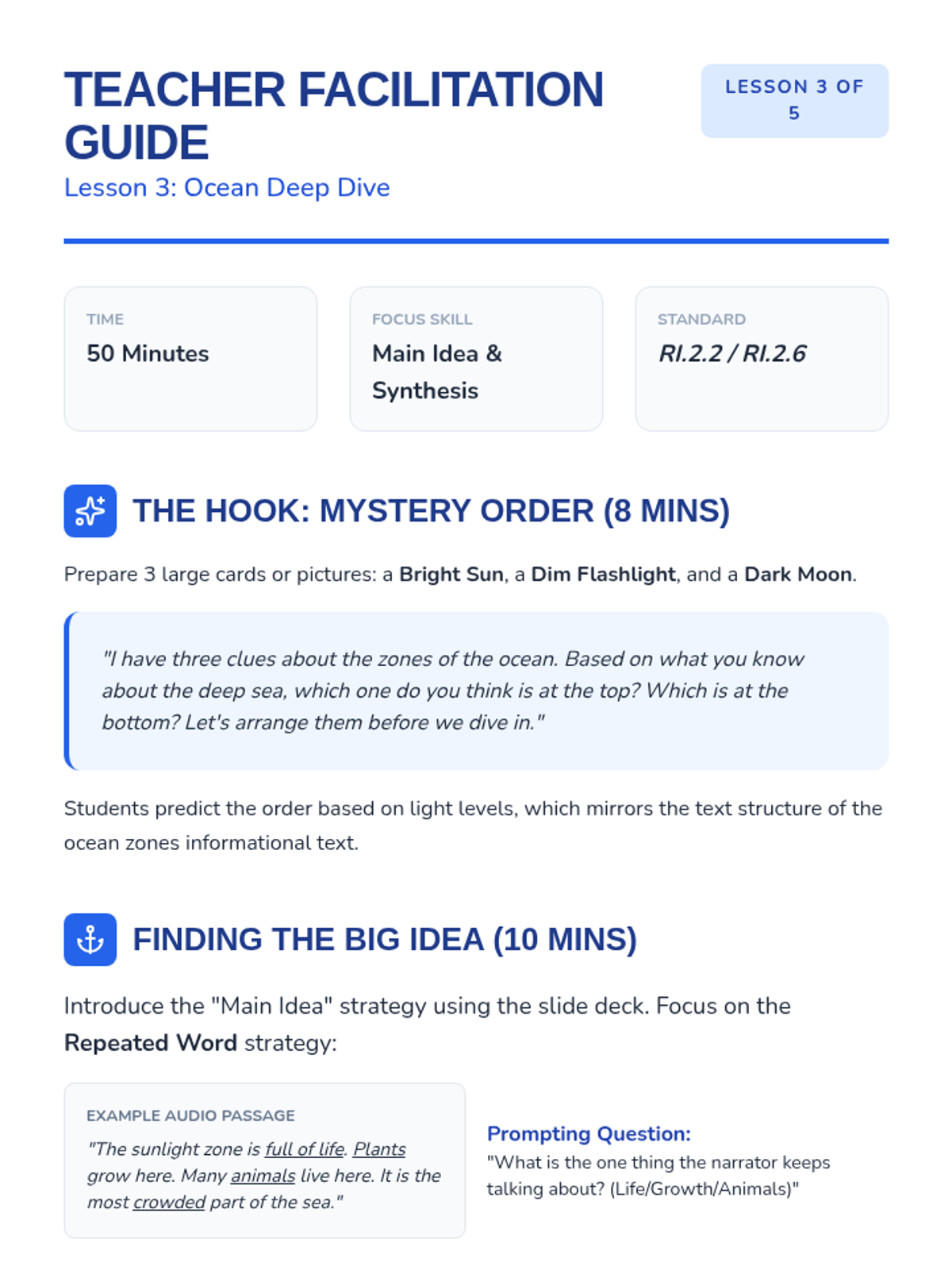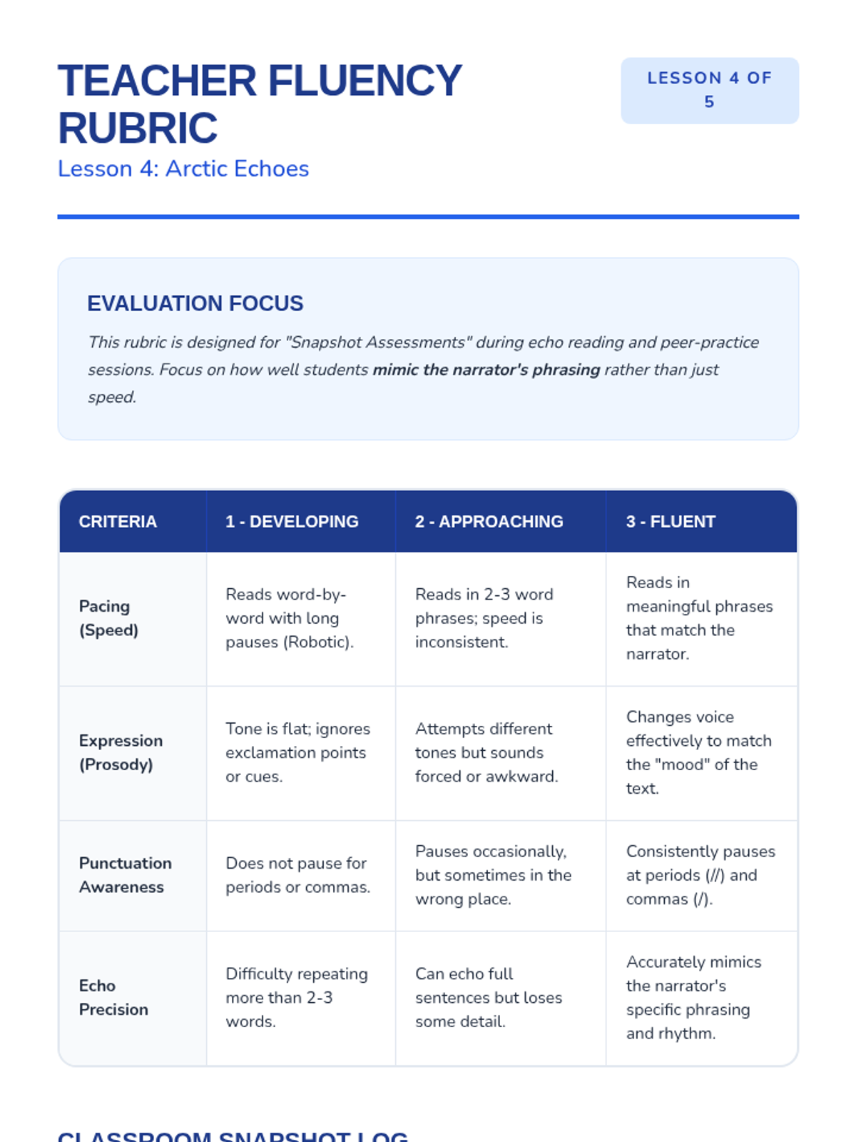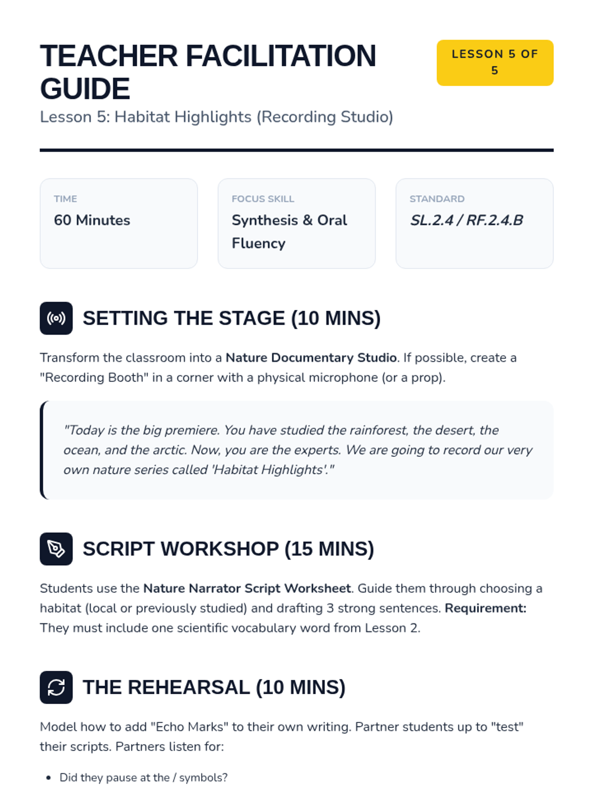 A 2nd-grade ELA sequence focused on reading fluency and comprehension through audio-supported informational texts. Students explore global habitats while mastering text tracking, vocabulary acquisition, main idea identification, and prosody.