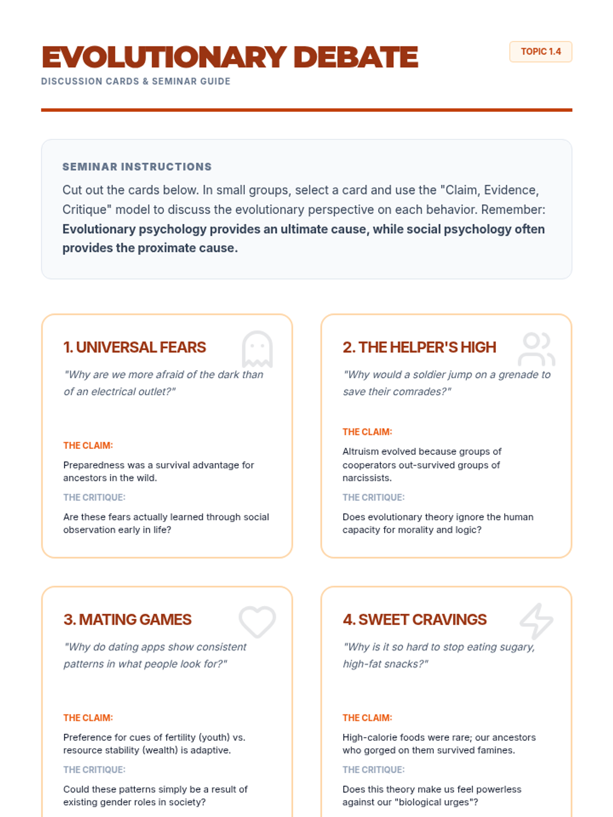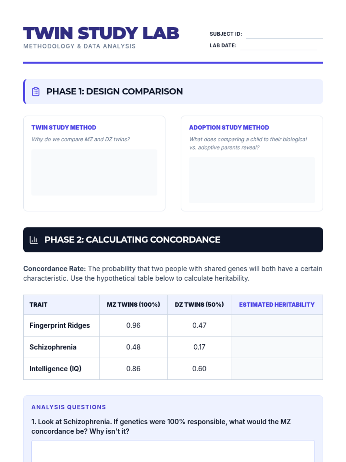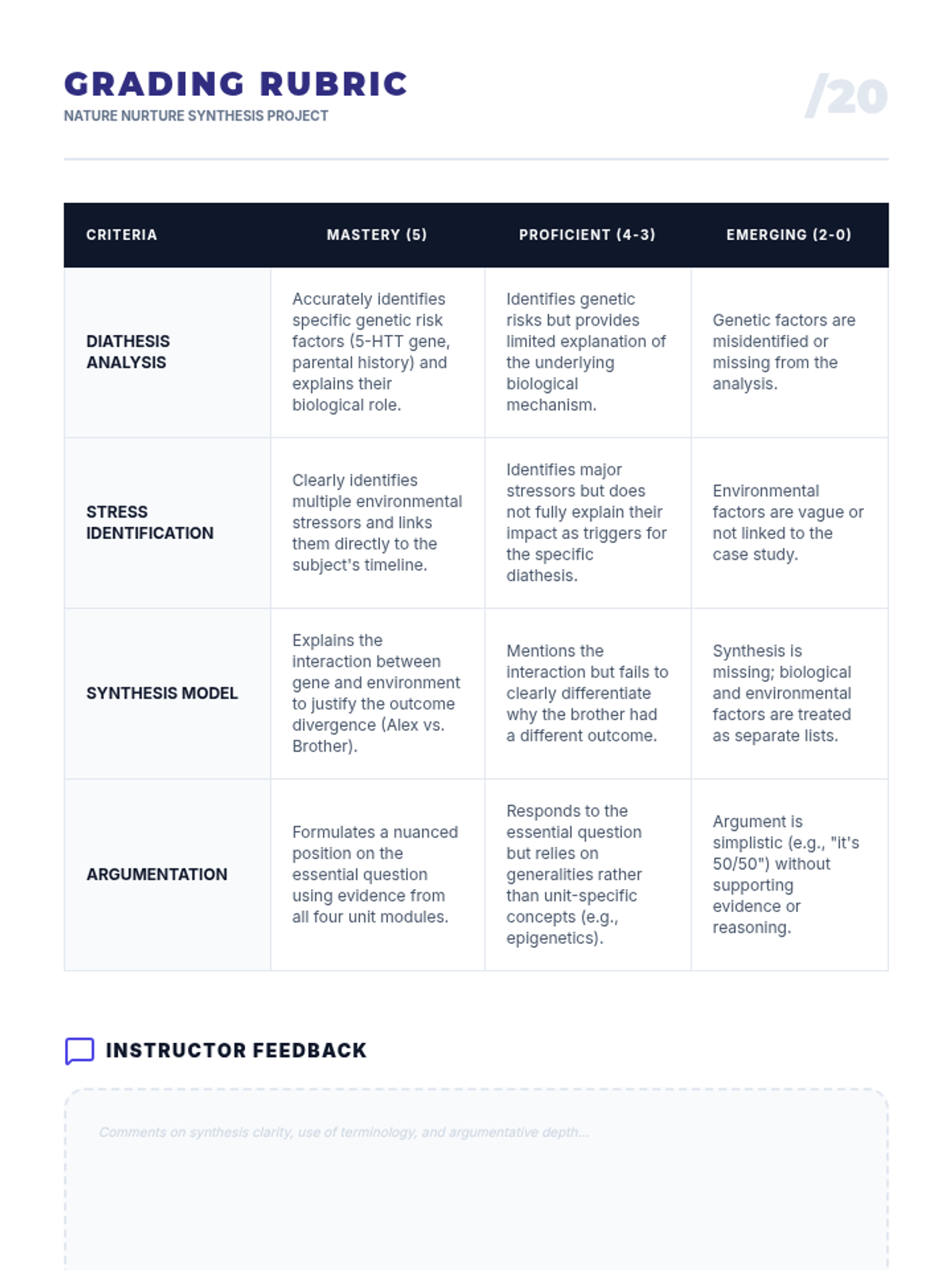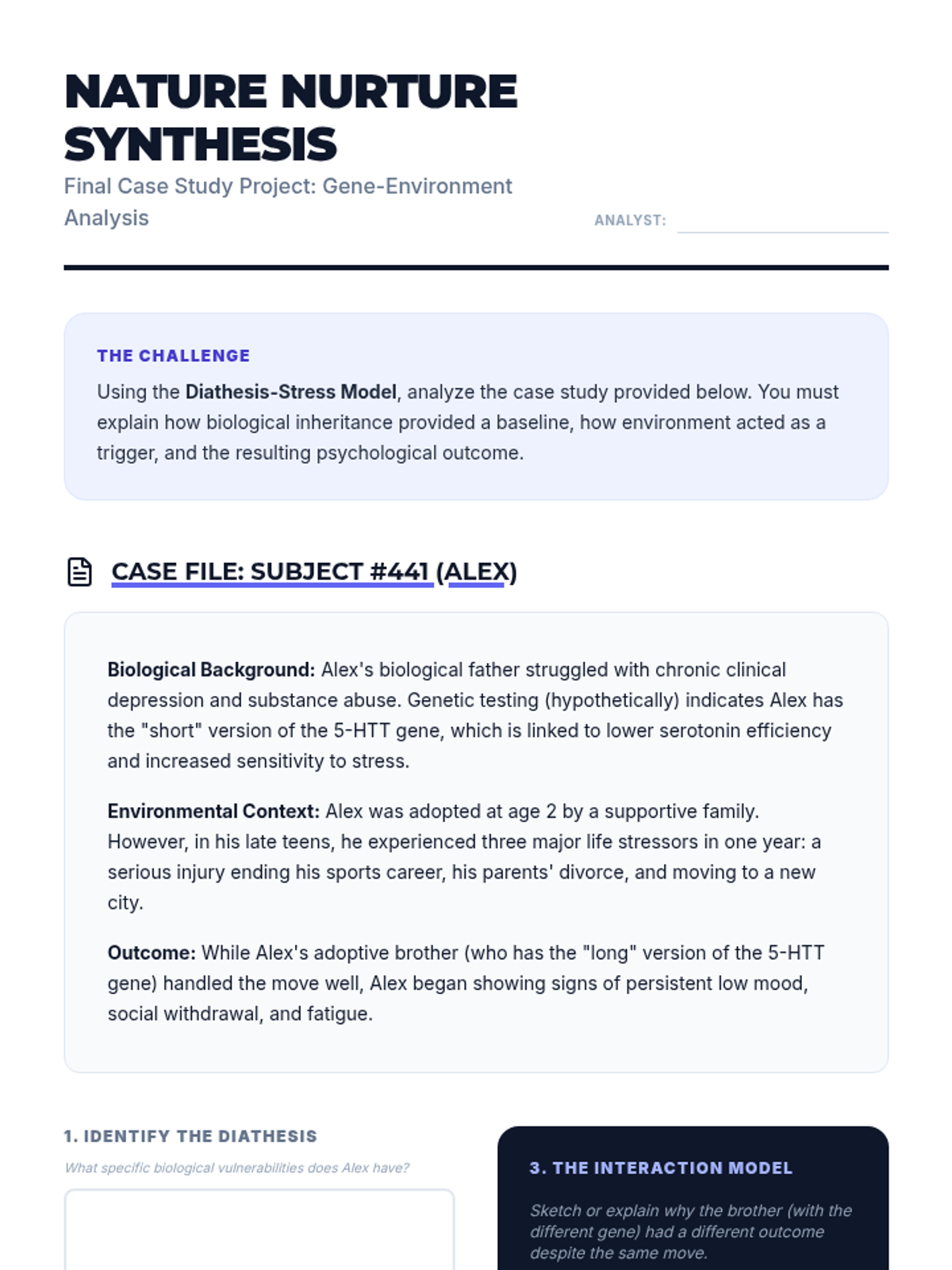 A comprehensive 11th-grade psychology sequence exploring the interaction between genetics and environment. Students investigate behavioral genetics, twin studies, epigenetics, and evolutionary psychology to understand how nature and nurture combine to shape human behavior and mental health.