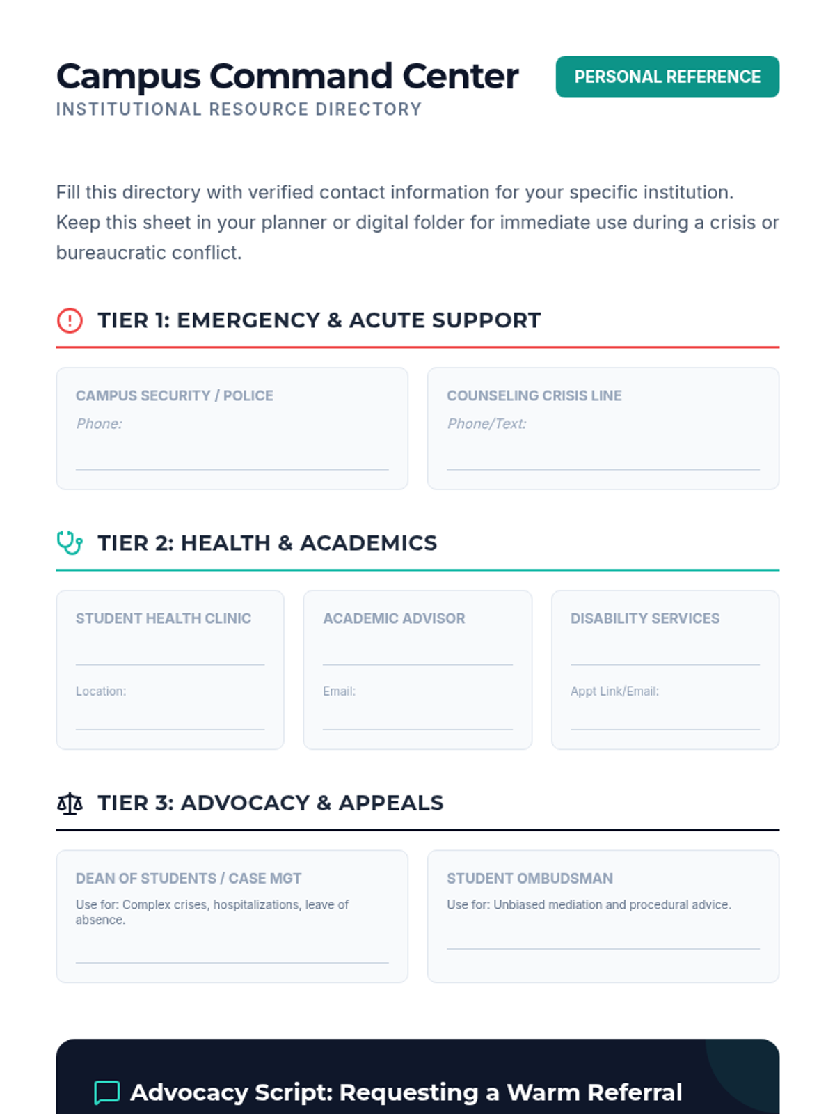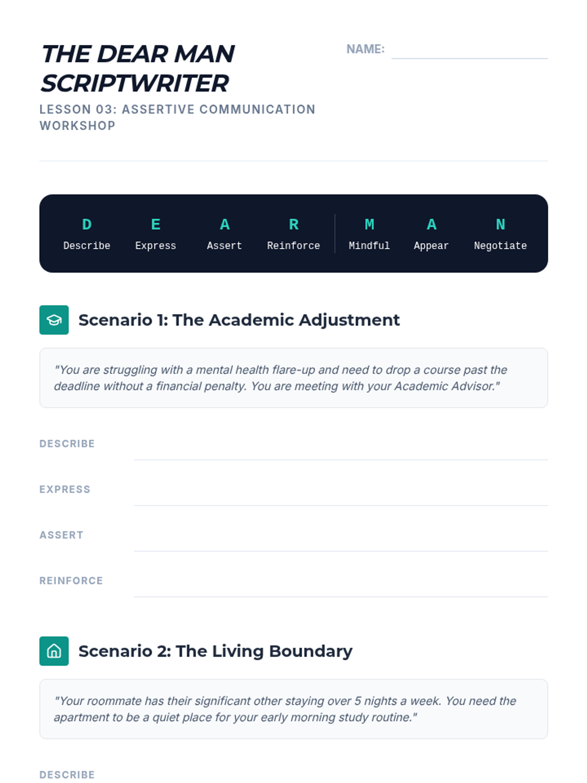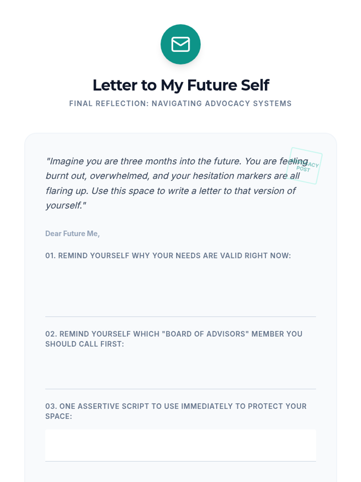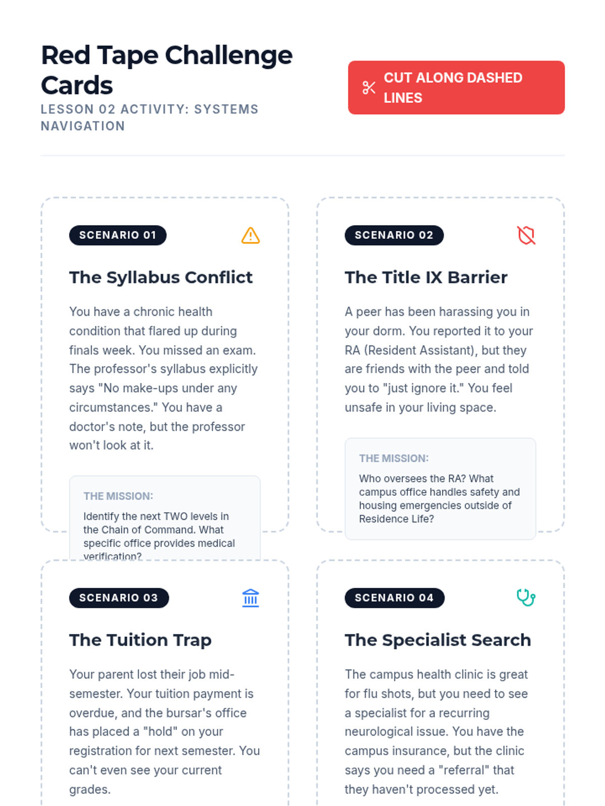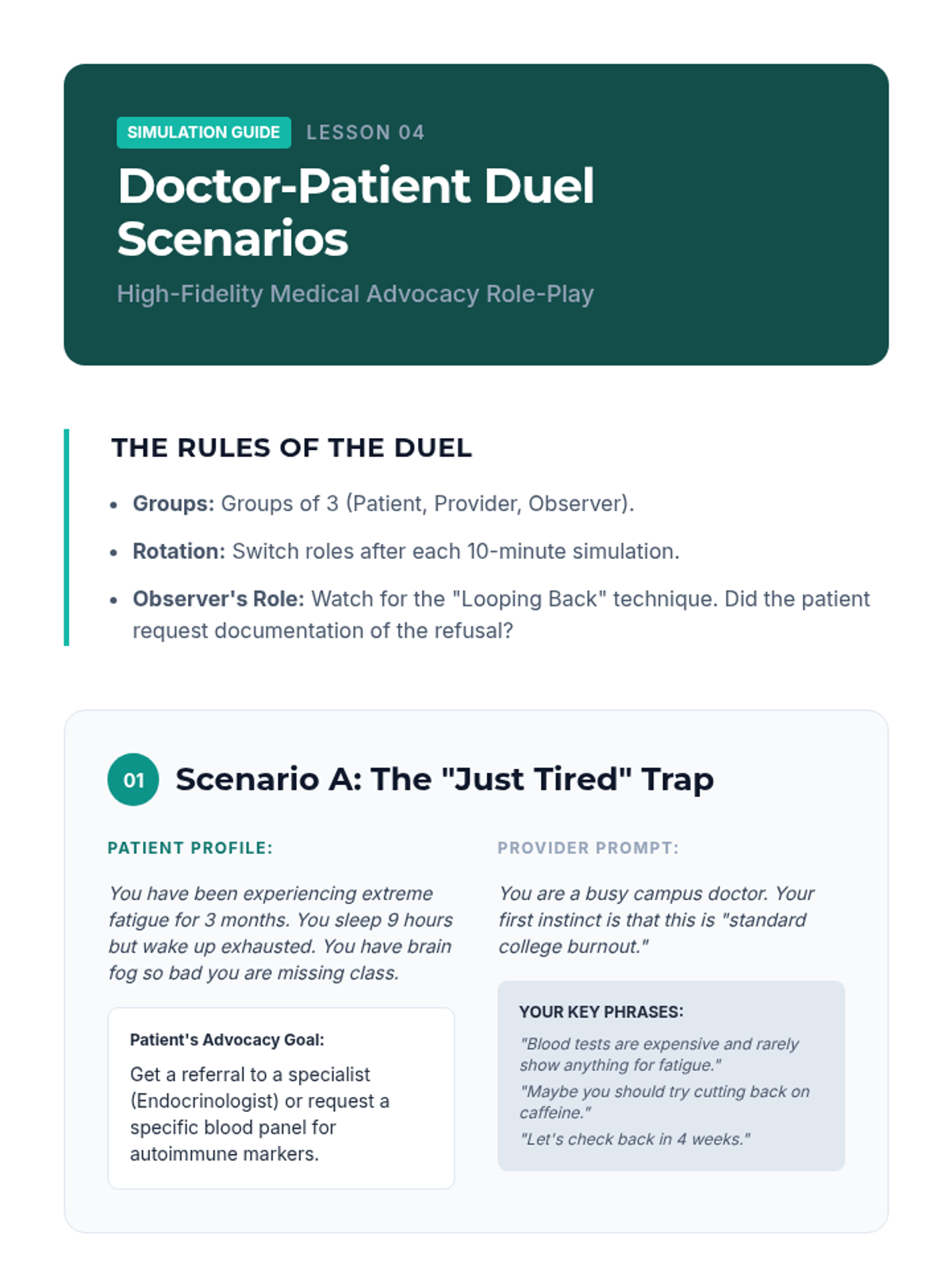 This sequence equips undergraduate students with strategies for self-advocacy within medical, academic, and professional environments, analyzing structural barriers and practicing assertive communication.