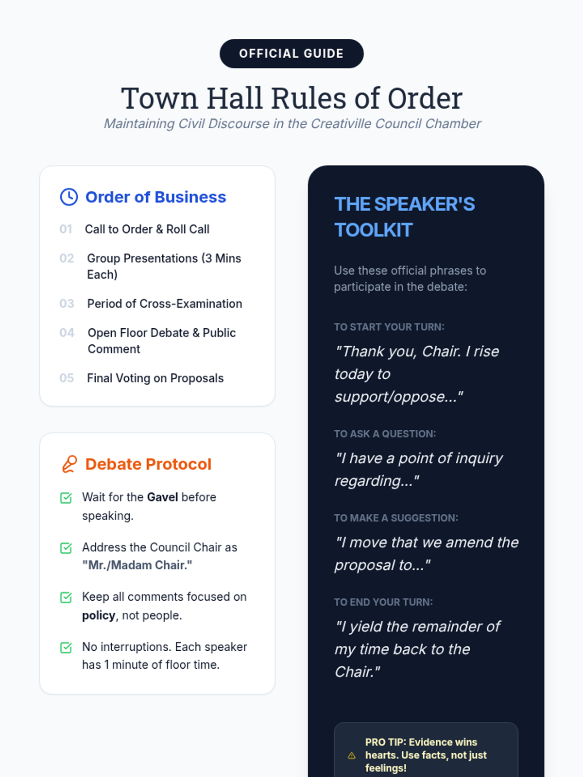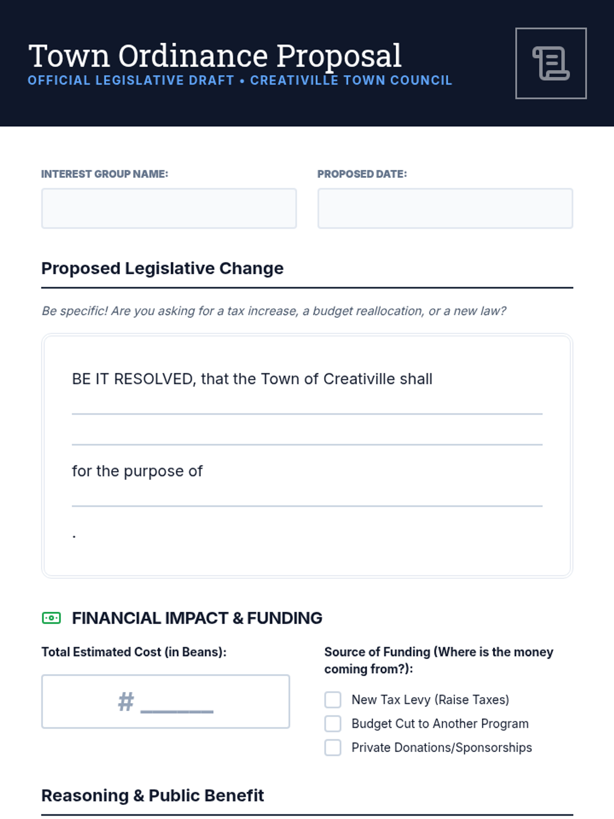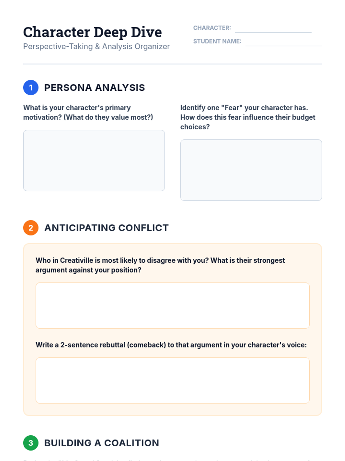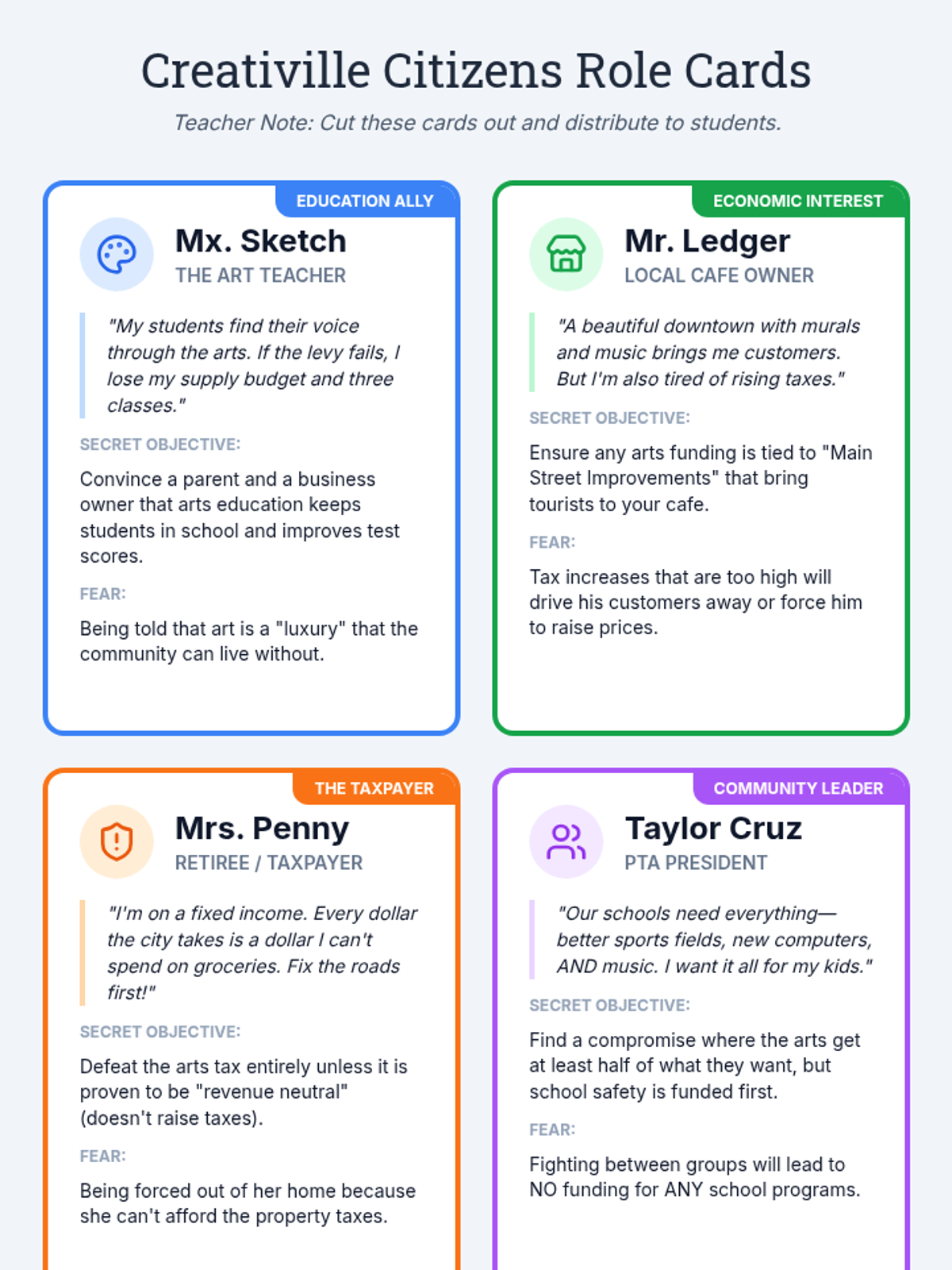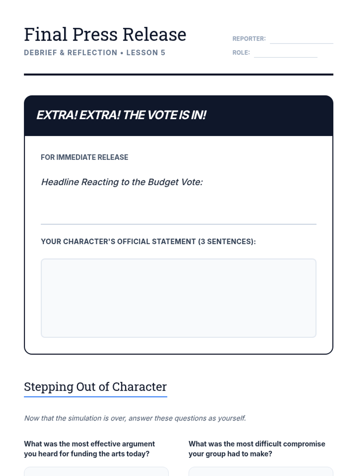 Students participate in an immersive simulation where they navigate the world of arts policy and resource allocation. They take on roles in a community debate over funding priorities, learning about public budgeting, perspective-taking, and the necessity of civic engagement.