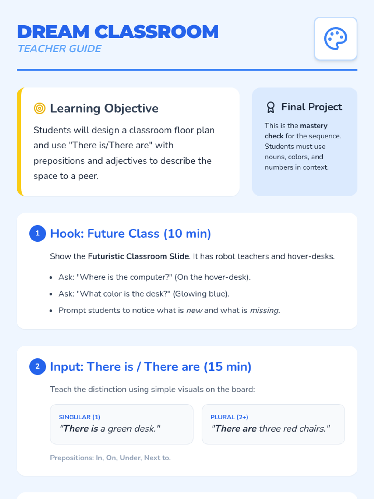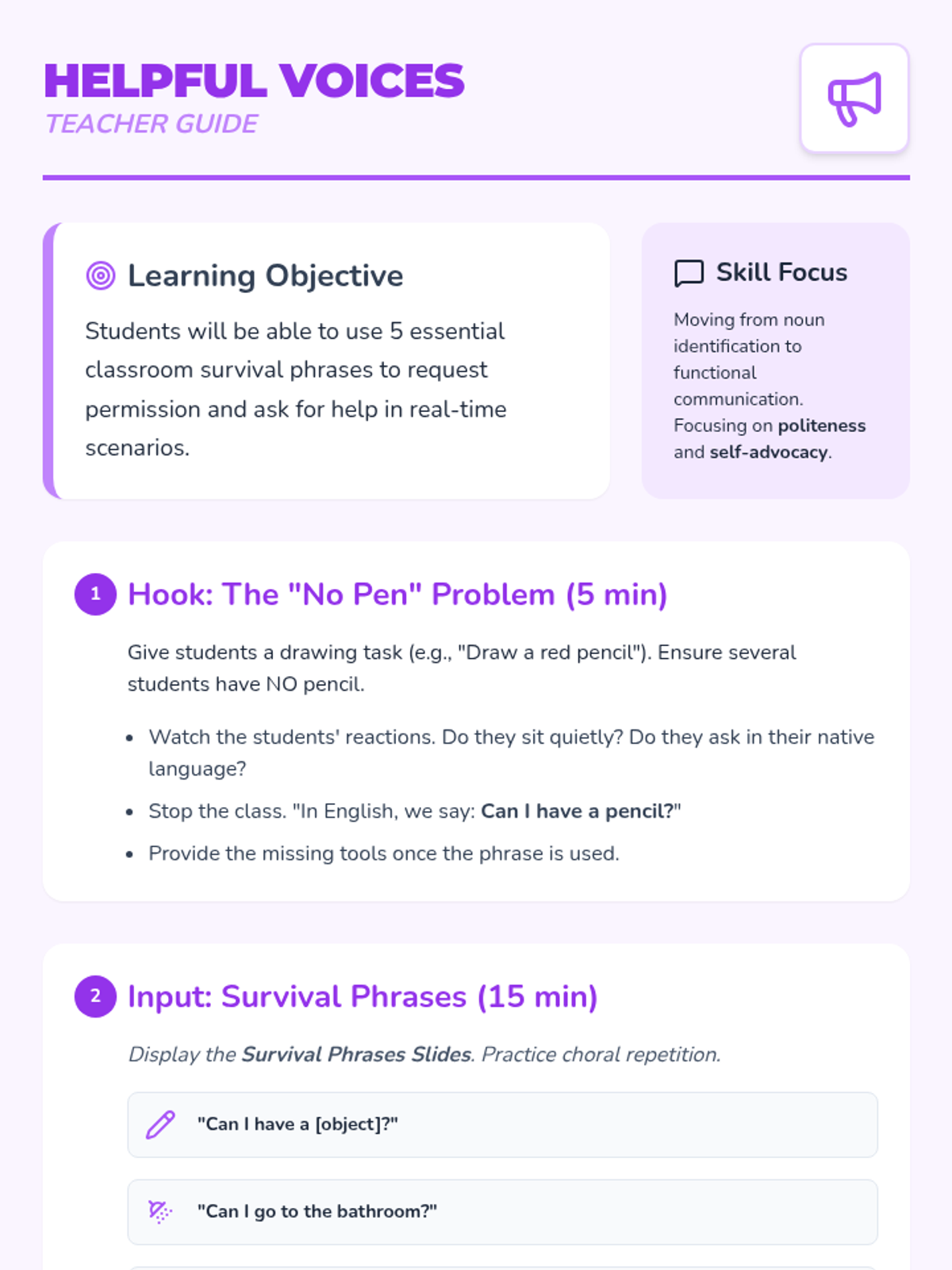 This sequence immerses intermediate ESL students in the nuances of casual English conversation, focusing on idiomatic expressions, emotional intonation, and social registers. Students transition from literal understanding to figurative fluency through inquiry, simulation, and performance.