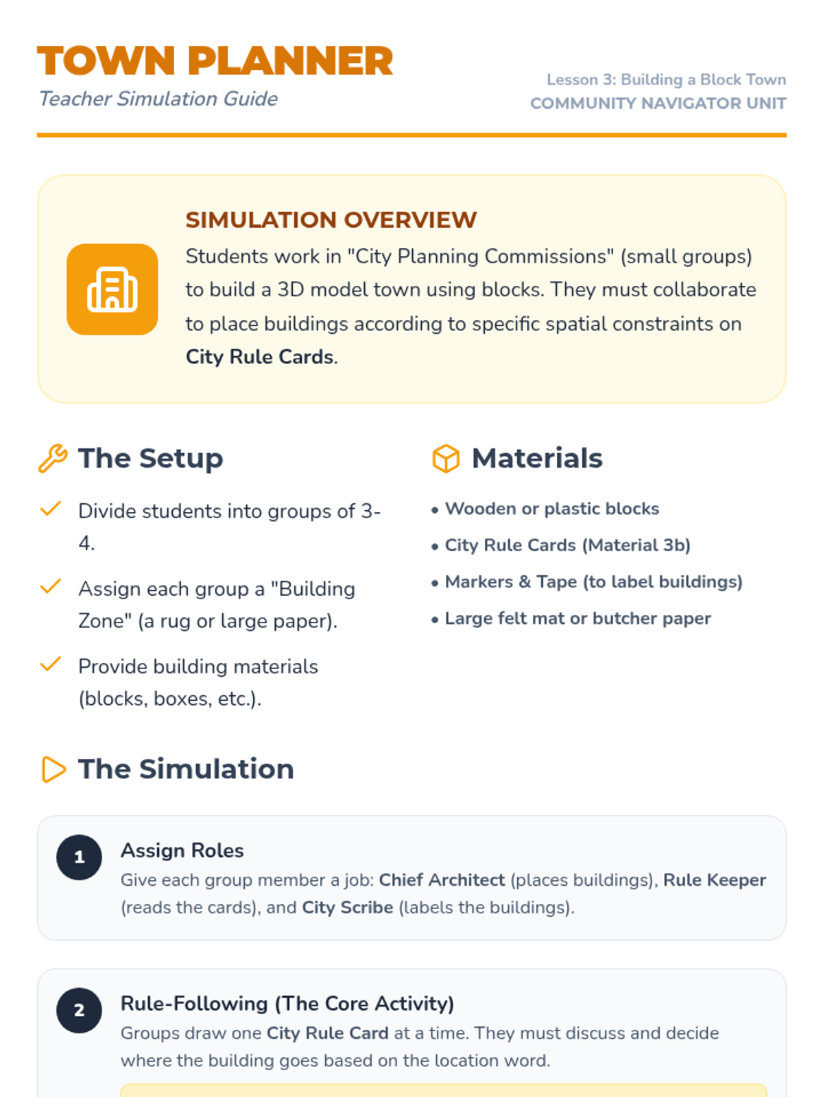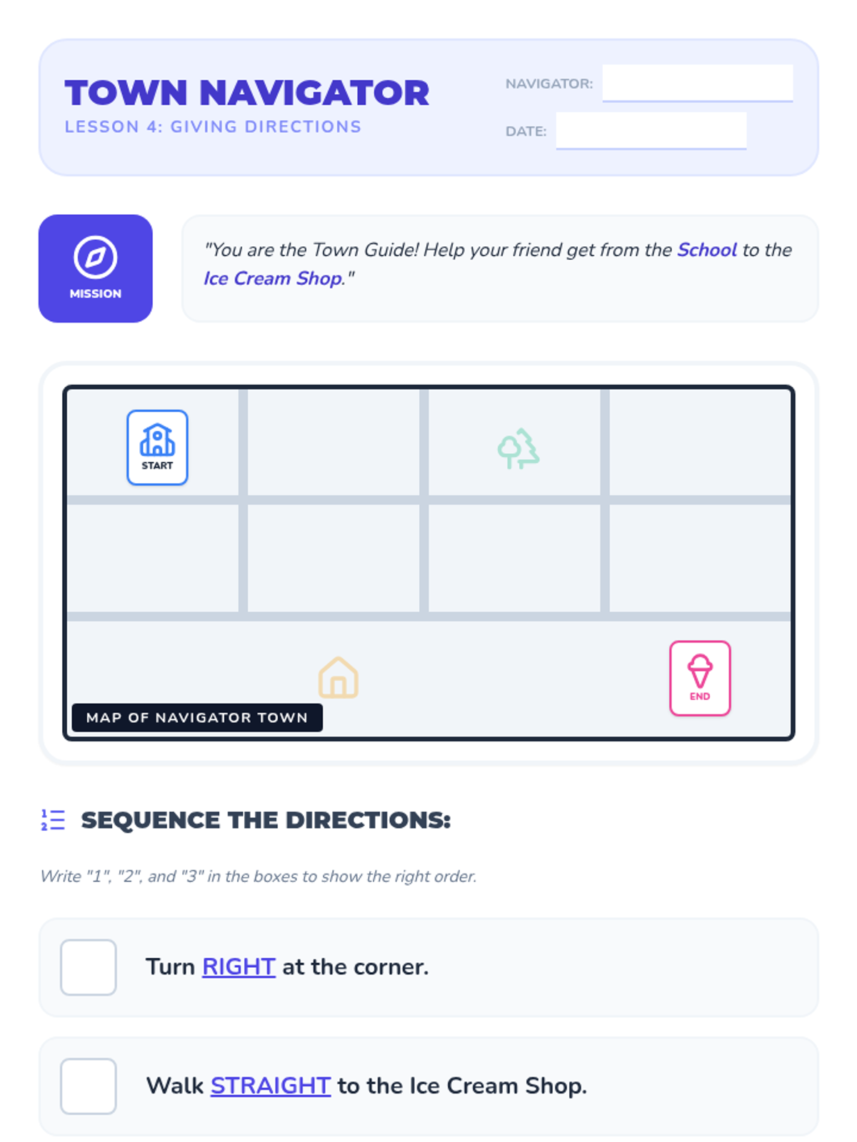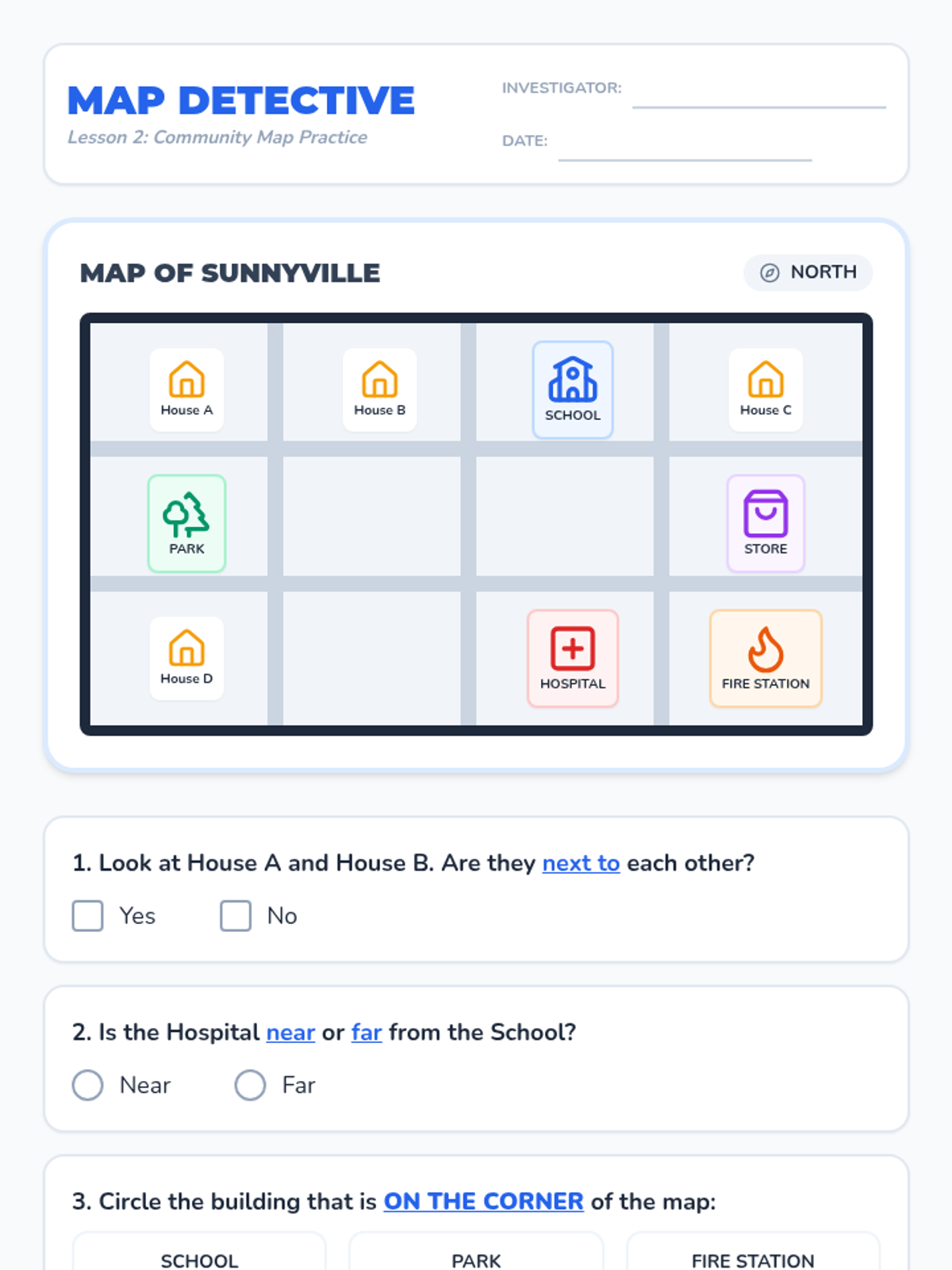 A 1st-grade social studies sequence focused on spatial awareness and directional terms, progressing from the home to a full community layout. Students learn to describe relative locations and give simple directions using a variety of hands-on and inquiry-based activities.