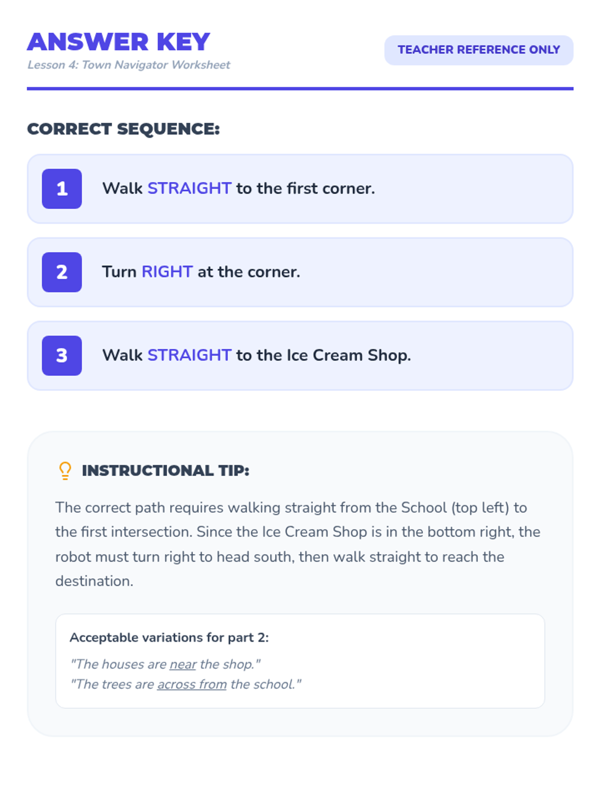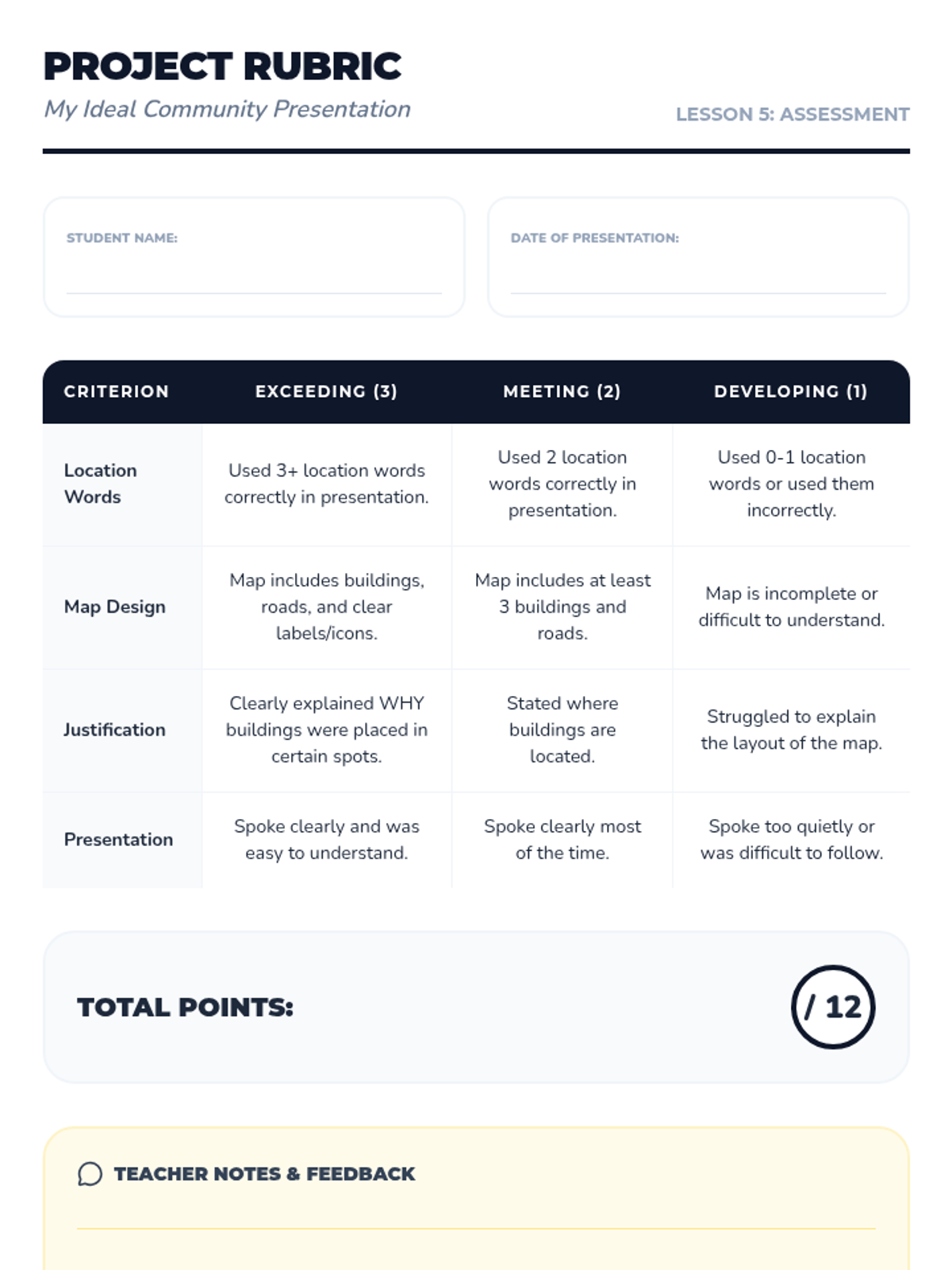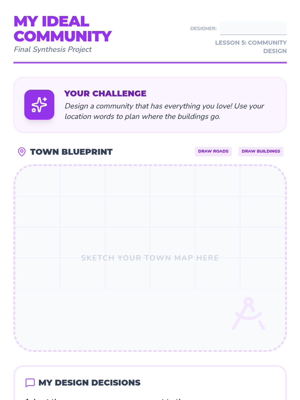 A 1st-grade social studies sequence focused on spatial awareness and directional terms, progressing from the home to a full community layout. Students learn to describe relative locations and give simple directions using a variety of hands-on and inquiry-based activities.
