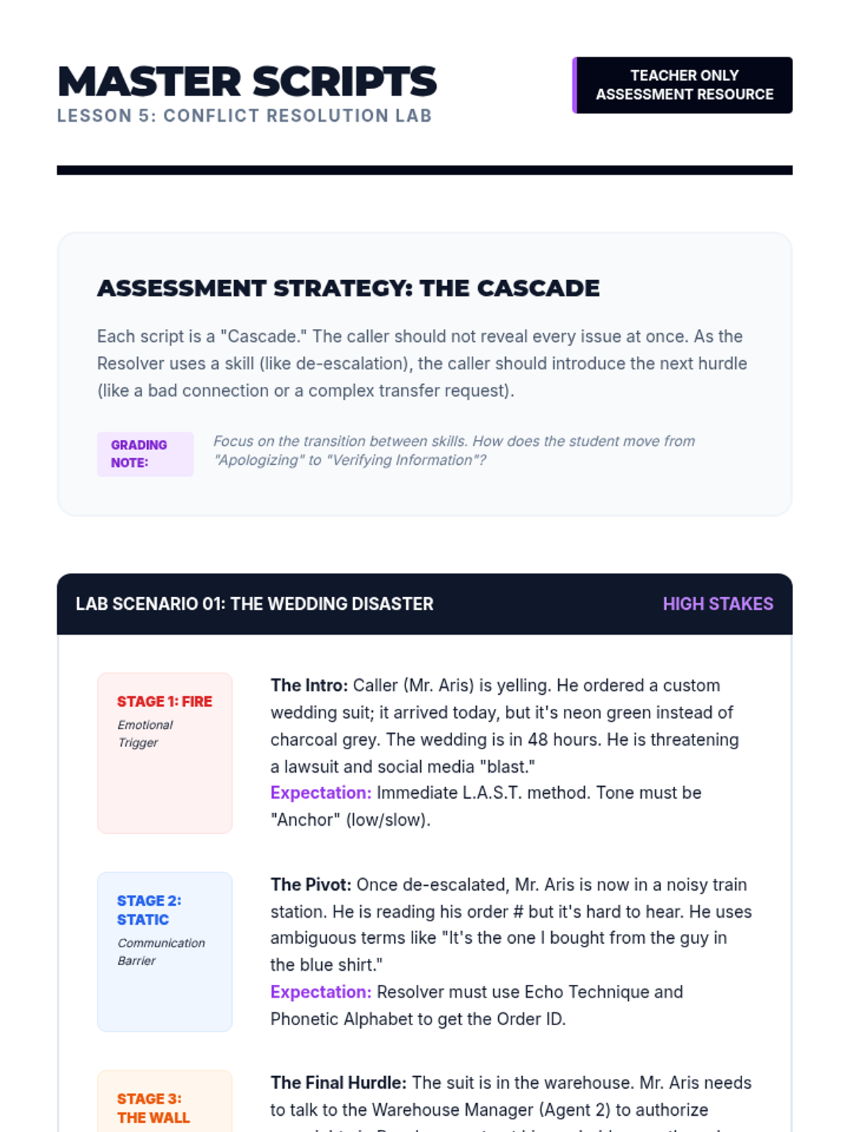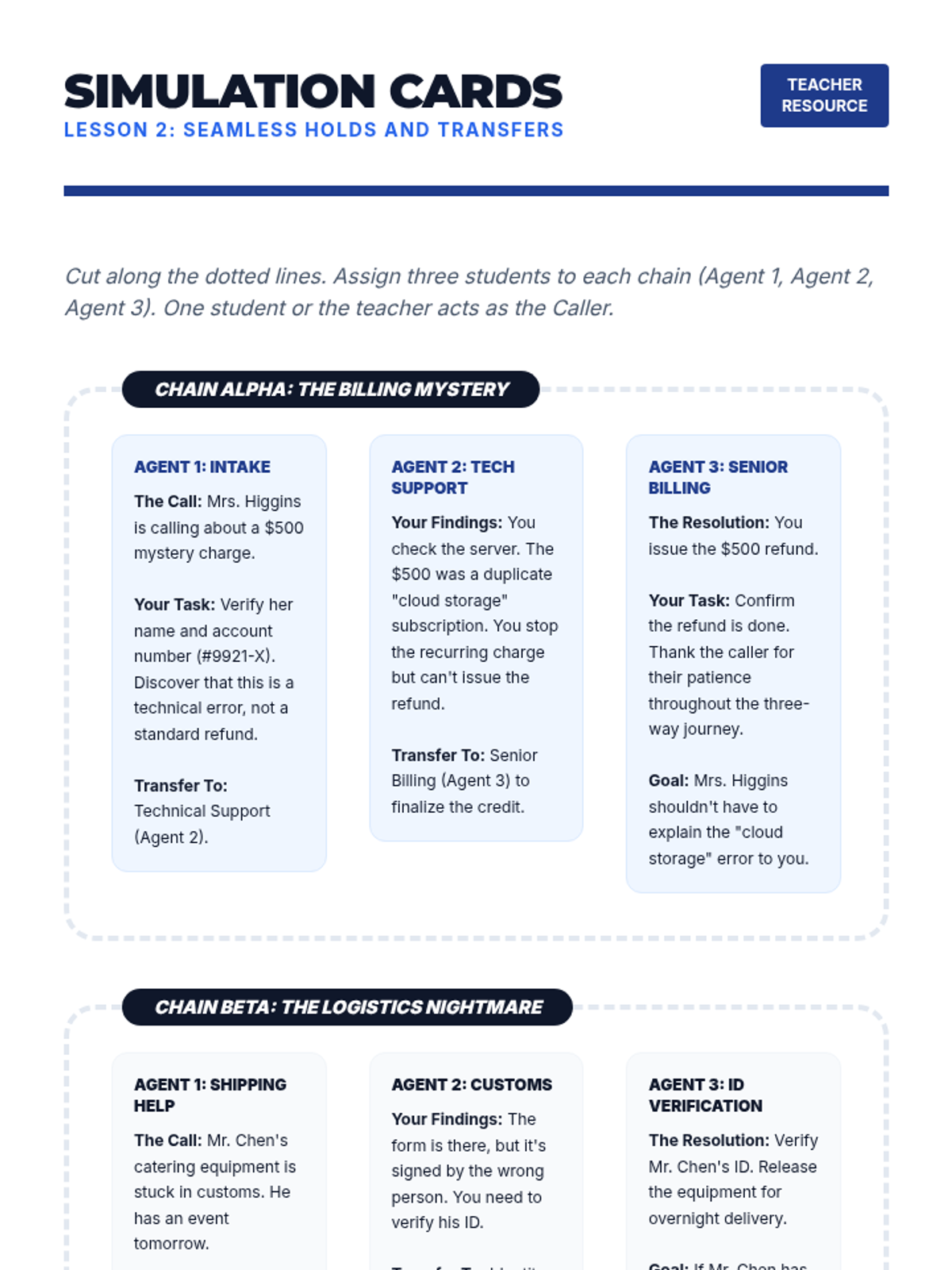 An advanced series for 11th graders focusing on high-stakes phone communication. Students master de-escalation, seamless transfers, intercultural clarity, and professional improvisation to handle conflict and ambiguity with composure.