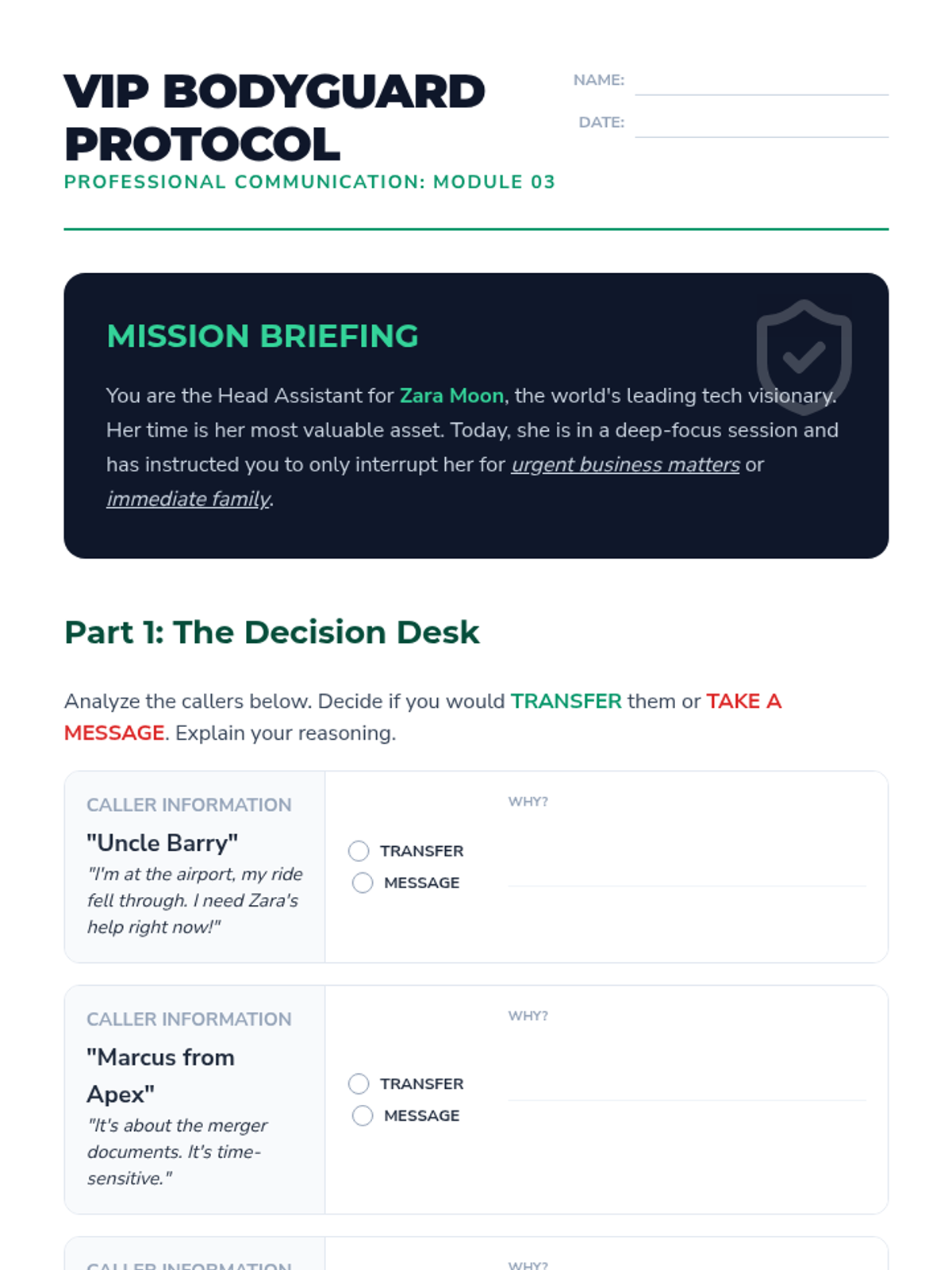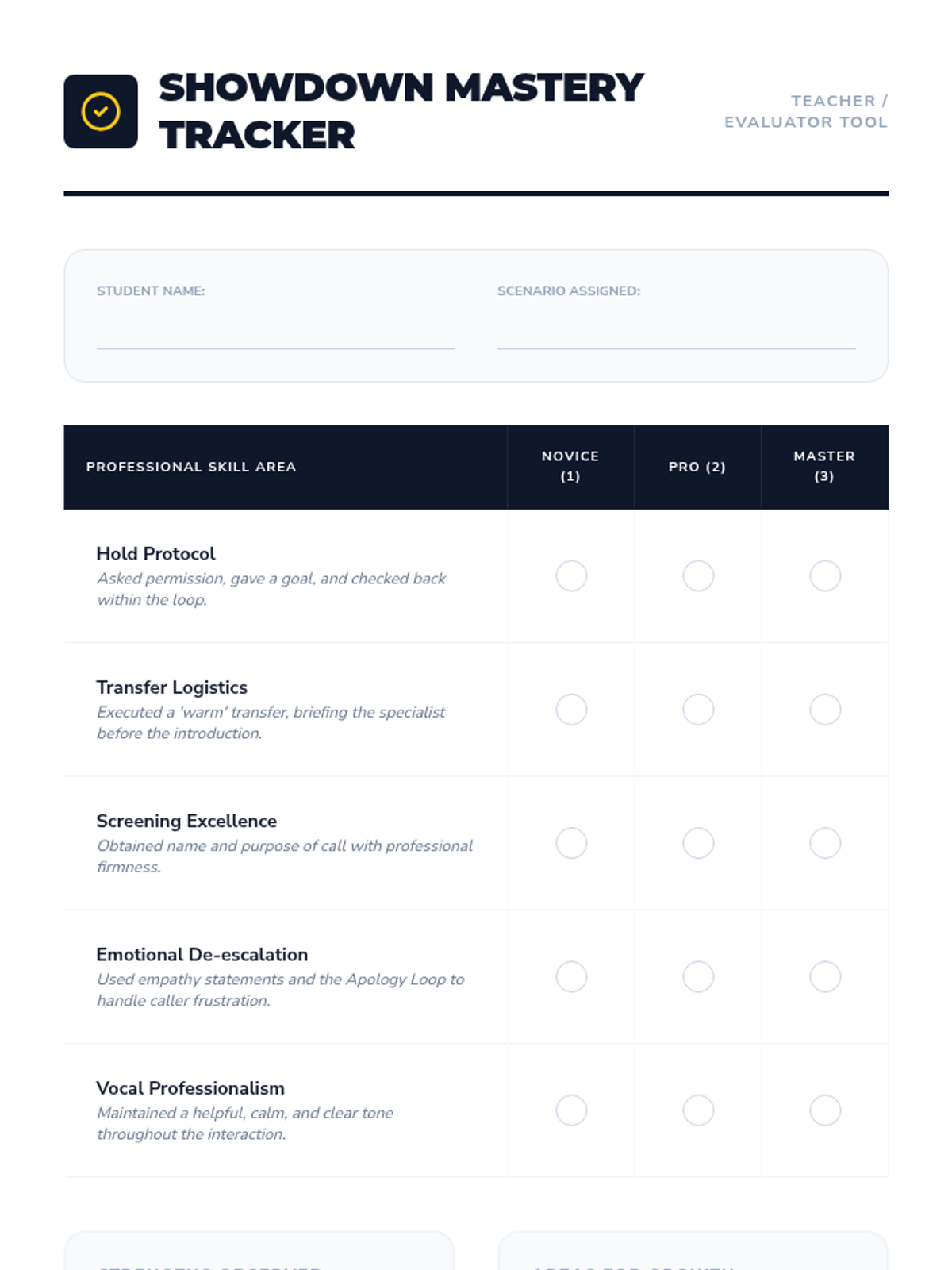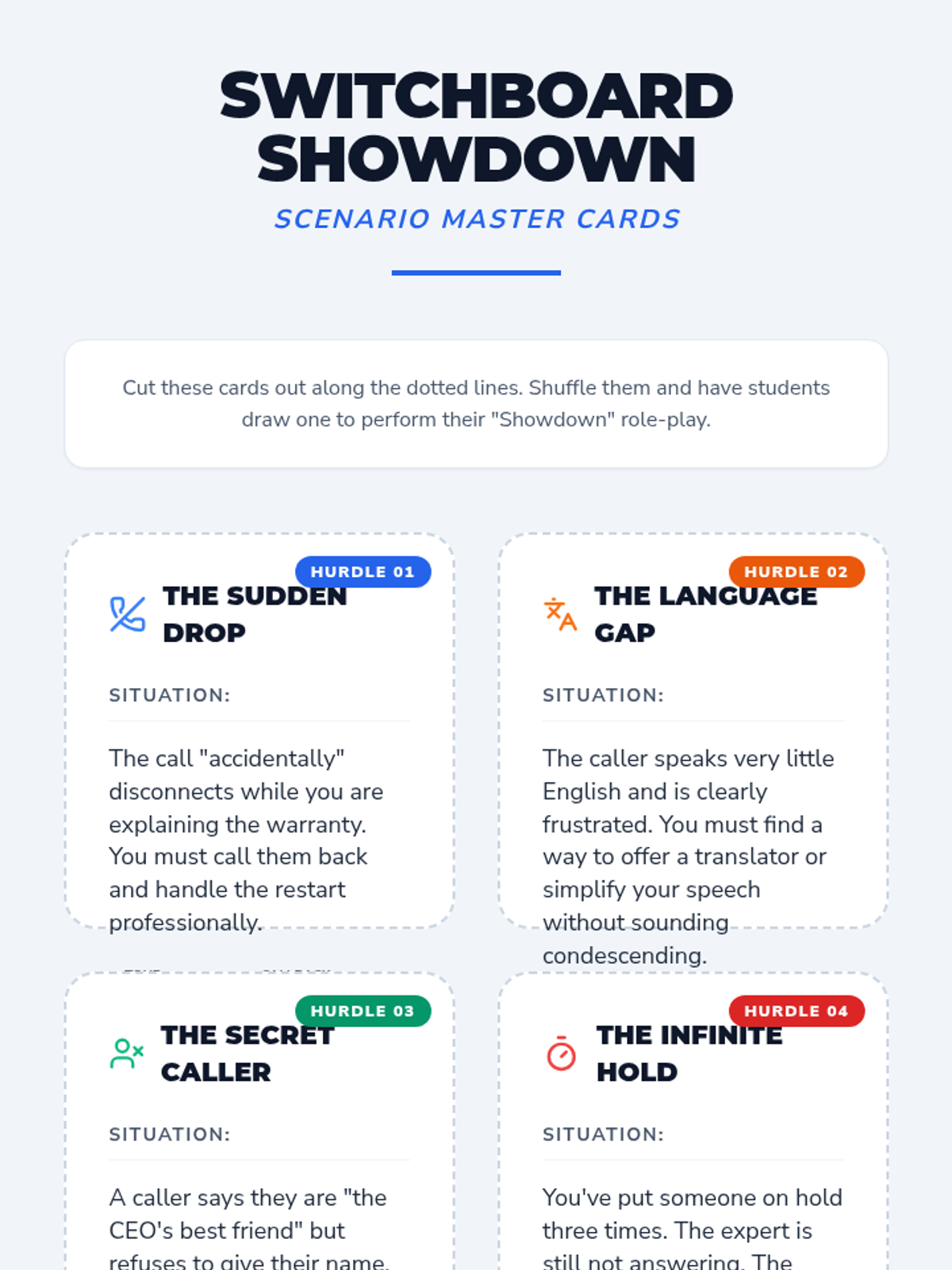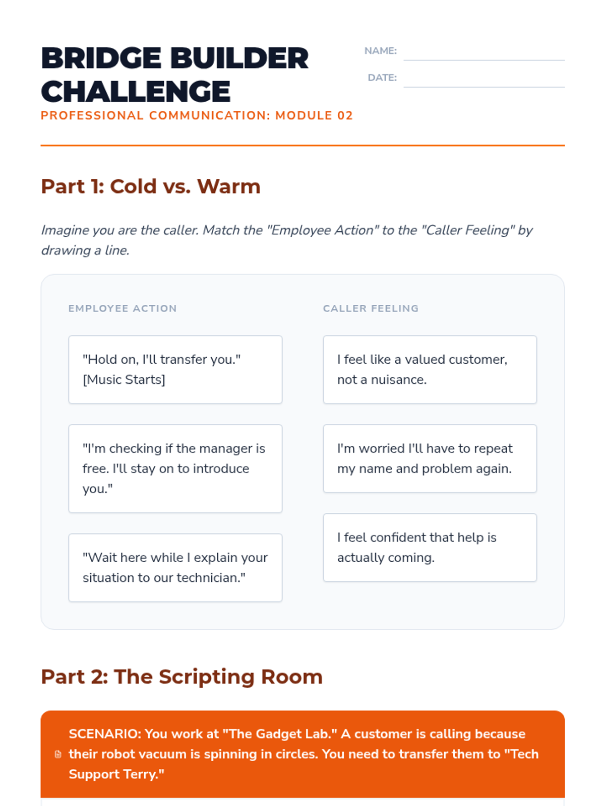 This sequence teaches 8th-grade students the advanced protocols of professional phone communication, including managing holds, transfers, screening calls, and de-escalating difficult interactions. Students engage in role-plays and case studies to build resilience and problem-solving skills in high-pressure communication scenarios.
