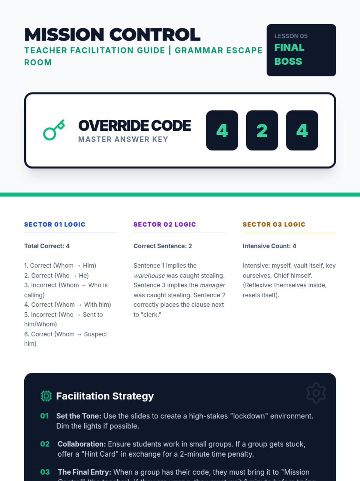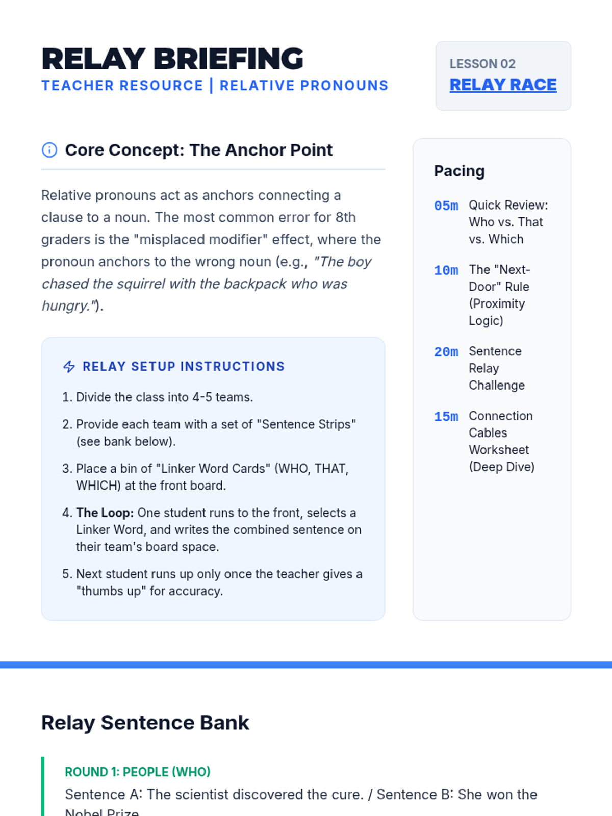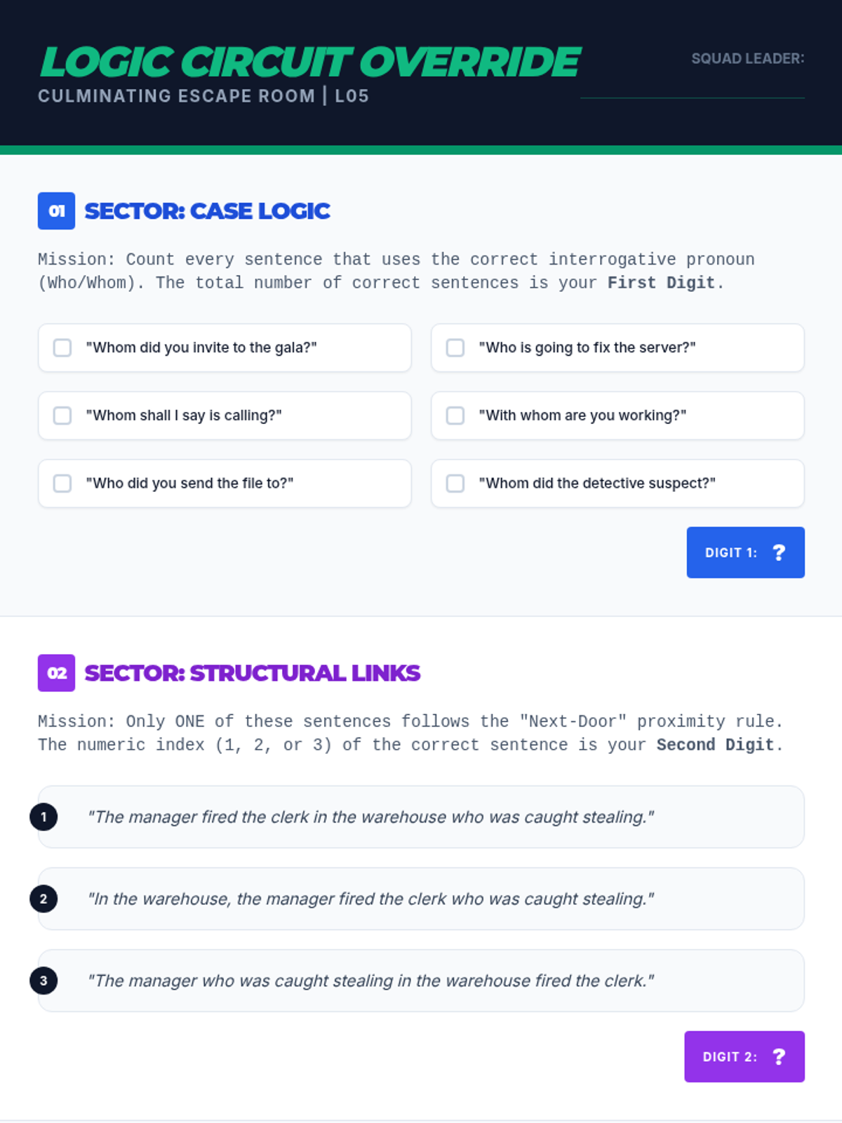 A high-energy, gamified sequence focusing on complex pronoun mechanics, including relative pronouns, intensive pronouns, and the who/whom distinction through logic puzzles and competitive challenges.