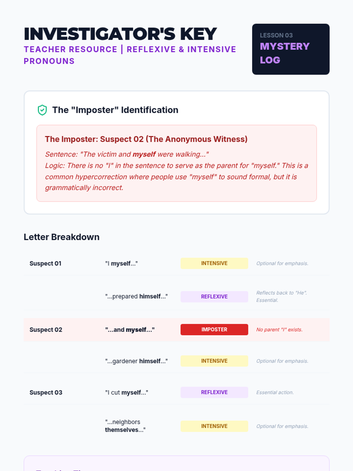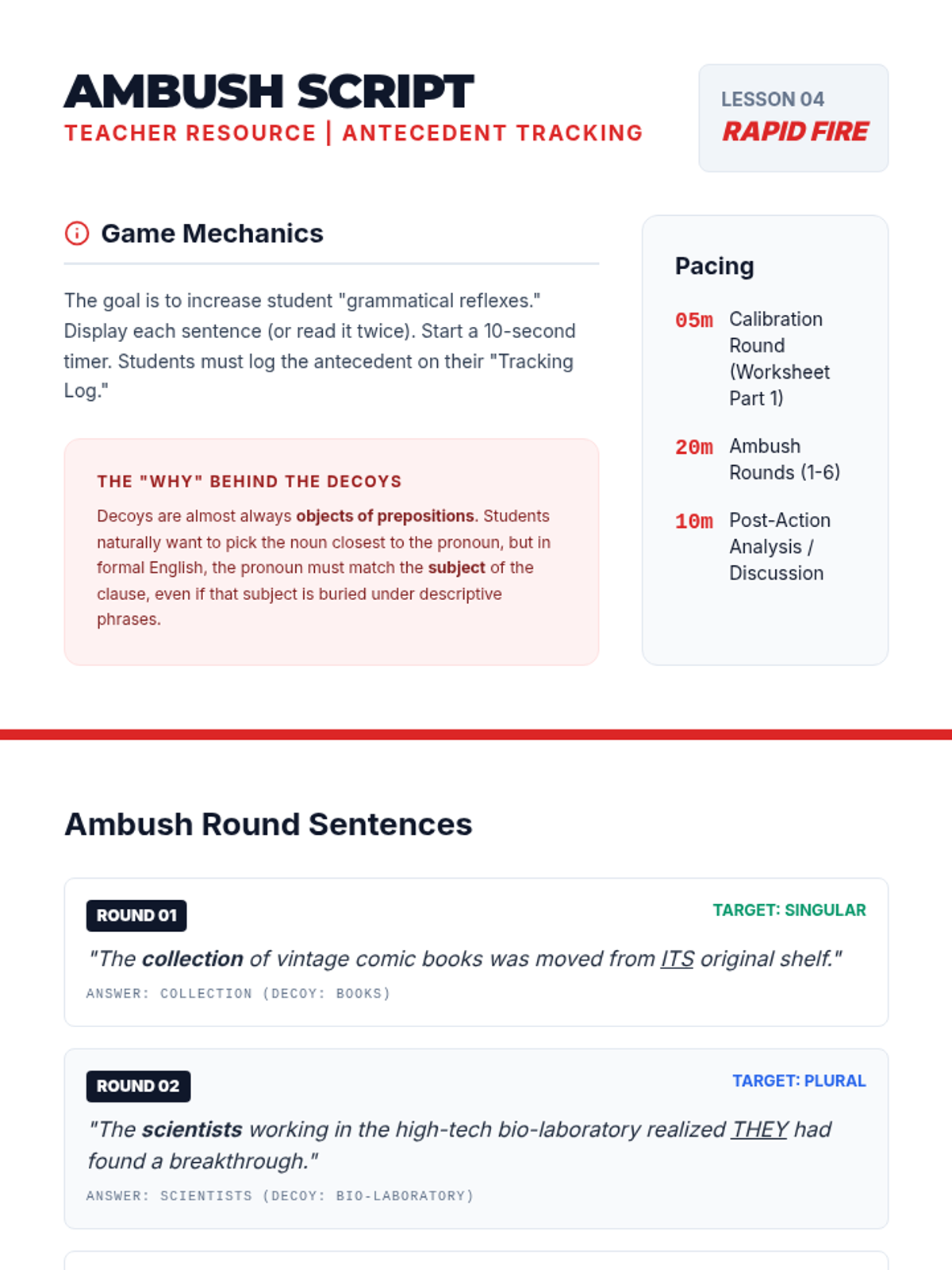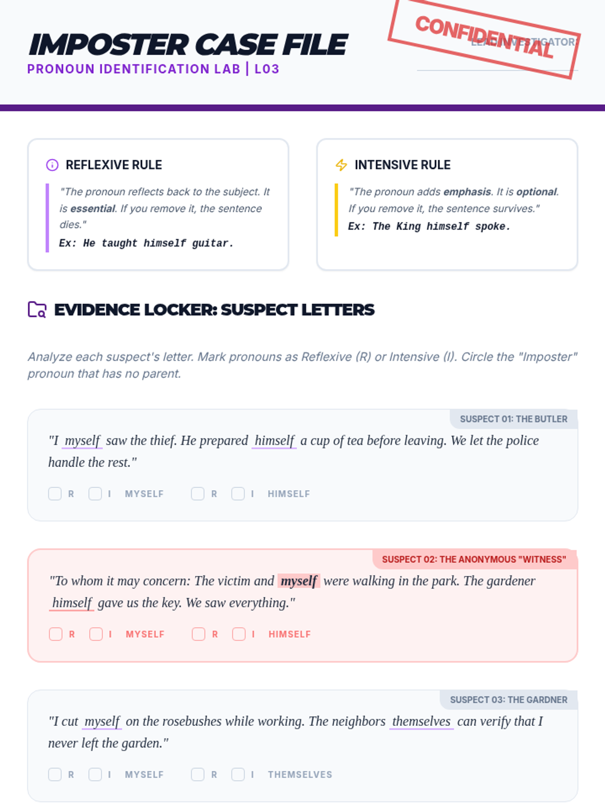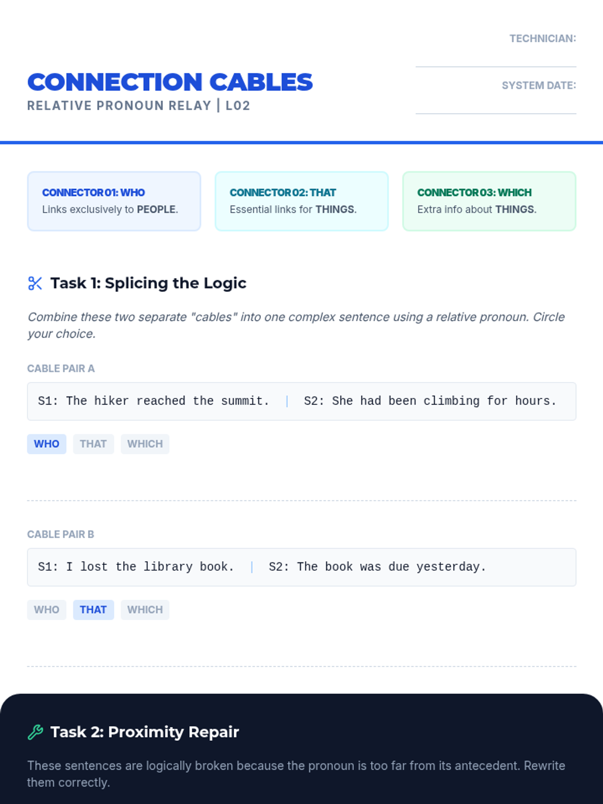 A high-energy, gamified sequence focusing on complex pronoun mechanics, including relative pronouns, intensive pronouns, and the who/whom distinction through logic puzzles and competitive challenges.