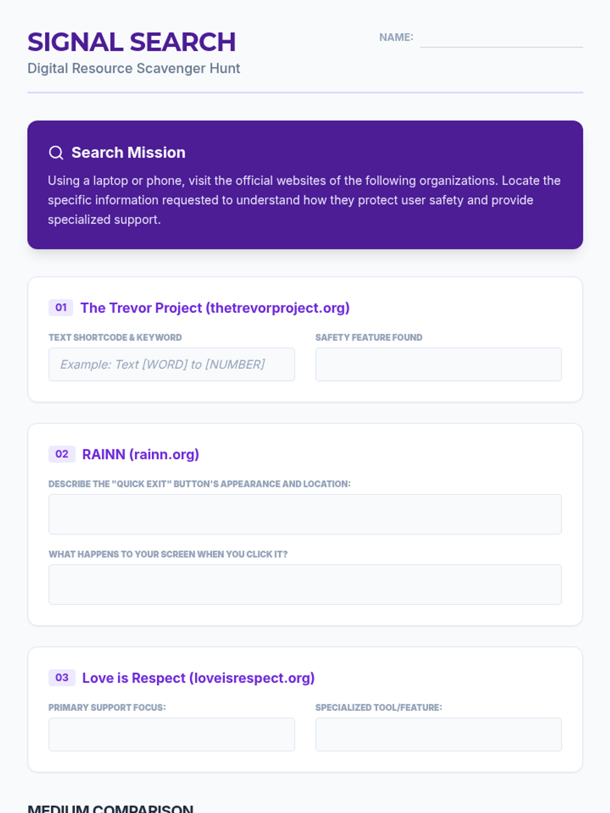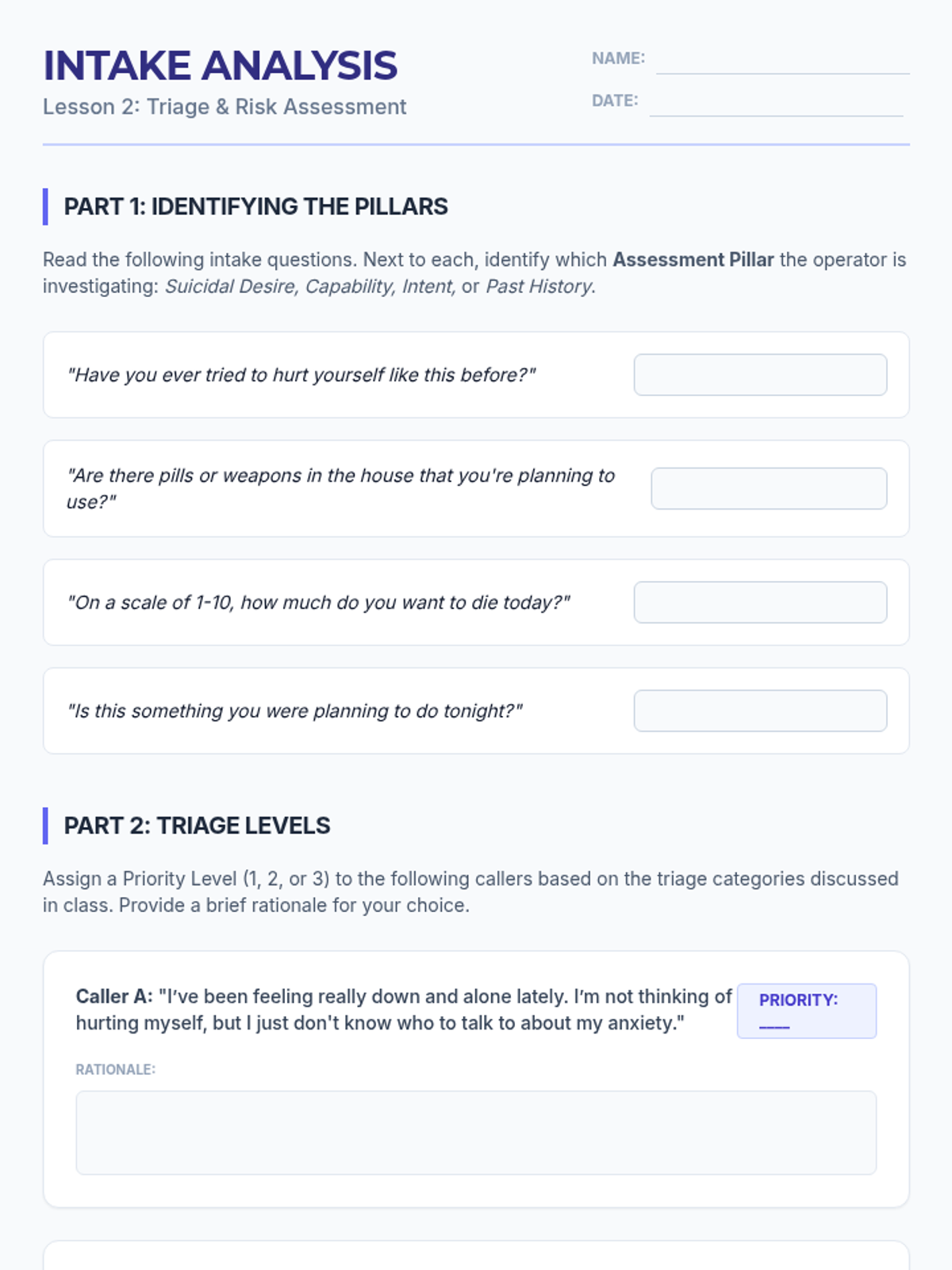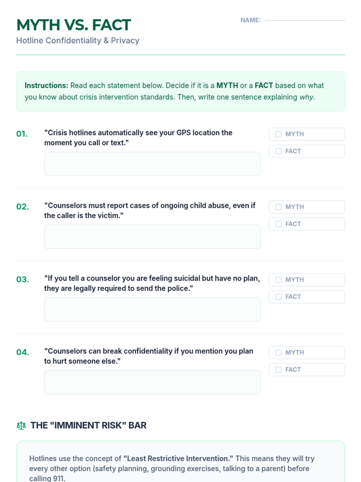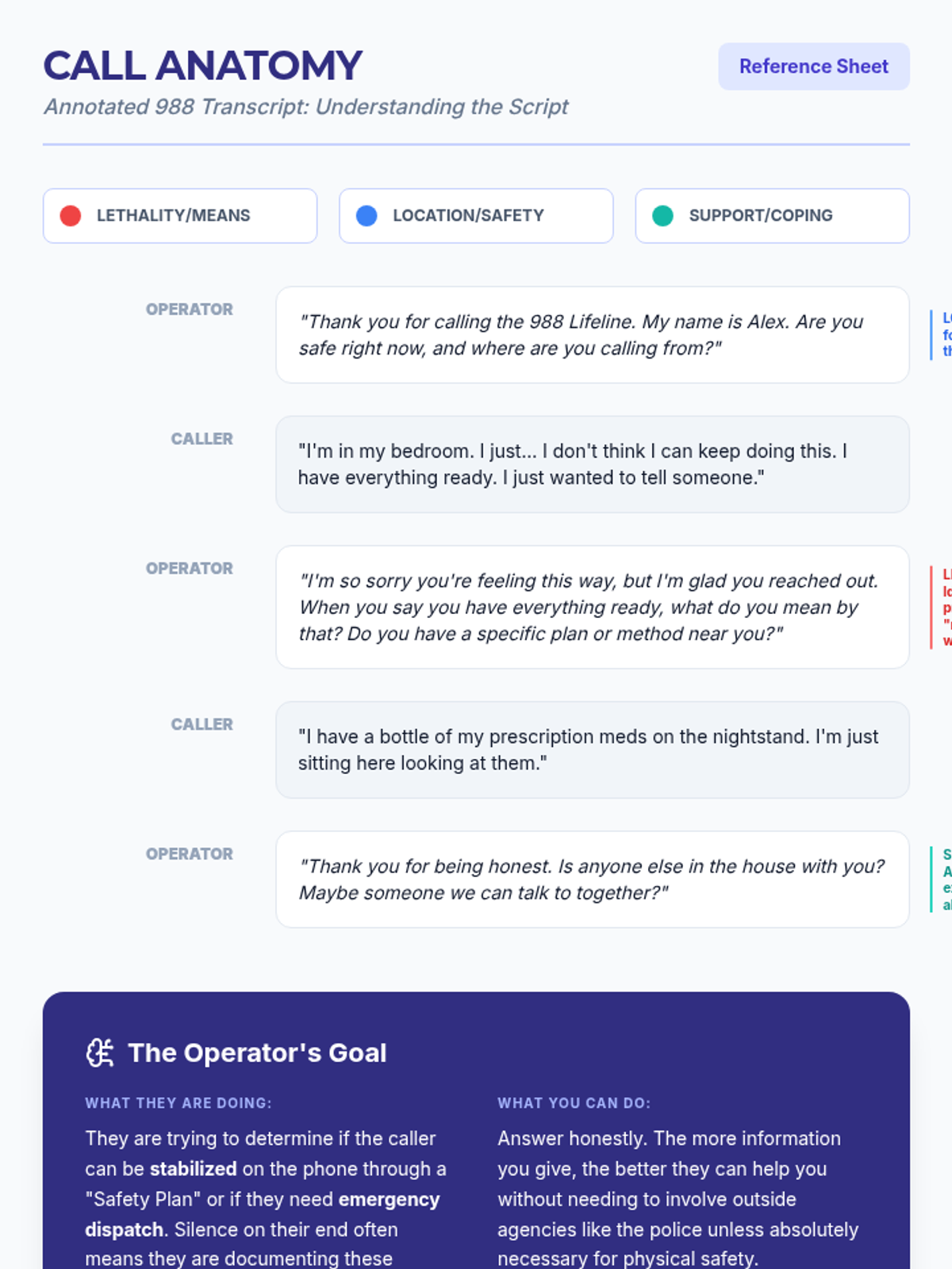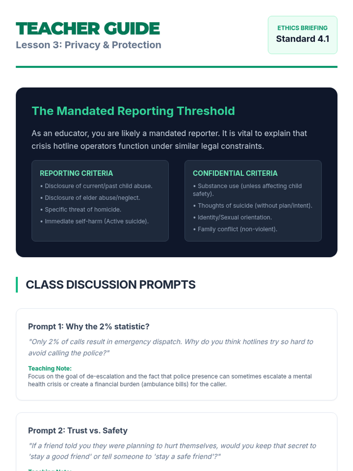 This sequence guides 11th-grade students through the logistical and procedural aspects of crisis intervention. Students learn to distinguish between 911 and 988, understand hotline intake protocols, navigate the ethics of confidentiality, explore specialized digital tools, and practice referring peers to appropriate professional resources.