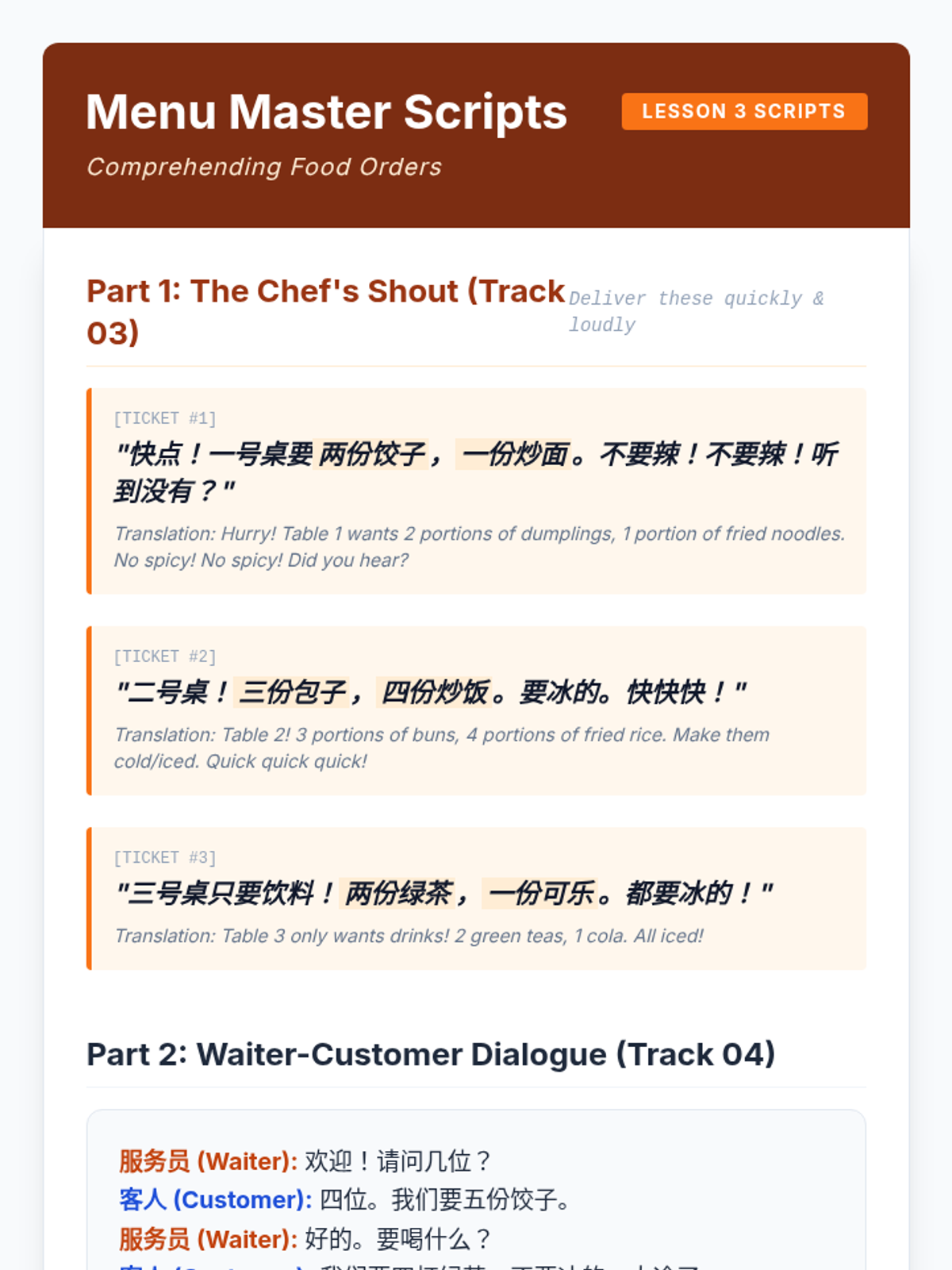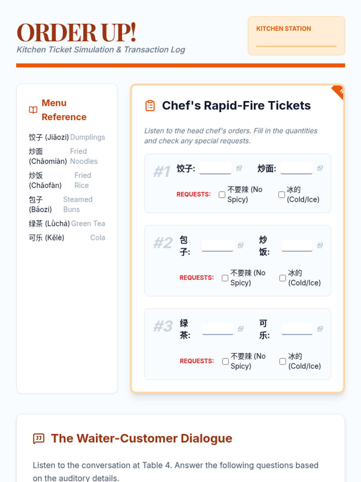 A 12th-grade Mandarin Chinese listening sequence focused on practical daily interactions. Students move from sequencing routines to navigating transportation, ordering food, and analyzing complex dialogues in real-world scenarios.