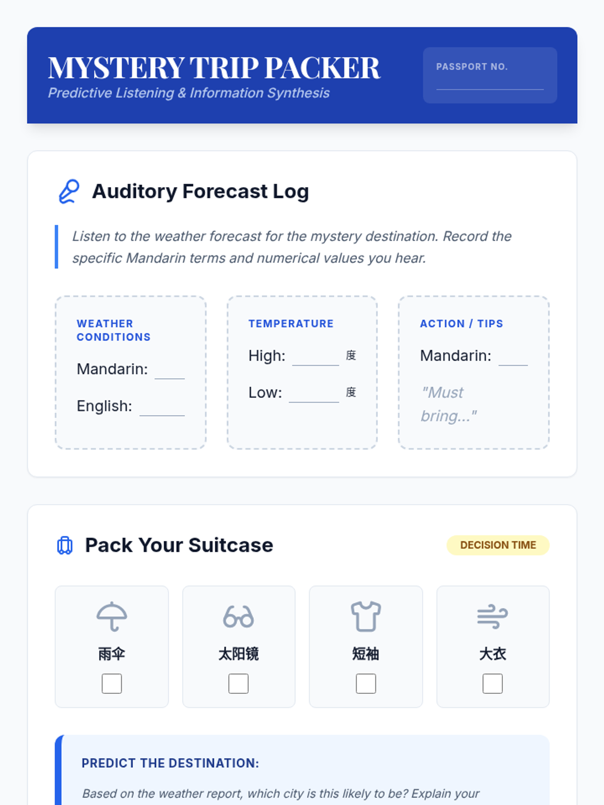 A high-stakes travel simulation building French listening proficiency in logistics: numbers, time, prices, and directions. Students navigate virtual 'survival' scenarios where accurate information processing is the key to a successful journey.