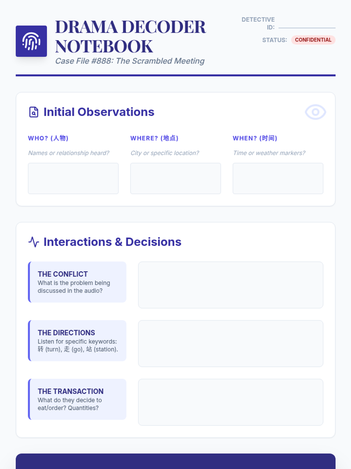 A beginner French listening sequence where students act as social observers, analyzing registers, personal details, family structures, and preferences through auditory scripts.