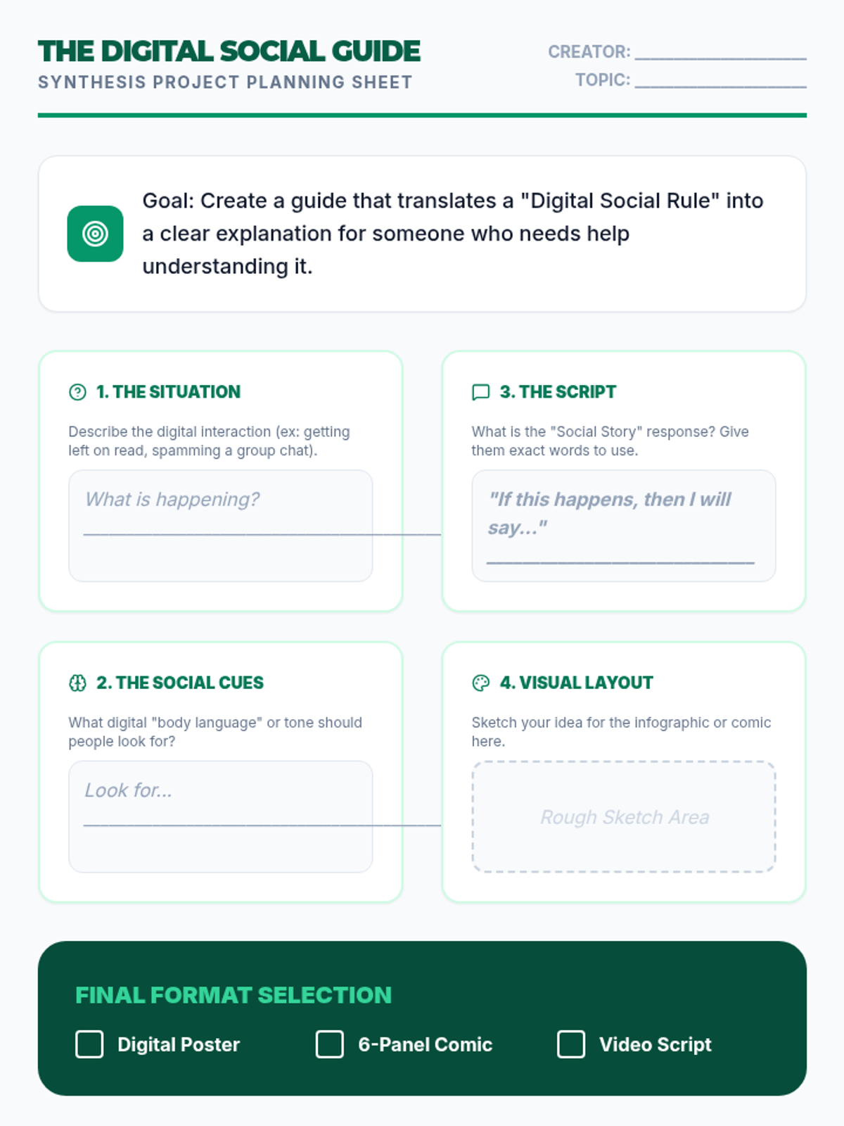 This sequence helps 8th-grade students navigate the complexities of digital communication by applying social story techniques to texting, group chats, and online safety. Students learn to interpret digital tone, manage the anxiety of delayed responses, and create their own social narratives for healthy online interactions.