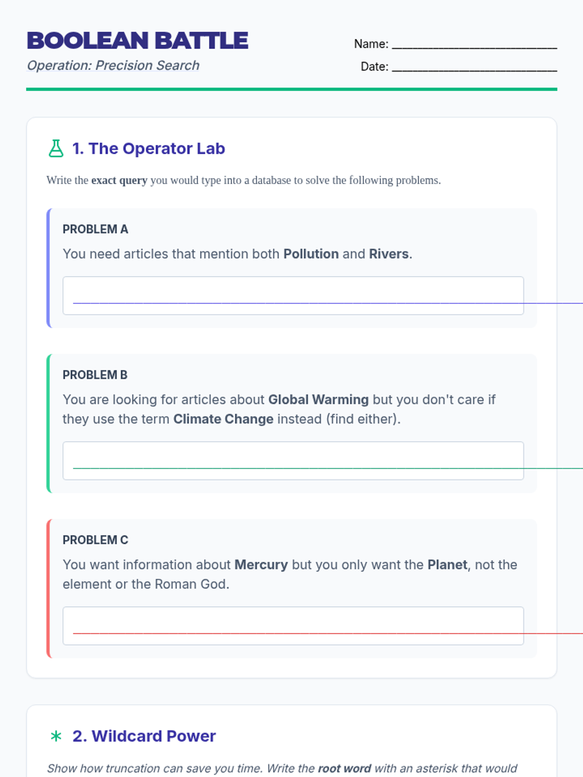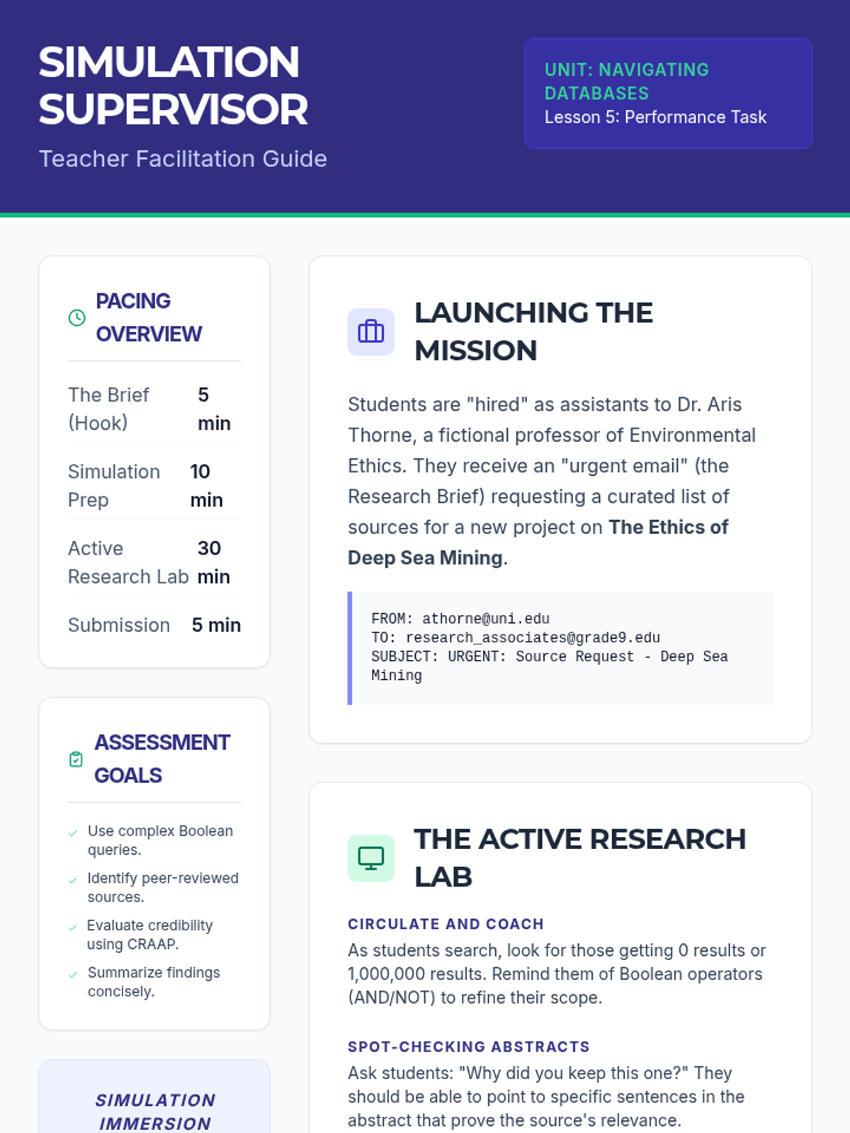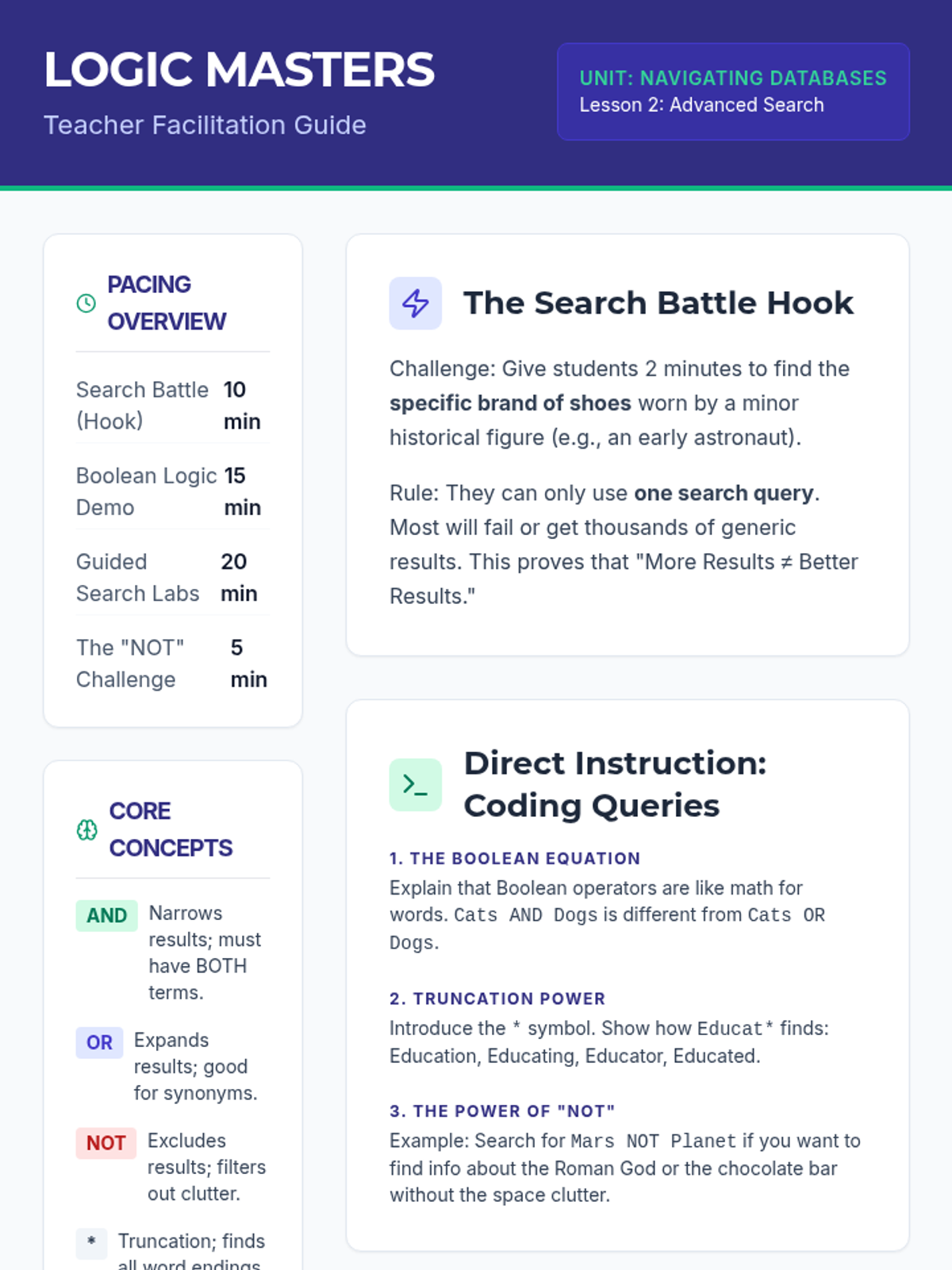 This sequence bridges the gap between open-web searching and academic research by introducing 9th-grade students to digital databases and advanced search strategies. Students progress from understanding the 'Deep Web' to mastering Boolean logic and evaluating scholarly authority, culminating in a research curation simulation.