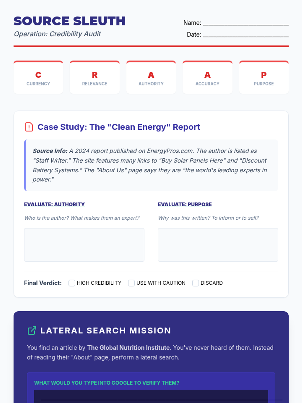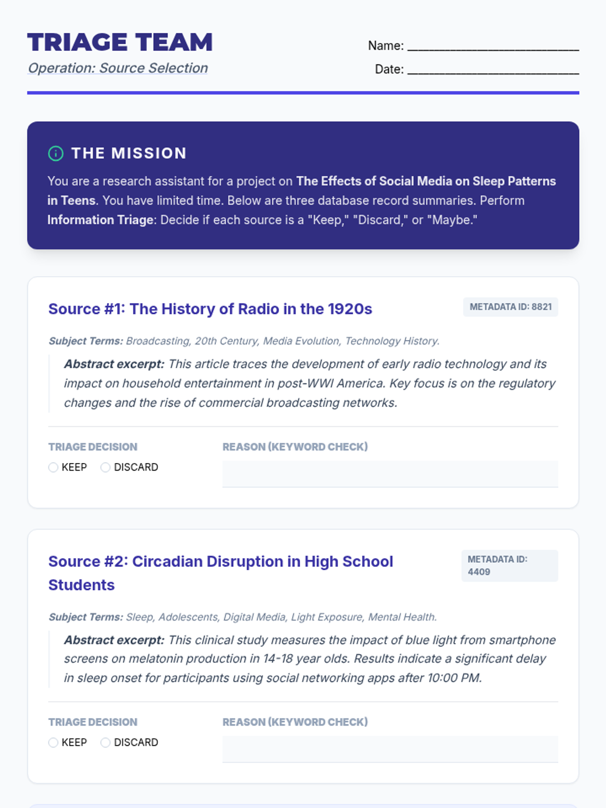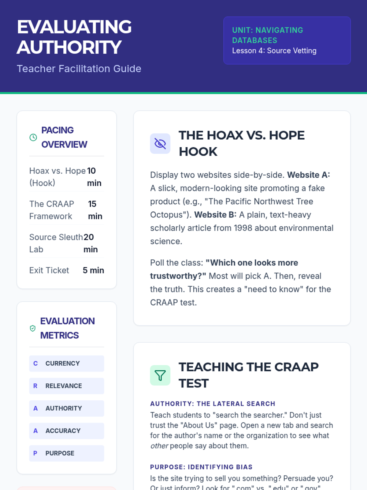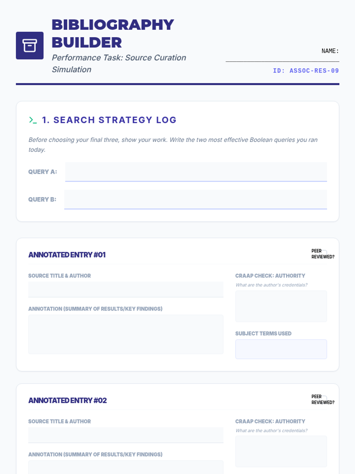 This sequence bridges the gap between open-web searching and academic research by introducing 9th-grade students to digital databases and advanced search strategies. Students progress from understanding the 'Deep Web' to mastering Boolean logic and evaluating scholarly authority, culminating in a research curation simulation.