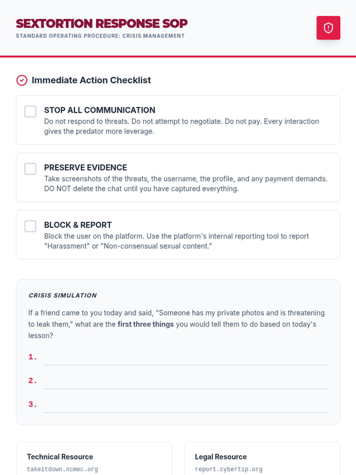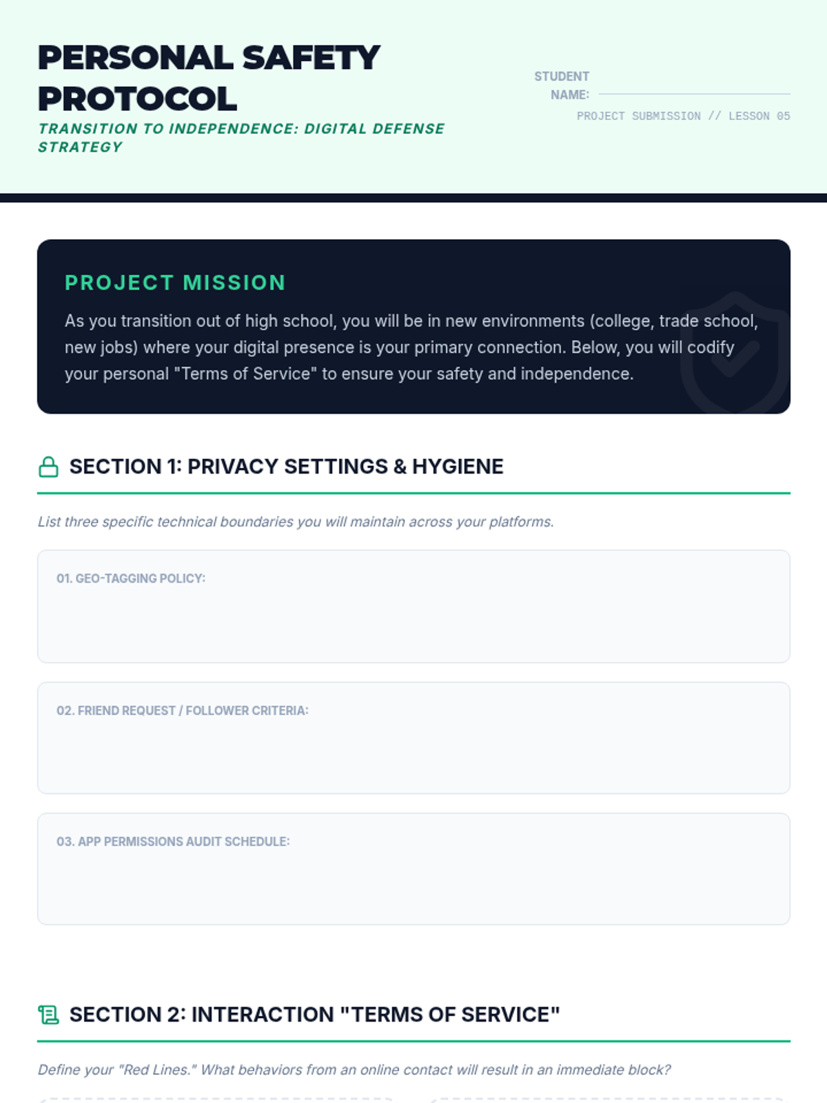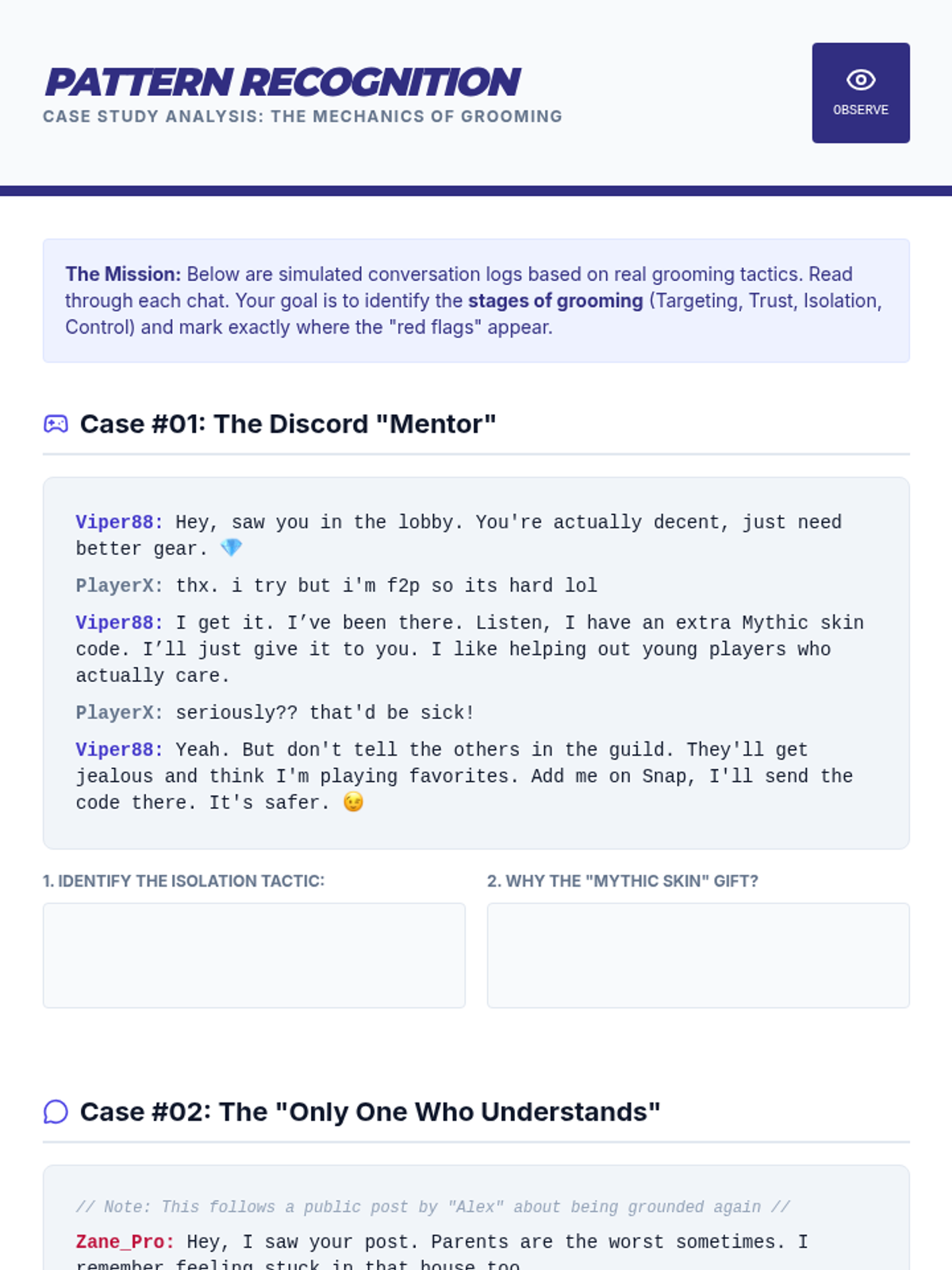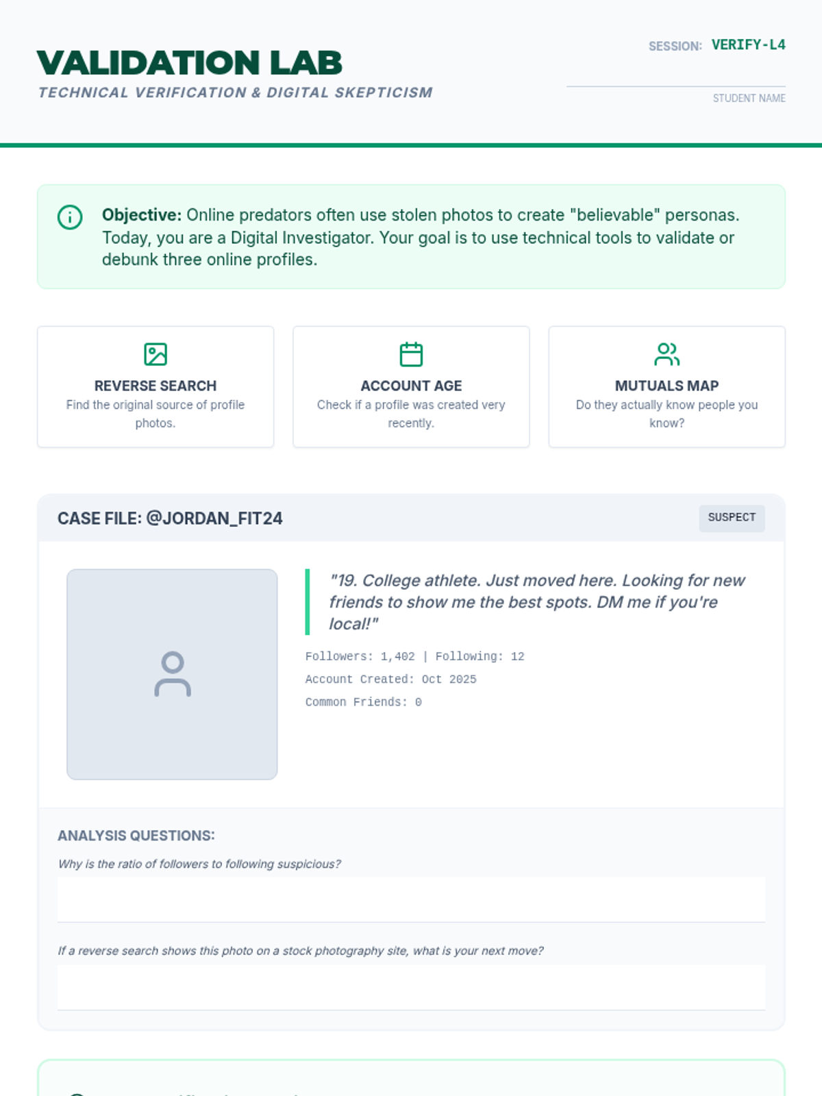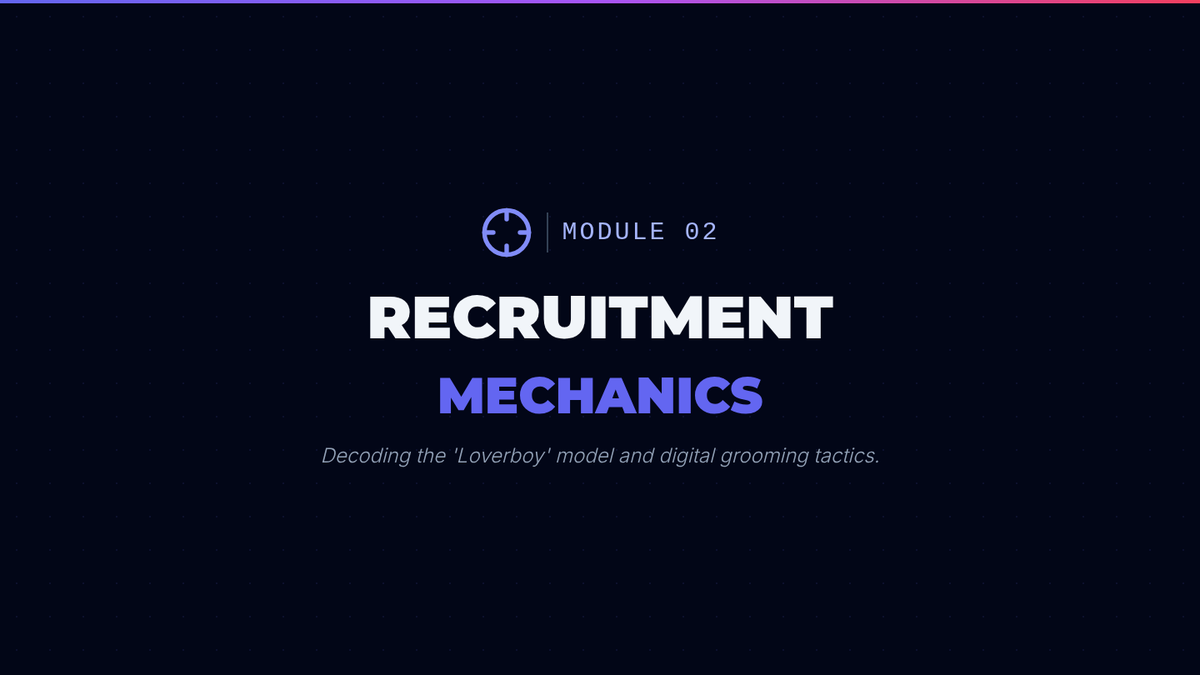 This 5-lesson sequence for 12th-grade students explores the digital landscape of human trafficking, focusing on how traffickers use social media, gaming, and encryption to recruit and exploit. Students develop critical digital literacy, learn to recognize grooming and sextortion, and create personal safety protocols for their transition to adulthood.