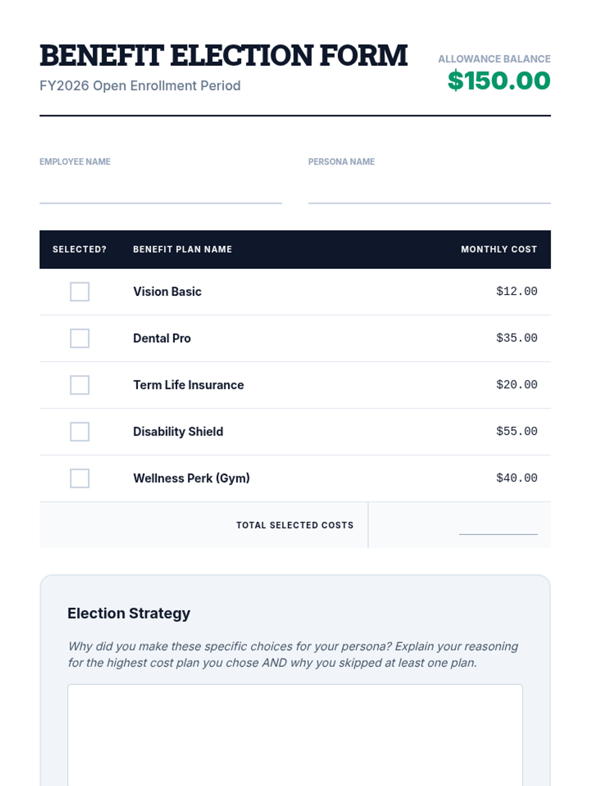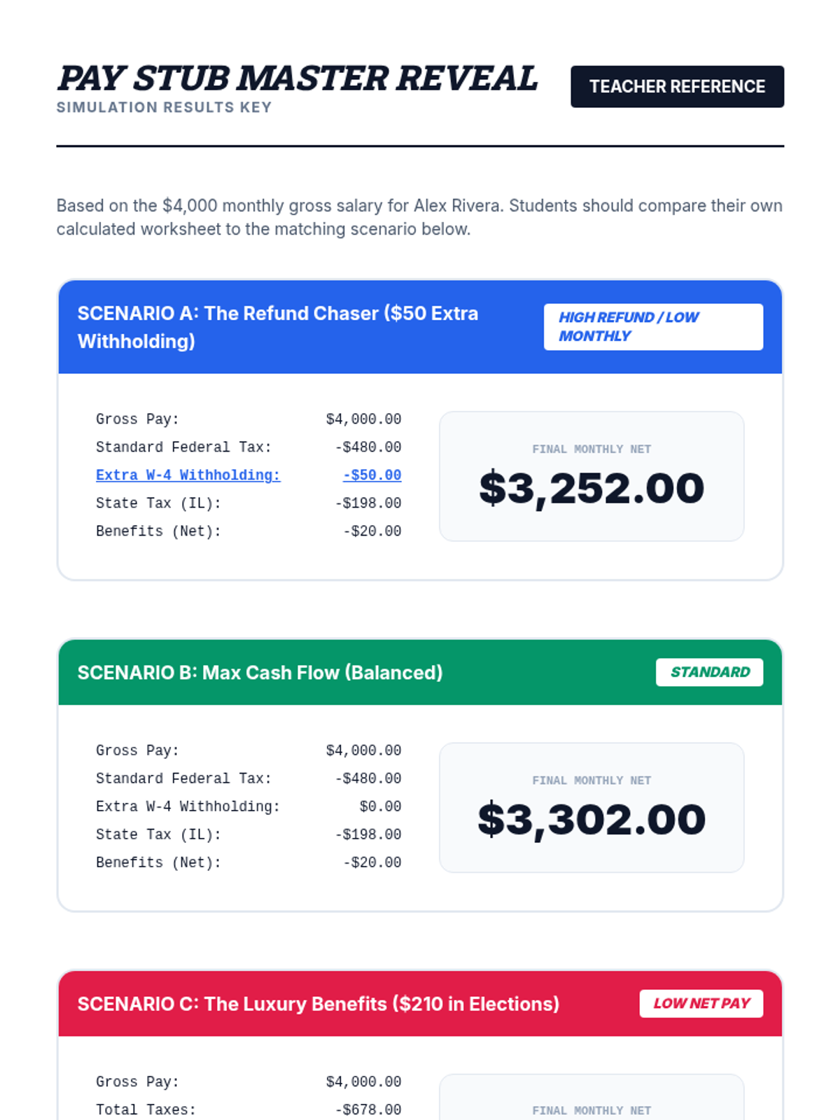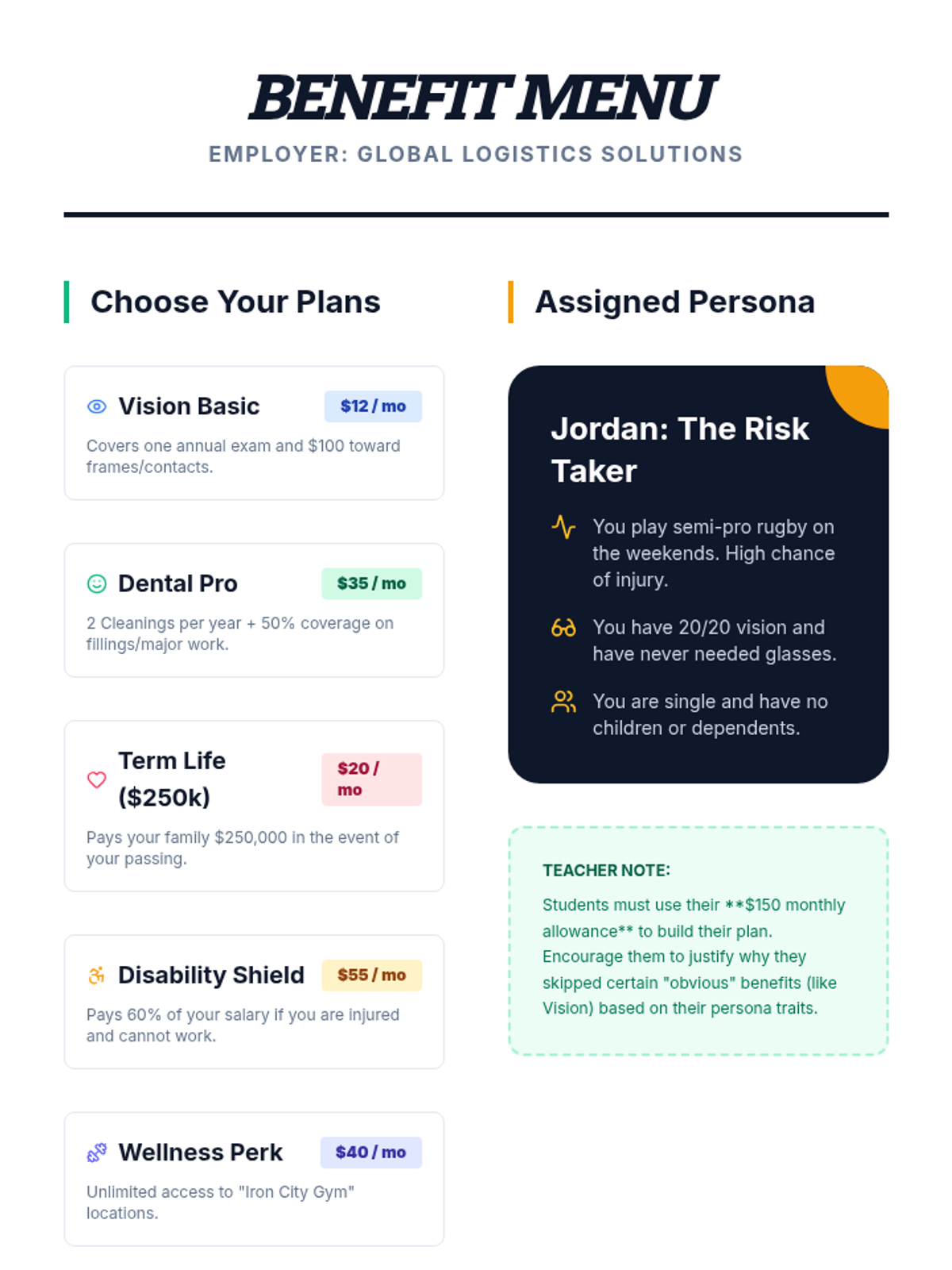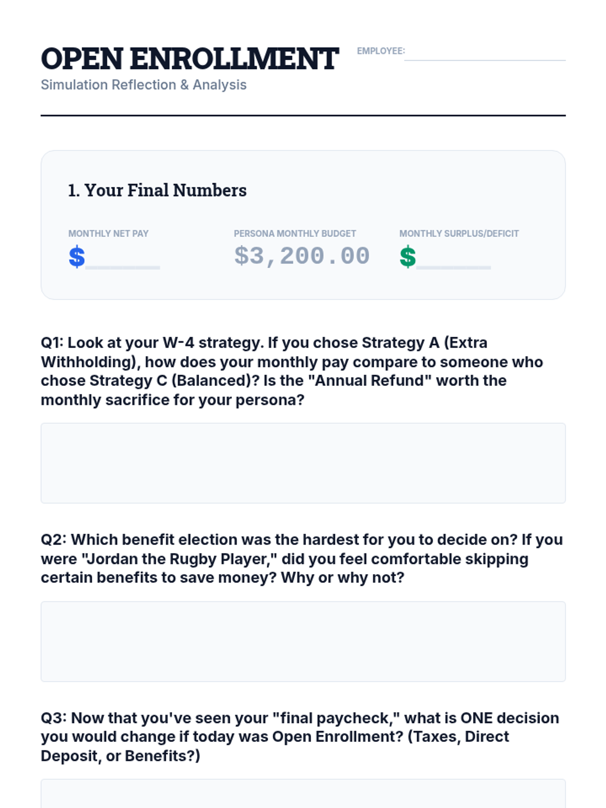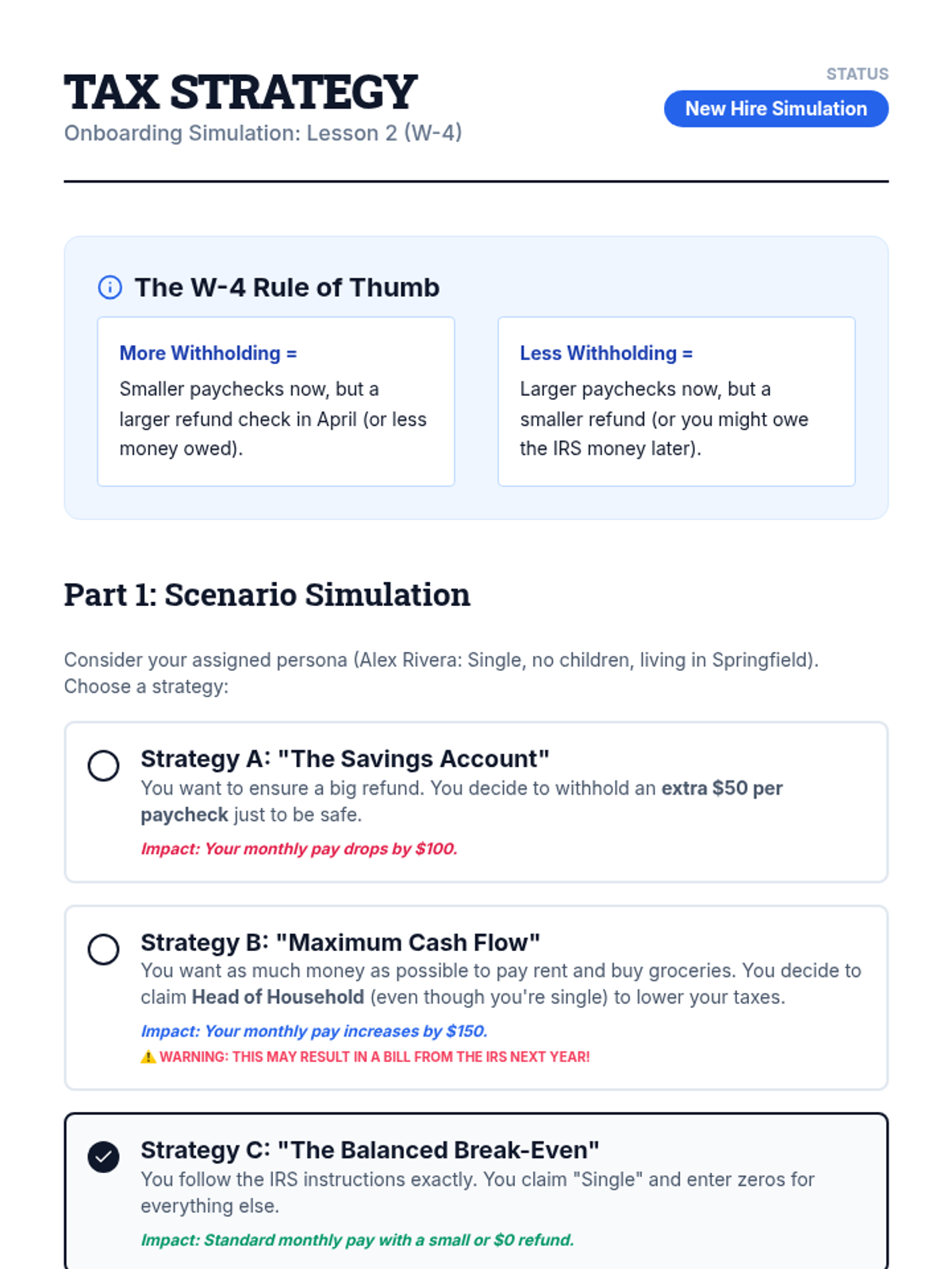 An immersive simulation where students navigate the onboarding process of a new job, making critical decisions about taxes, benefits, and workplace rights to understand their impact on a final paycheck.