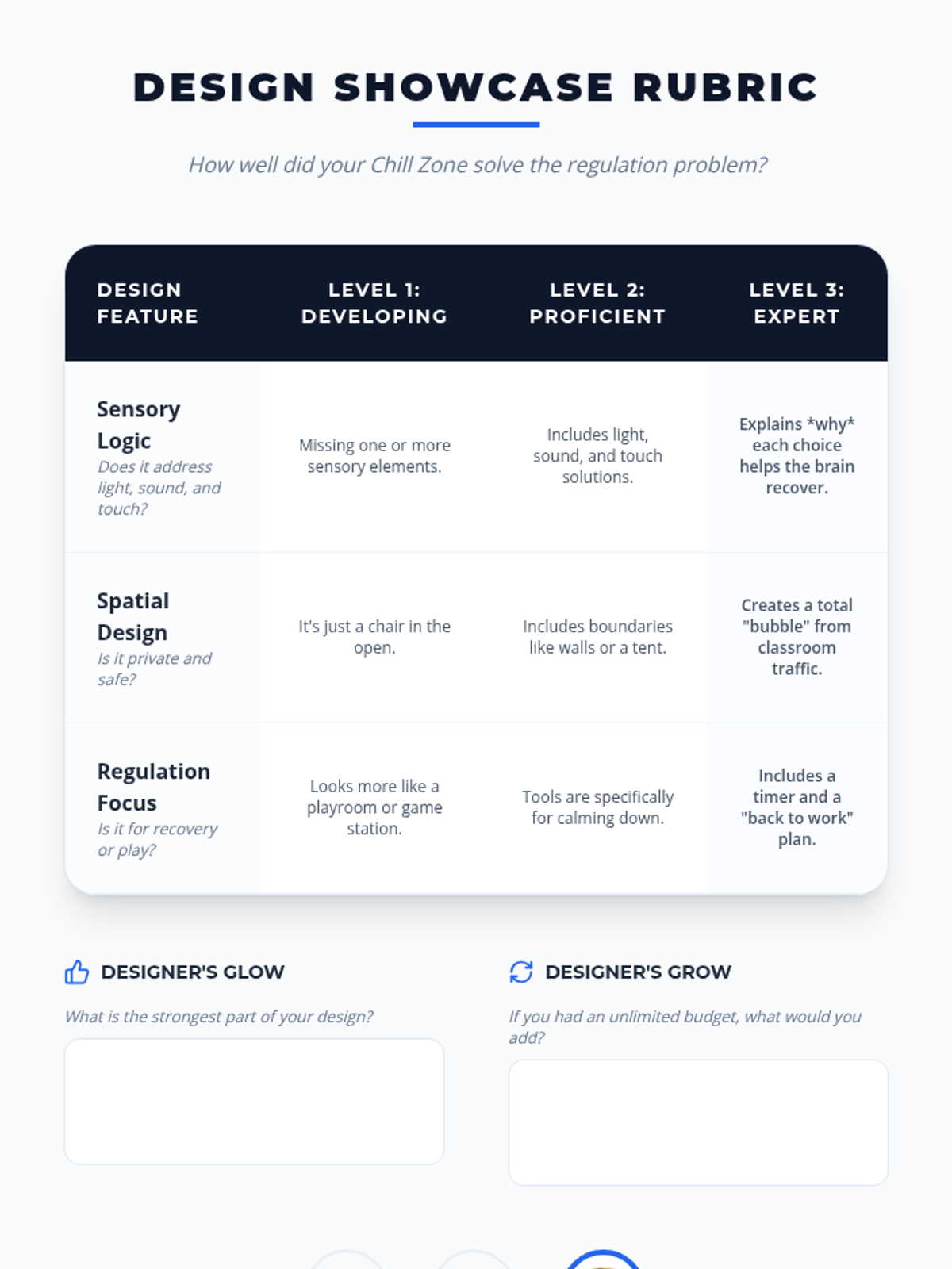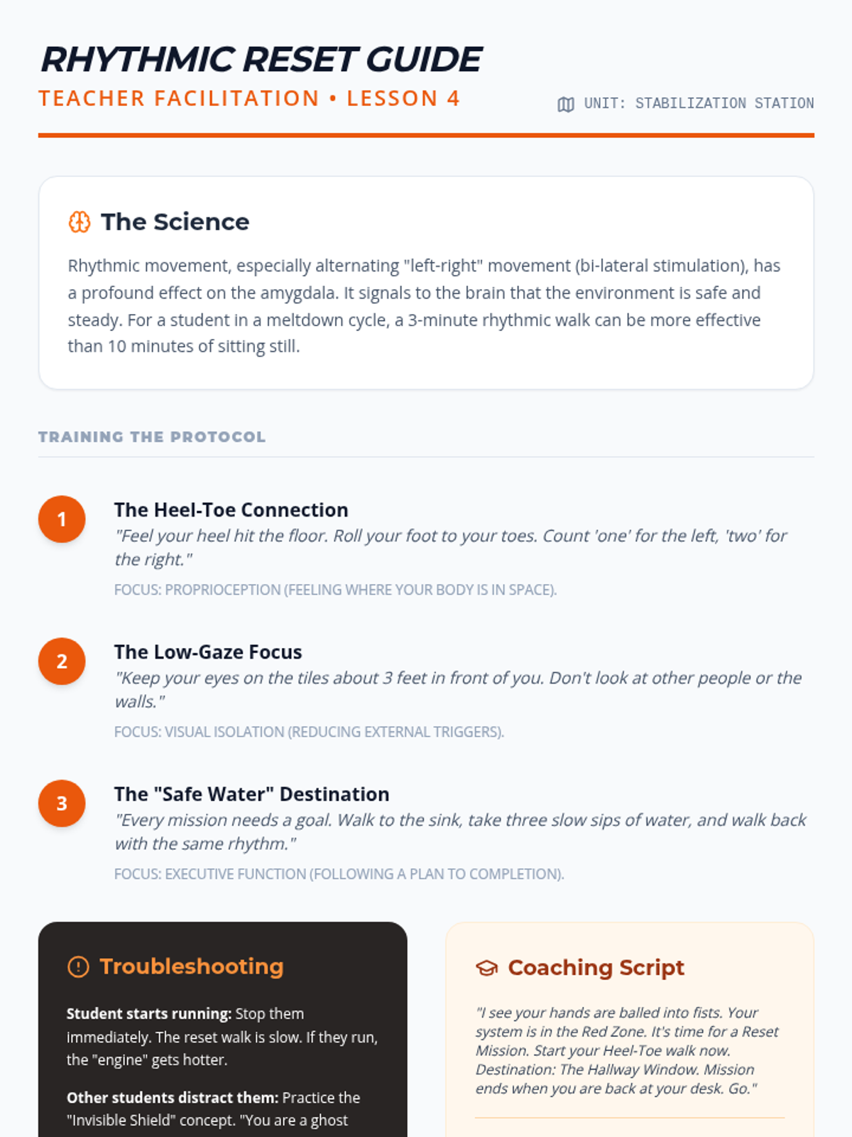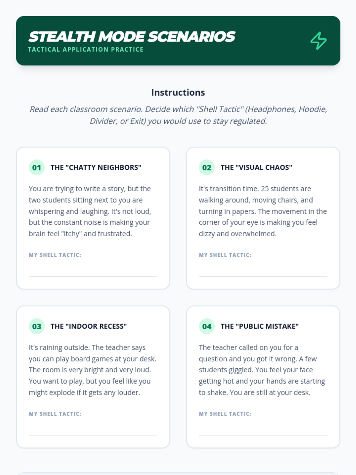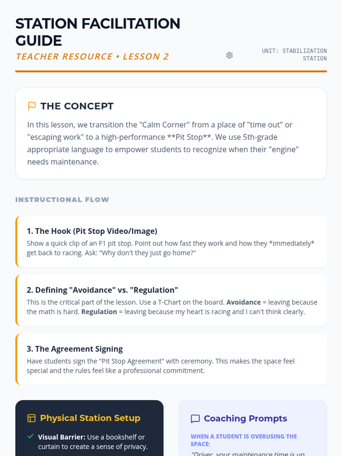 This sequence helps 5th-grade students understand how physical environments impact their emotional regulation. Students learn to conduct sensory audits, establish protocols for calm spaces, create portable sensory barriers, and design ideal recovery environments to support stabilization during and after periods of dysregulation.