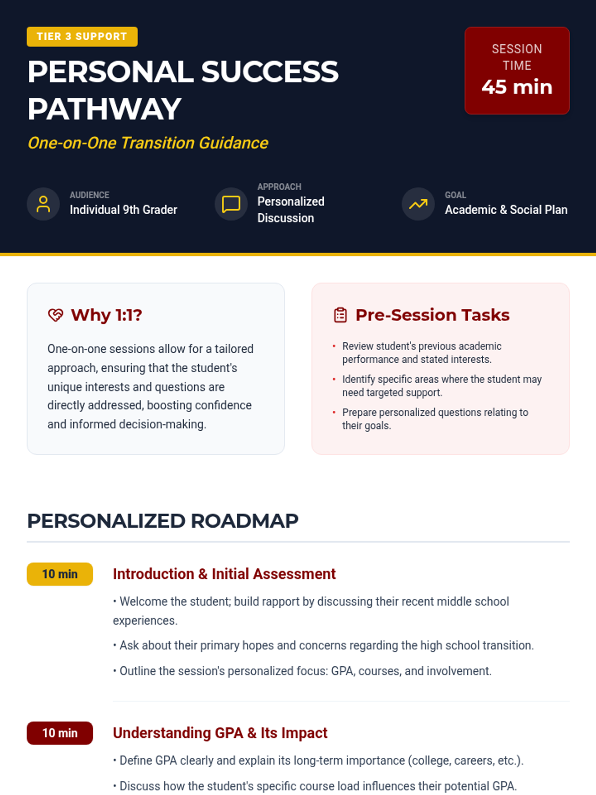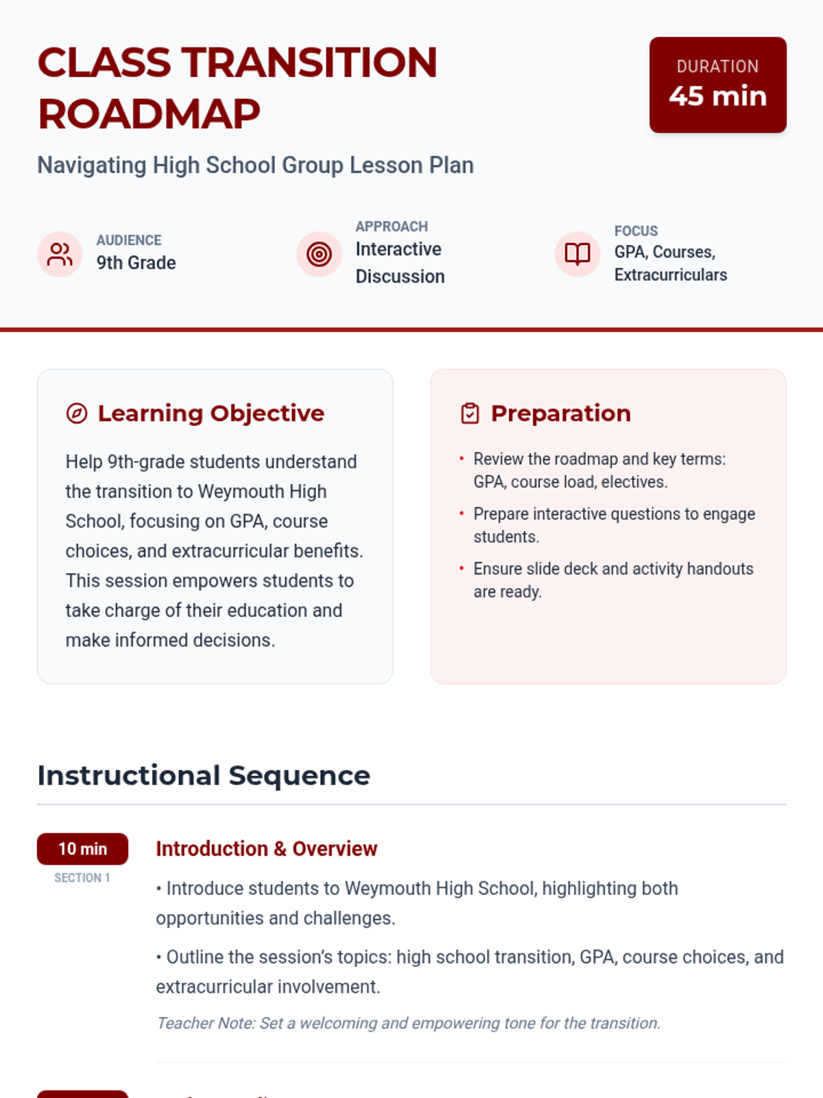 A comprehensive transition program for 9th-grade students entering Weymouth High School, moving from general group orientation to personalized one-on-one guidance on GPA, course selection, and extracurricular activities.