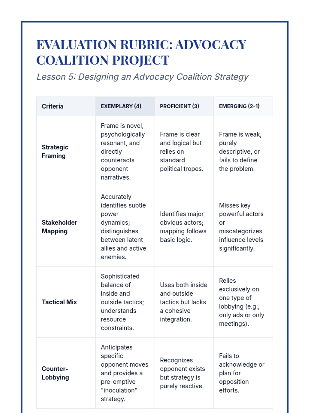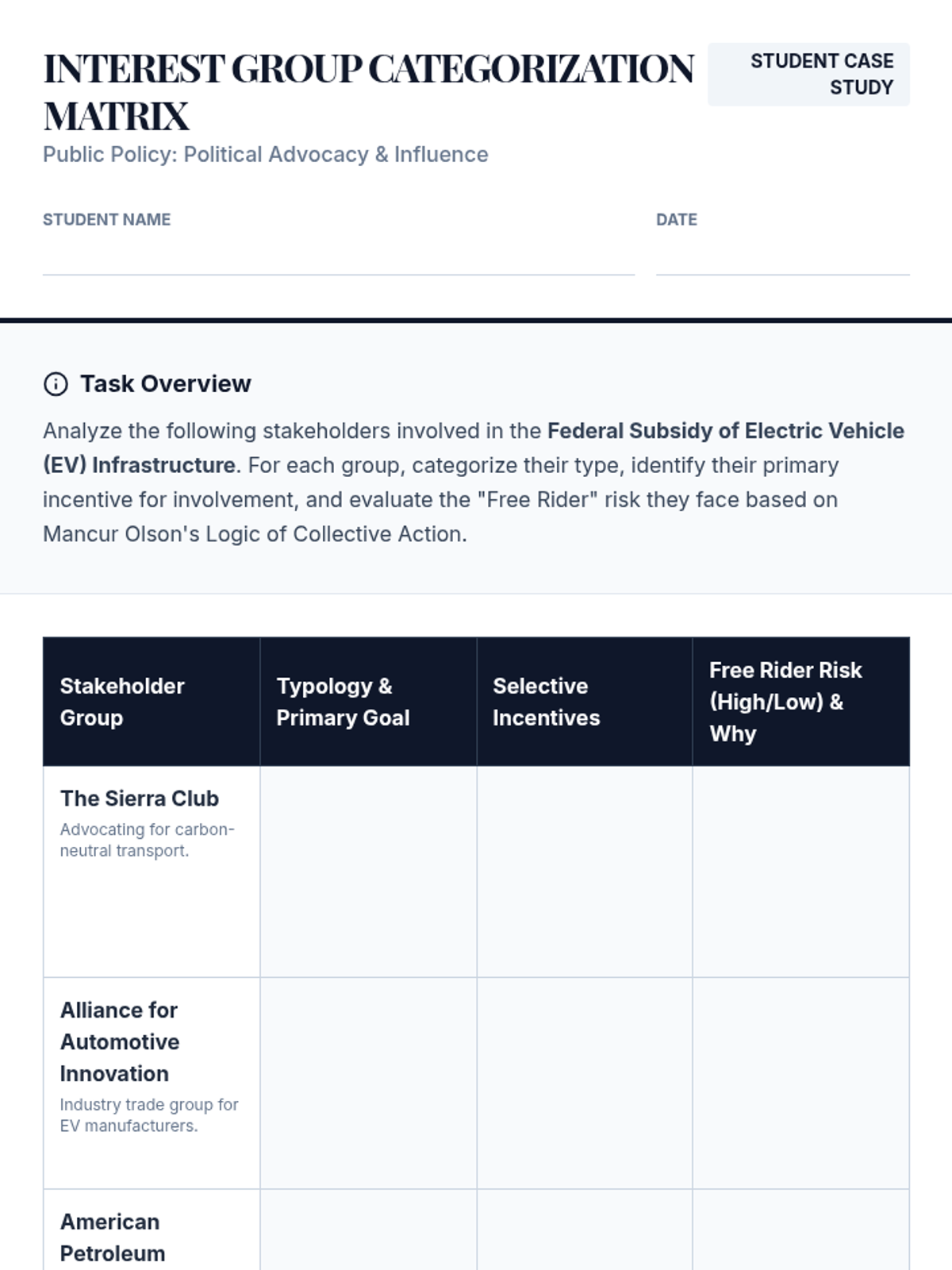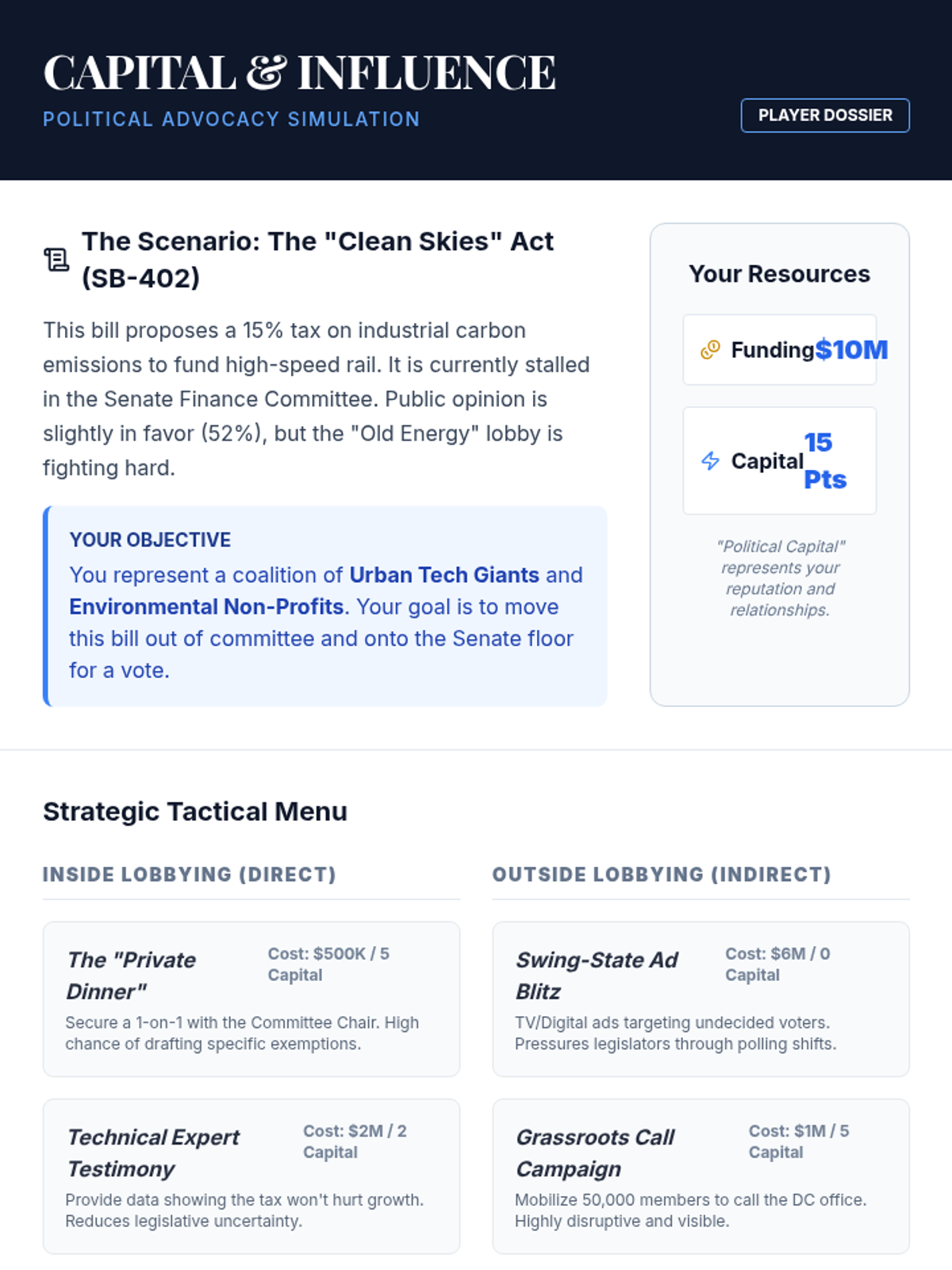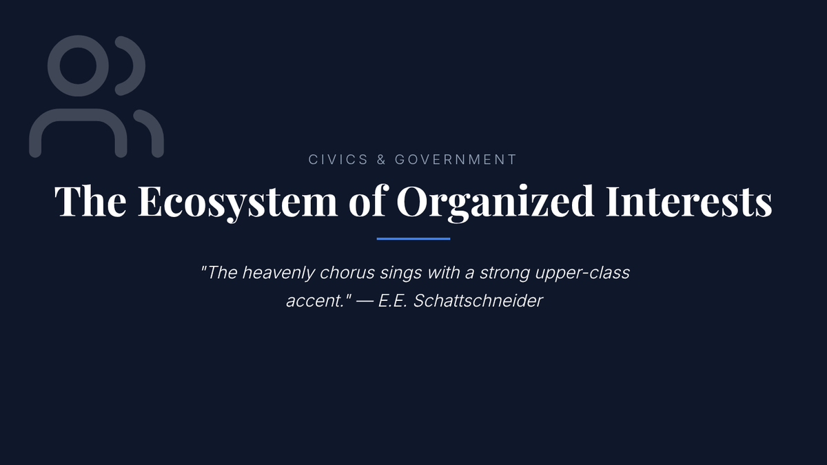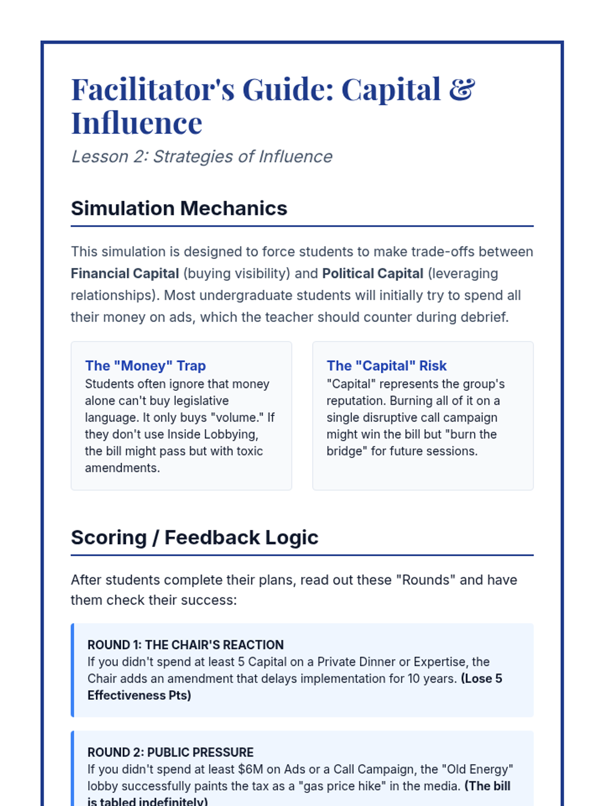 A comprehensive exploration of the external forces shaping public policy, focusing on interest groups, lobbying tactics, campaign finance, and the complex networks of influence that operate within and around government institutions. Designed for undergraduate students, the sequence moves from theoretical foundations of collective action to the practical design of advocacy strategies.